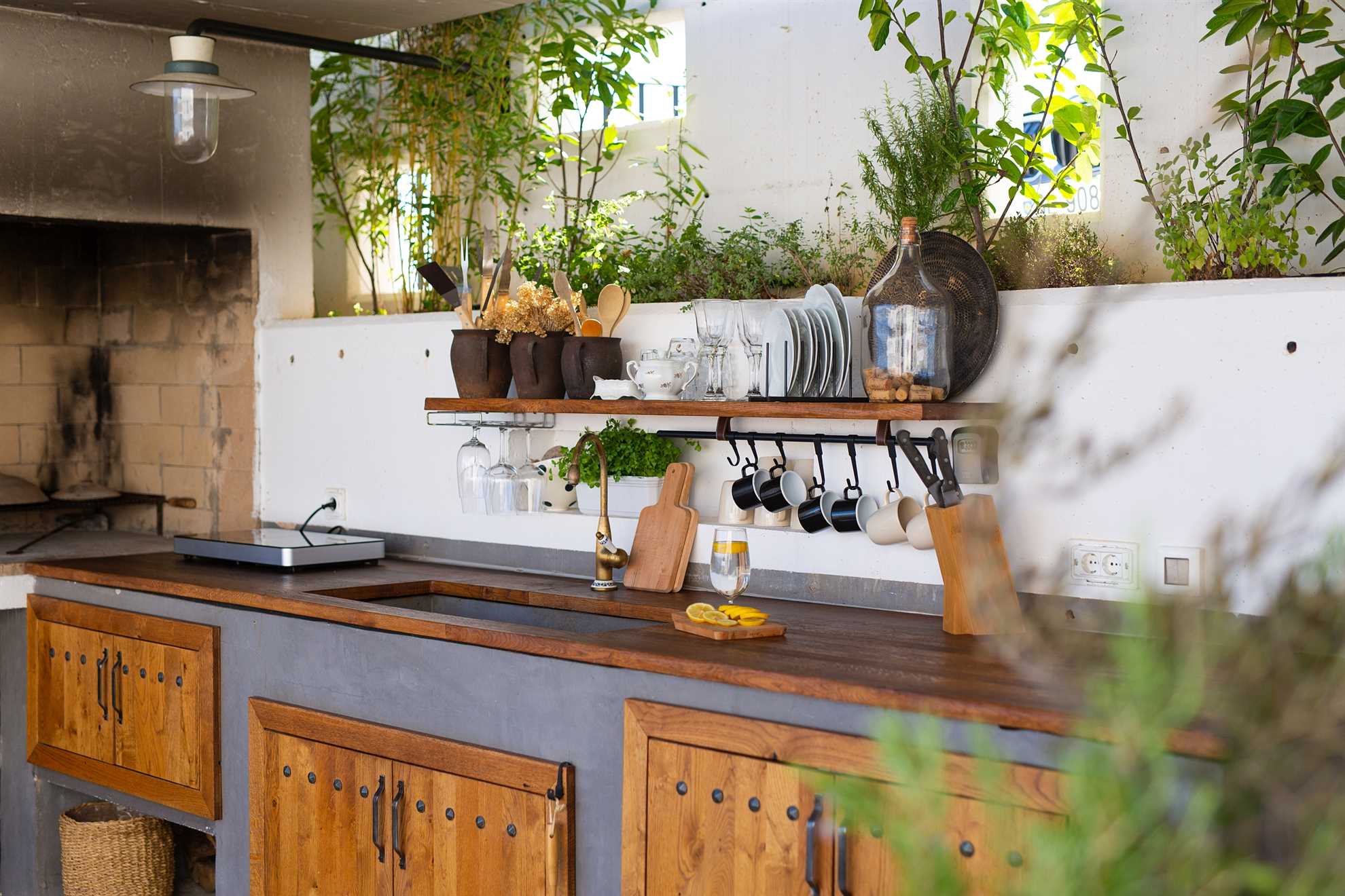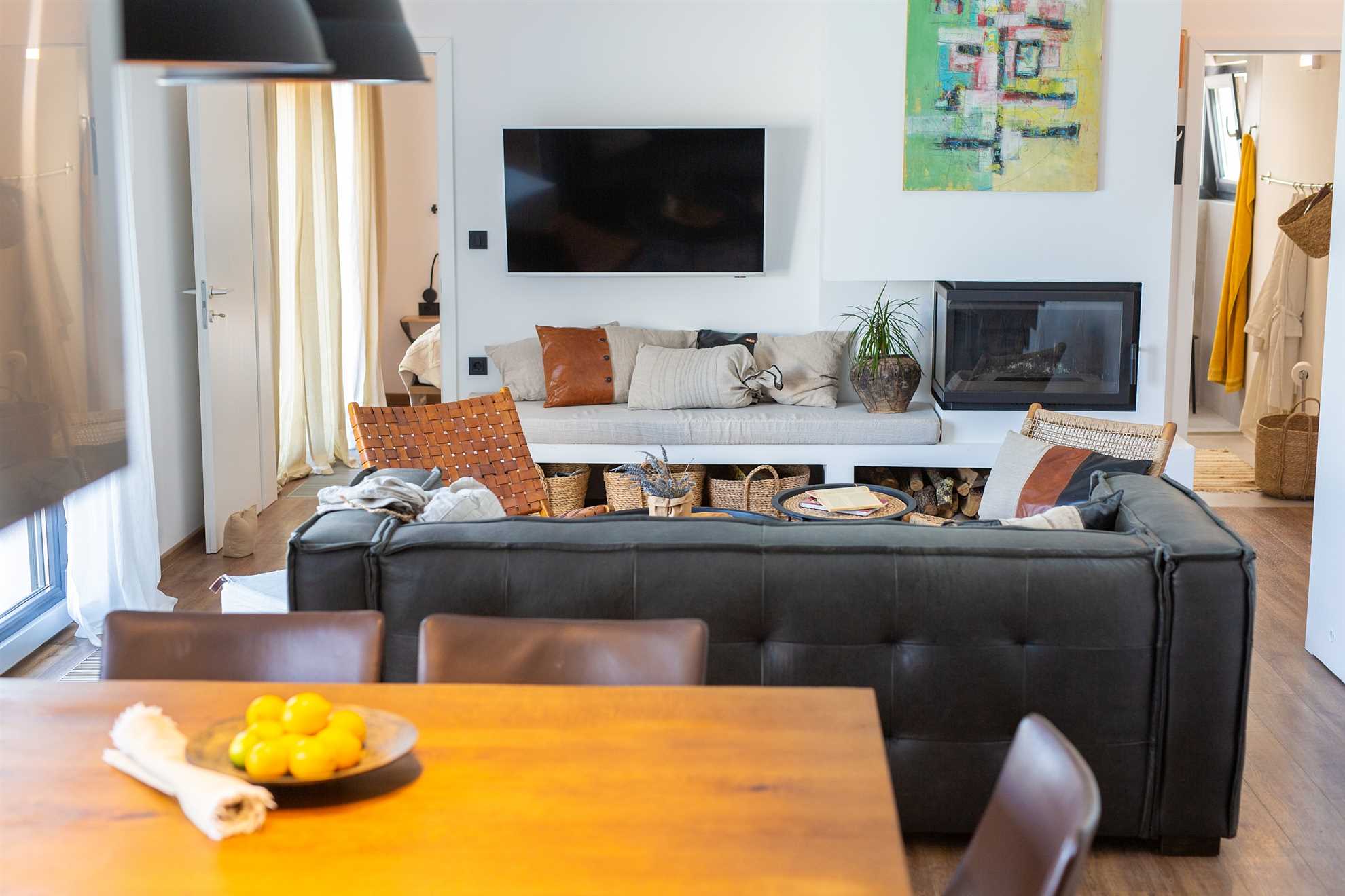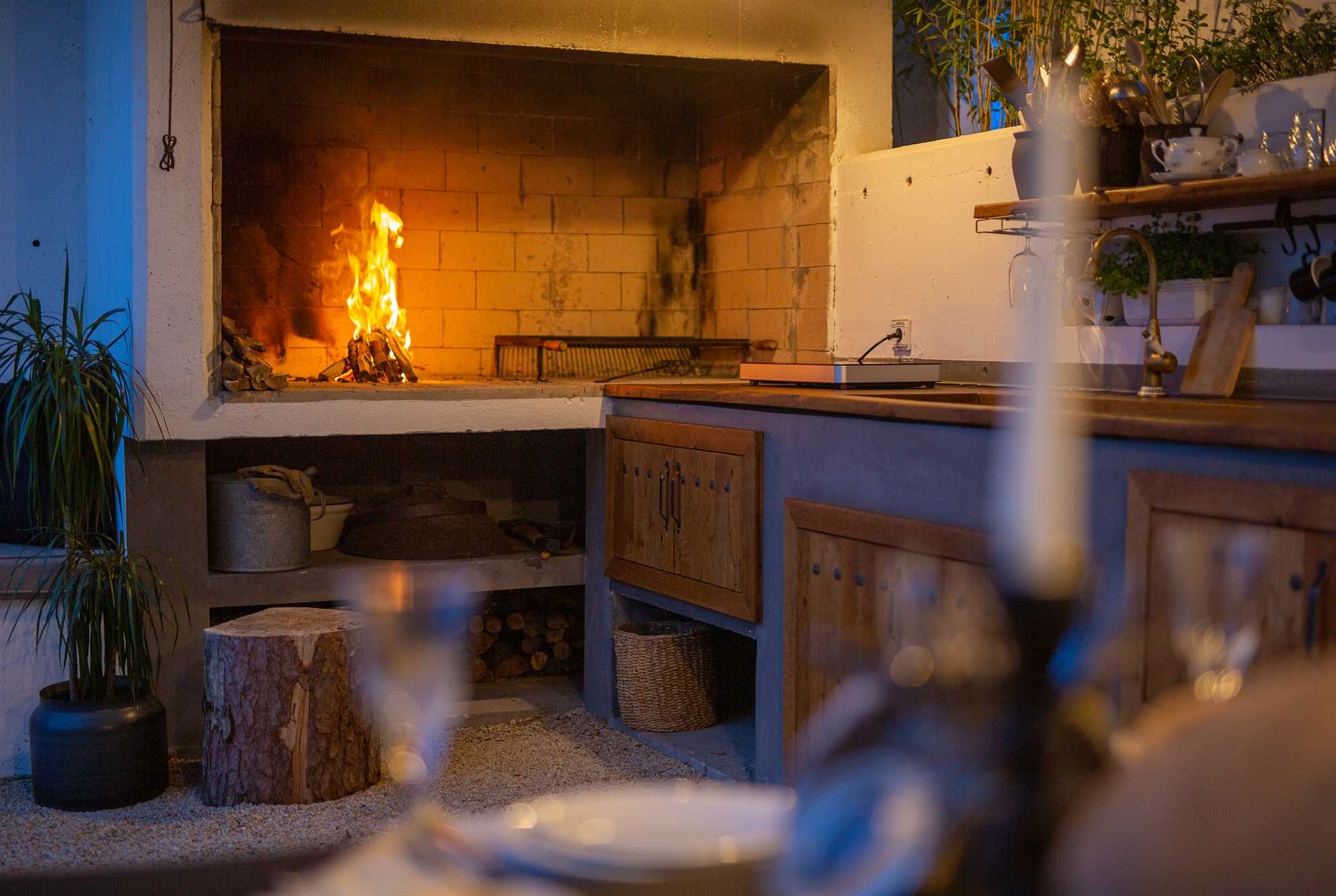 The covered outdoor kitchen offers the perfect comfort of a true functional kitchen, while a huge wooden oak table, a former "hoblpank" hosts all of you with relaxed and positive energy, recumbent on the soft cushions around it. Socialising is thus mixed with the cooking creativity of individuals and the hedonistic casualness of the eaters. This pleasant outdoor corner overlooking the sea and yoga space gives you a lot of inspiration and fills you with energy.