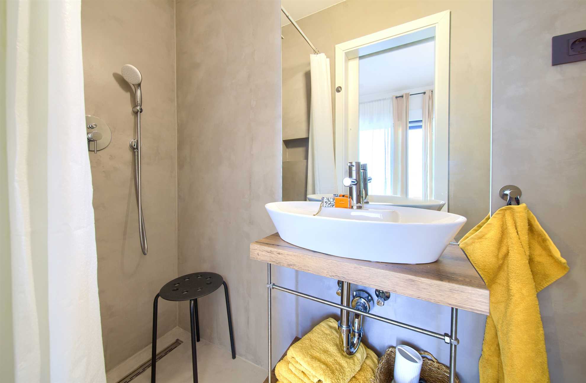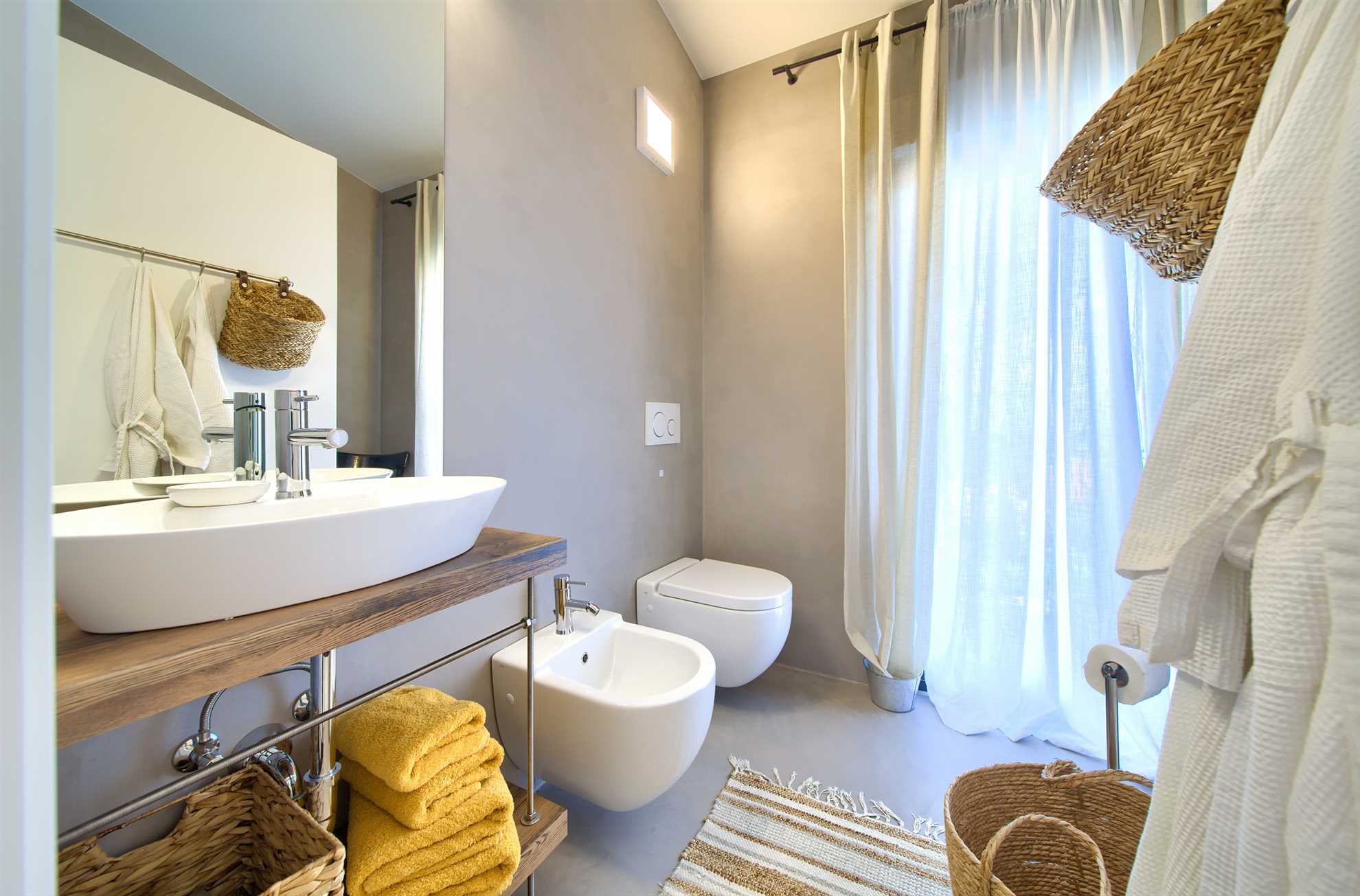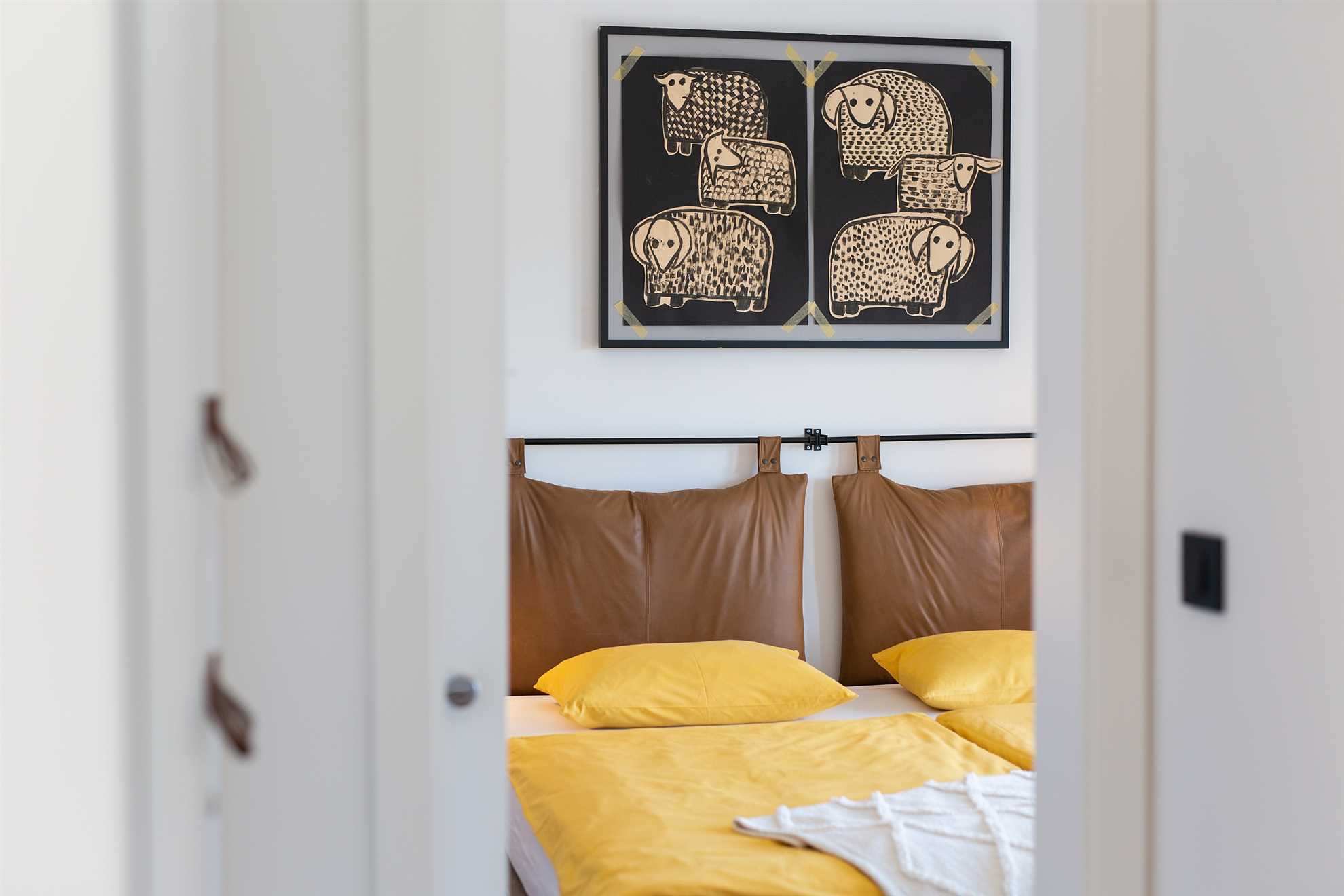 On the ground floor there is a bedroom, bathroom and a common living area with a kitchen and dining area. Traditionally darker and natural colors flow throughout the house and give a sense of familiarity, life and warmth, but in a modern, aesthetic and functional way. In decorating we used natural materials and with the help of craftsmen and fashion designers we produced unique furniture, clean line cushions and various accessories with which all rooms are equipped. There are three more rooms and two bathrooms on the top floor. Every room is a story for itself, be it with a painting or an interior design. From each room there is an open view of the sea and an exit to a covered balcony, where you can comfortably rest in a hammock to witness the magical sunrise.