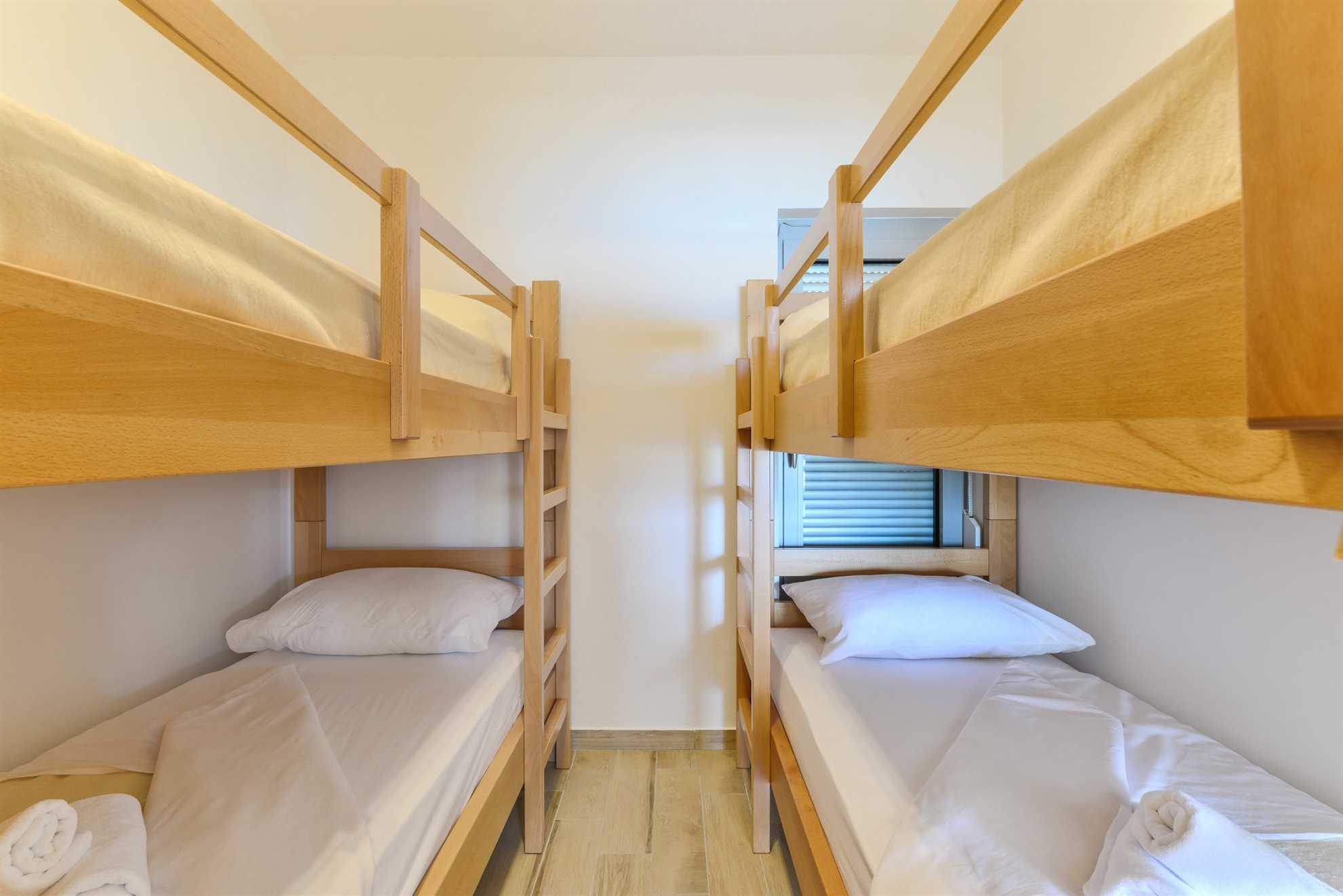 One bedroom has 1 double bed, the other 2 bunk beds. The sleeping rooms are cooled by the shared air conditioning unit located in the living room.