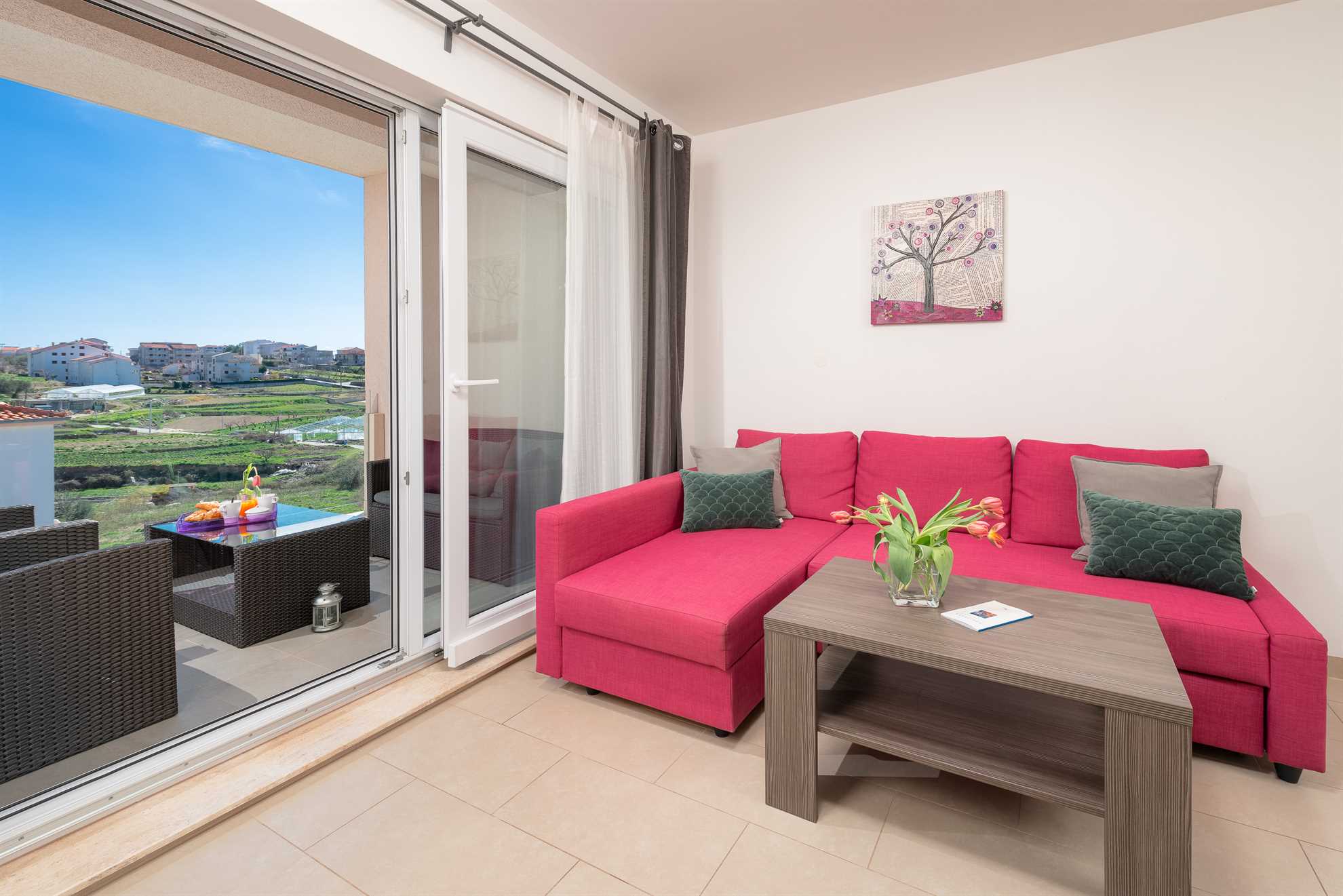 Apartment has terrace with table and seats for 4 persons. There you can enjoy in beautiful garden and pool view as terrace has open view thru safety glass while having meal or drink...