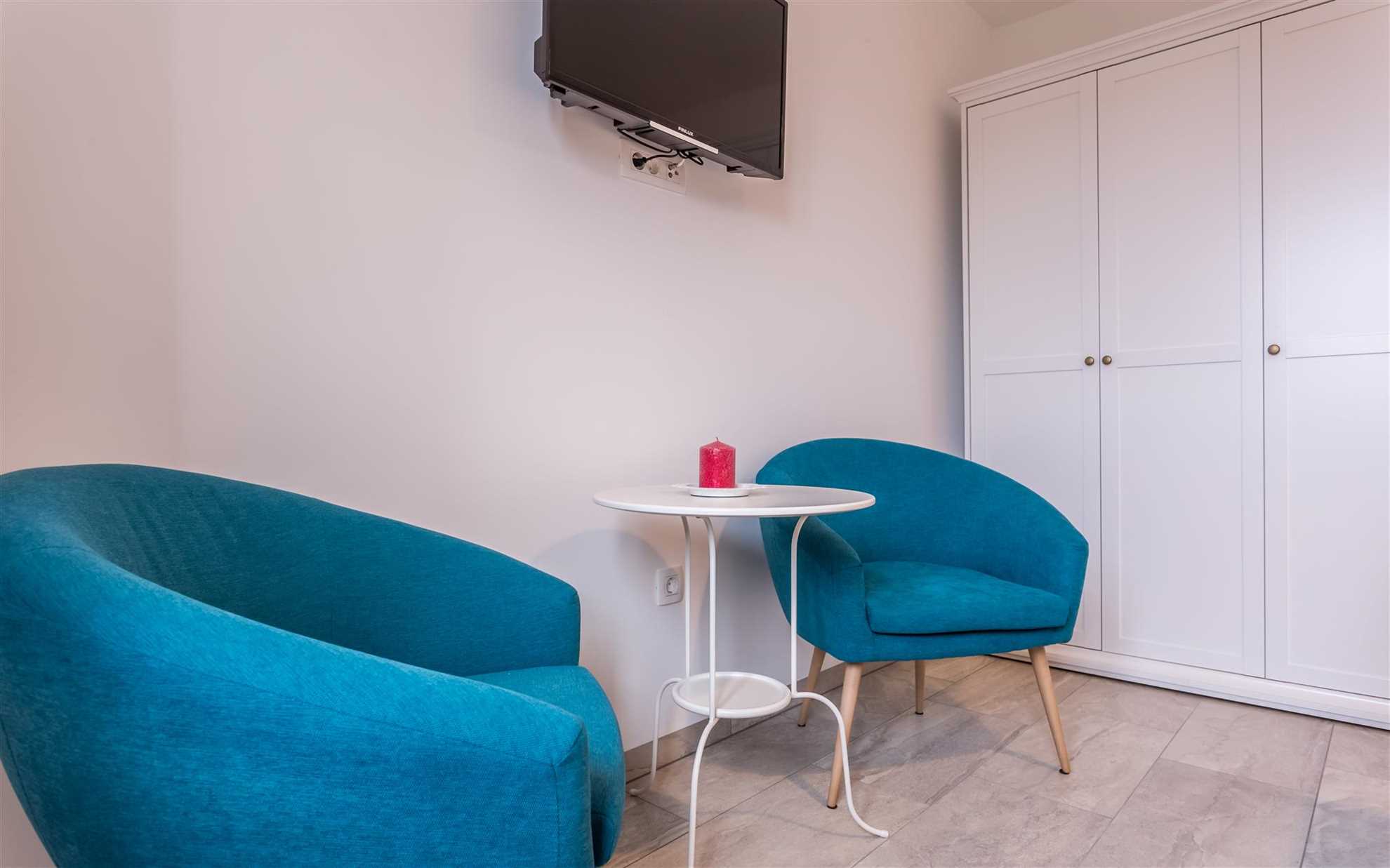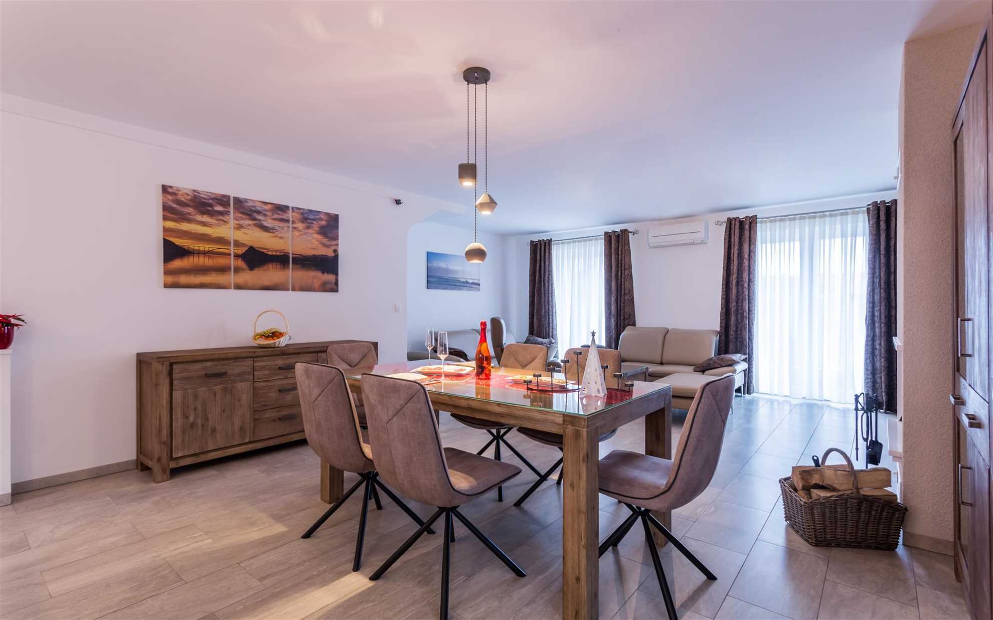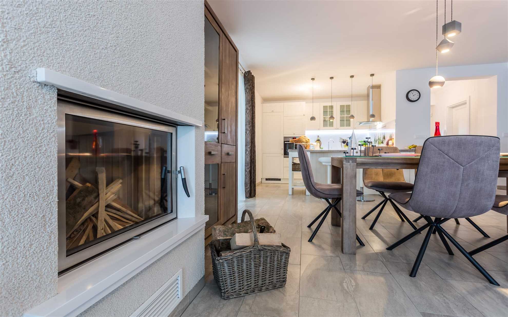 The interior is spacious and bright. On the ground floor, there is an open-plan living area with a kitchen, dining room, and living room seamlessly connected. The living room is furnished with a comfortable leather sofa and armchair, where you can relax while watching the 55-inch smart TV with satellite programs and wireless connection. In the evening, the warmth of the romantic fireplace will add a cozy touch. The dining area comfortably seats six, and the kitchen is fully equipped with all the essentials, including modern appliances and kitchenware. There is also a WC with a washing machine on this level.