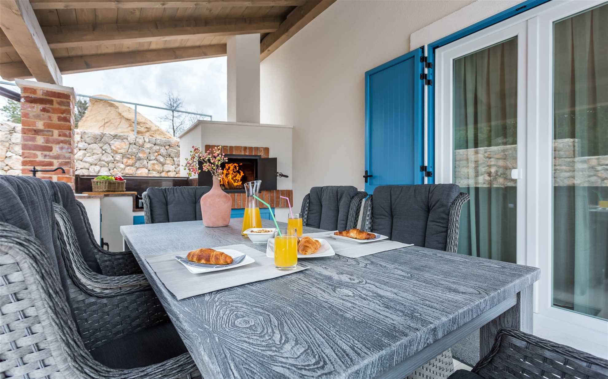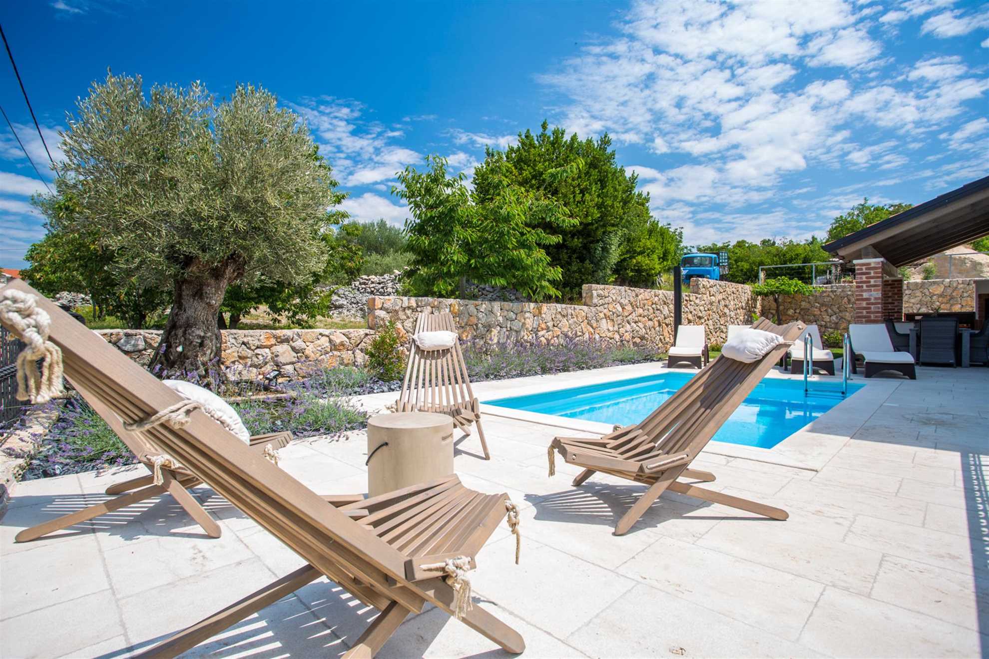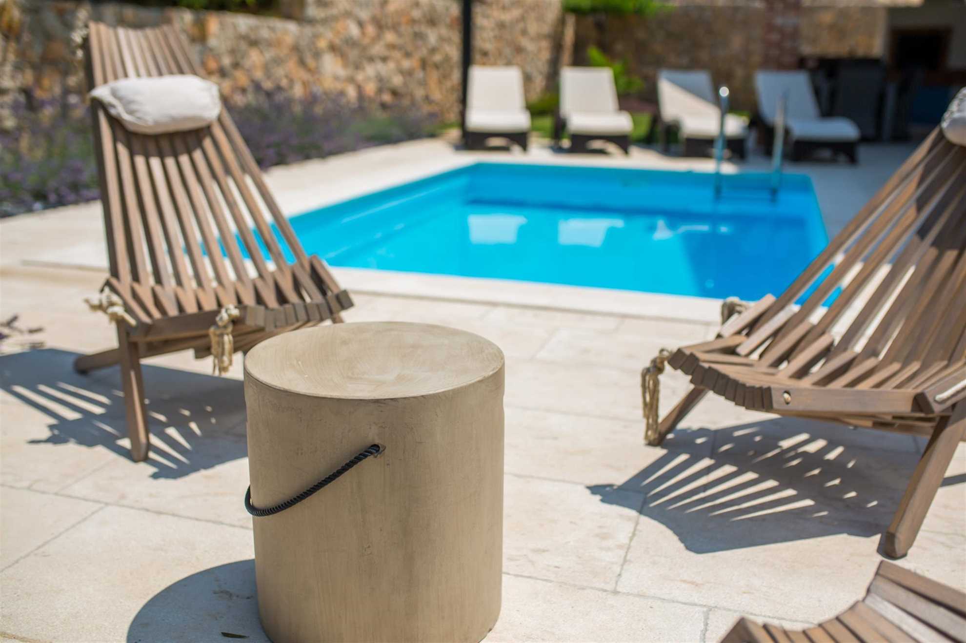 The villa’s exterior is designed for relaxation and enjoyment in nature. There is a large pool surrounded by six sun loungers where you can sunbathe or cool off in the water. The covered terrace features a comfortable seating area for six and a summer kitchen, the perfect place for dining and socializing. The summer kitchen is equipped with a grill and a traditional bread oven, allowing you to prepare delicious meals or bake pizzas, adding an authentic Mediterranean touch to your stay.