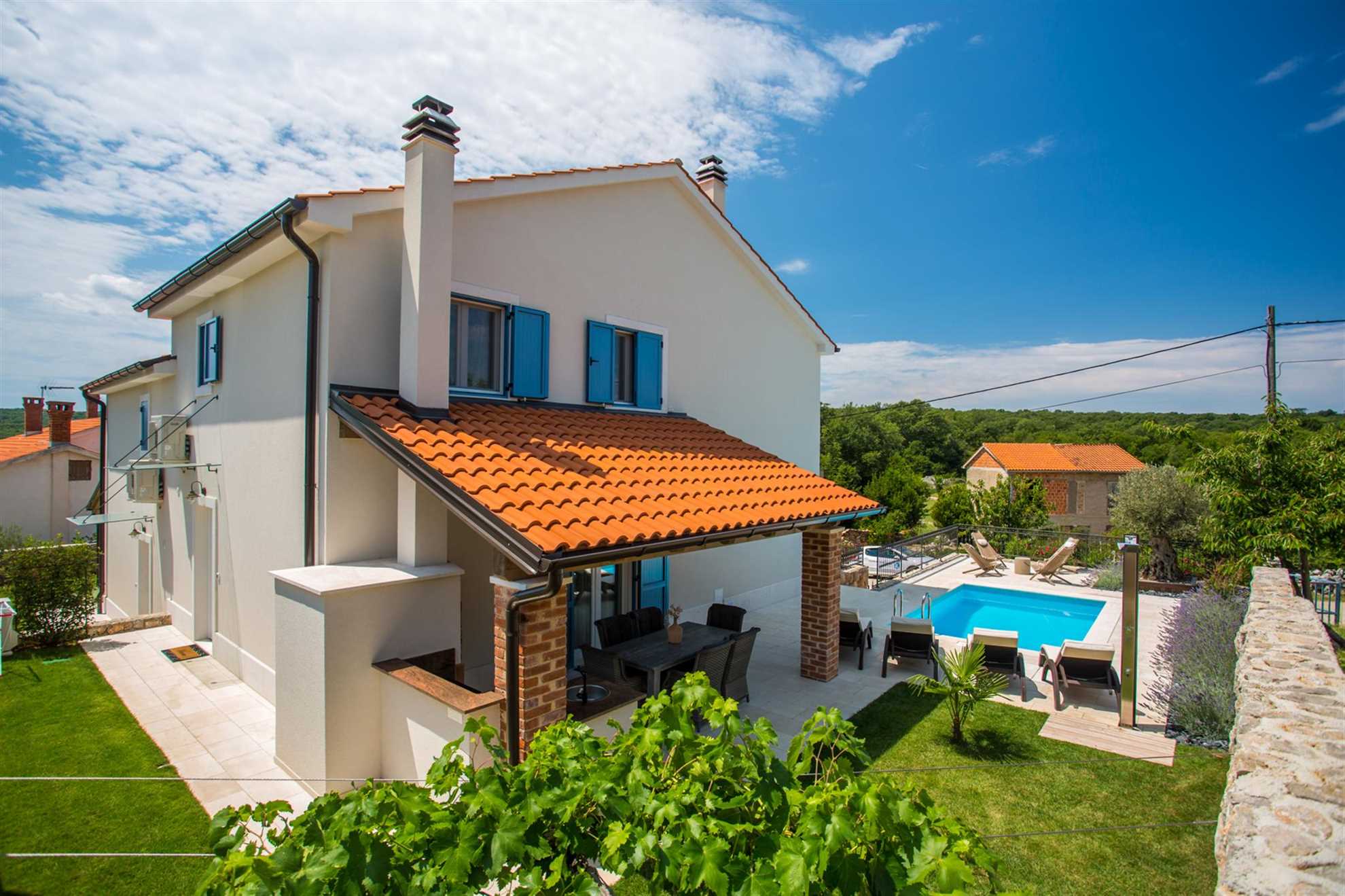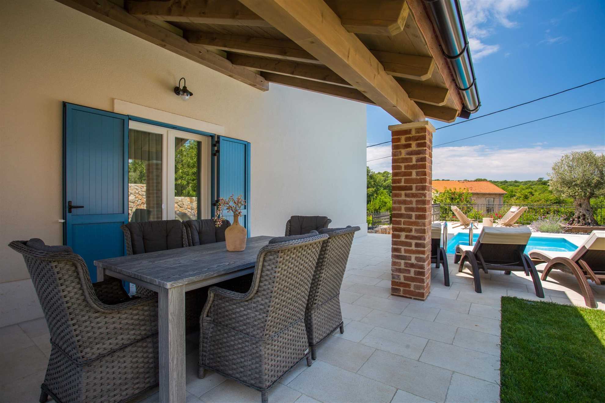 Villa Tana is a charming holiday villa located in the small, traditional village of Sužan on the island of Krk, offering a perfect blend of Mediterranean charm and modern comfort. Despite being a semi-detached house, it ensures complete privacy, allowing you to enjoy the peace and tranquility of this picturesque location. The villa covers 140 m² over two floors, while the outdoor area spans 500 m².