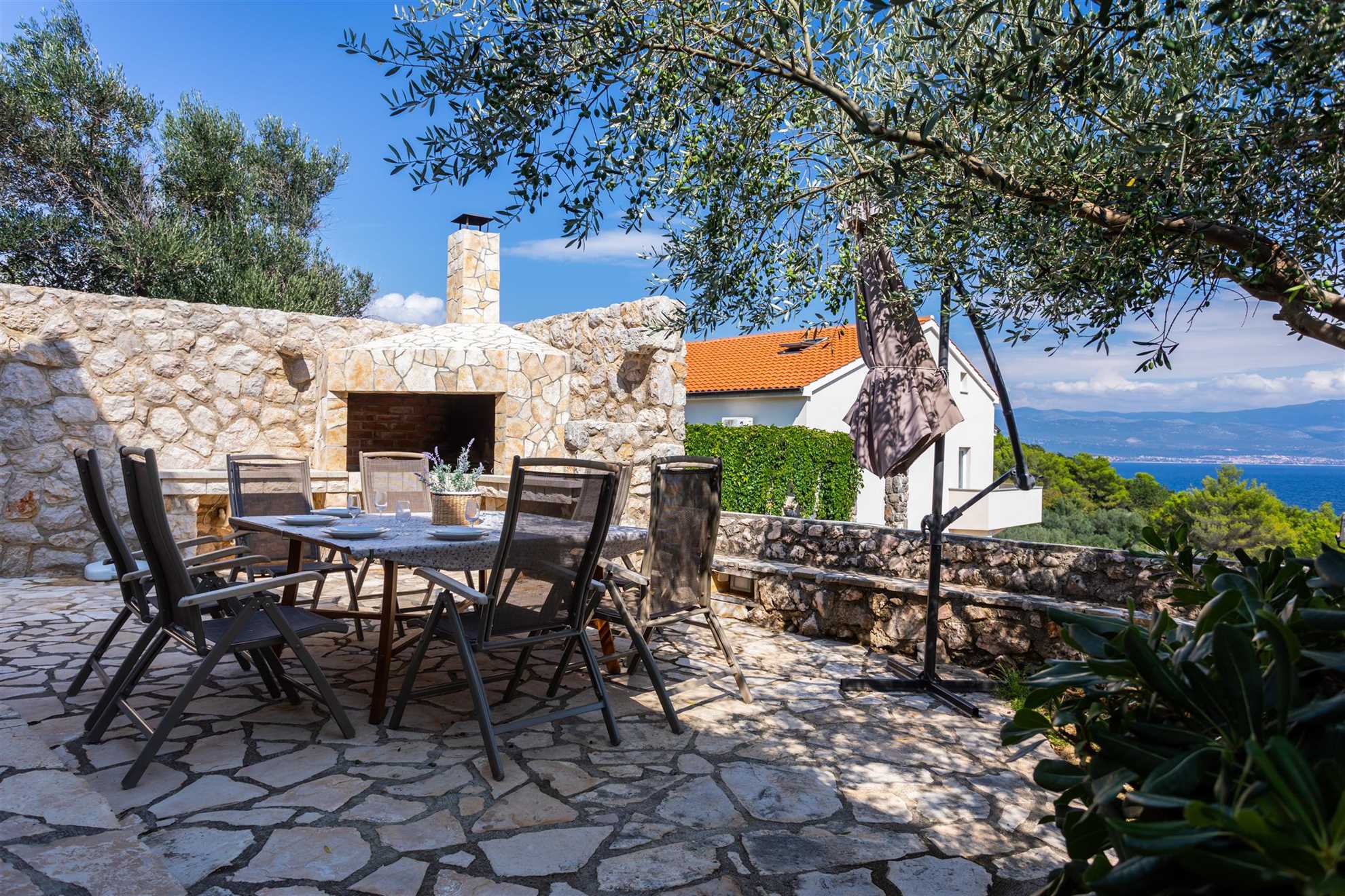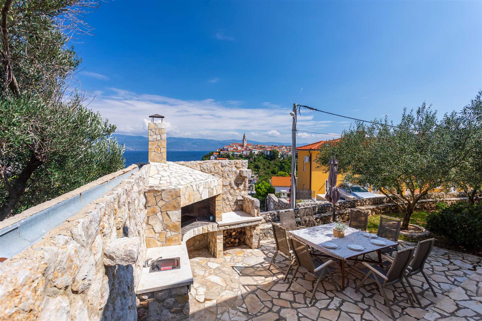 For sun lovers, there are comfortable sun loungers, a large umbrella for shade, and a covered balcony furnished with a dining table and chairs for outdoor meals. The stone-built fireplace adds a rustic touch and is perfect for grilling local seafood or preparing various Mediterranean specialties. The terrace is not only a place for dining but also a perfect setting for evening relaxation, with views that stretch over the lights of Vrbnik as the sun sets.