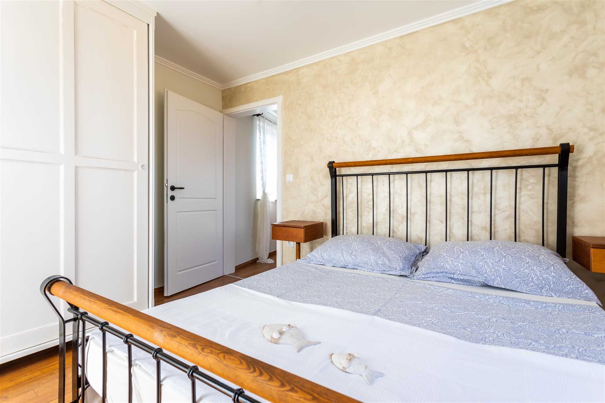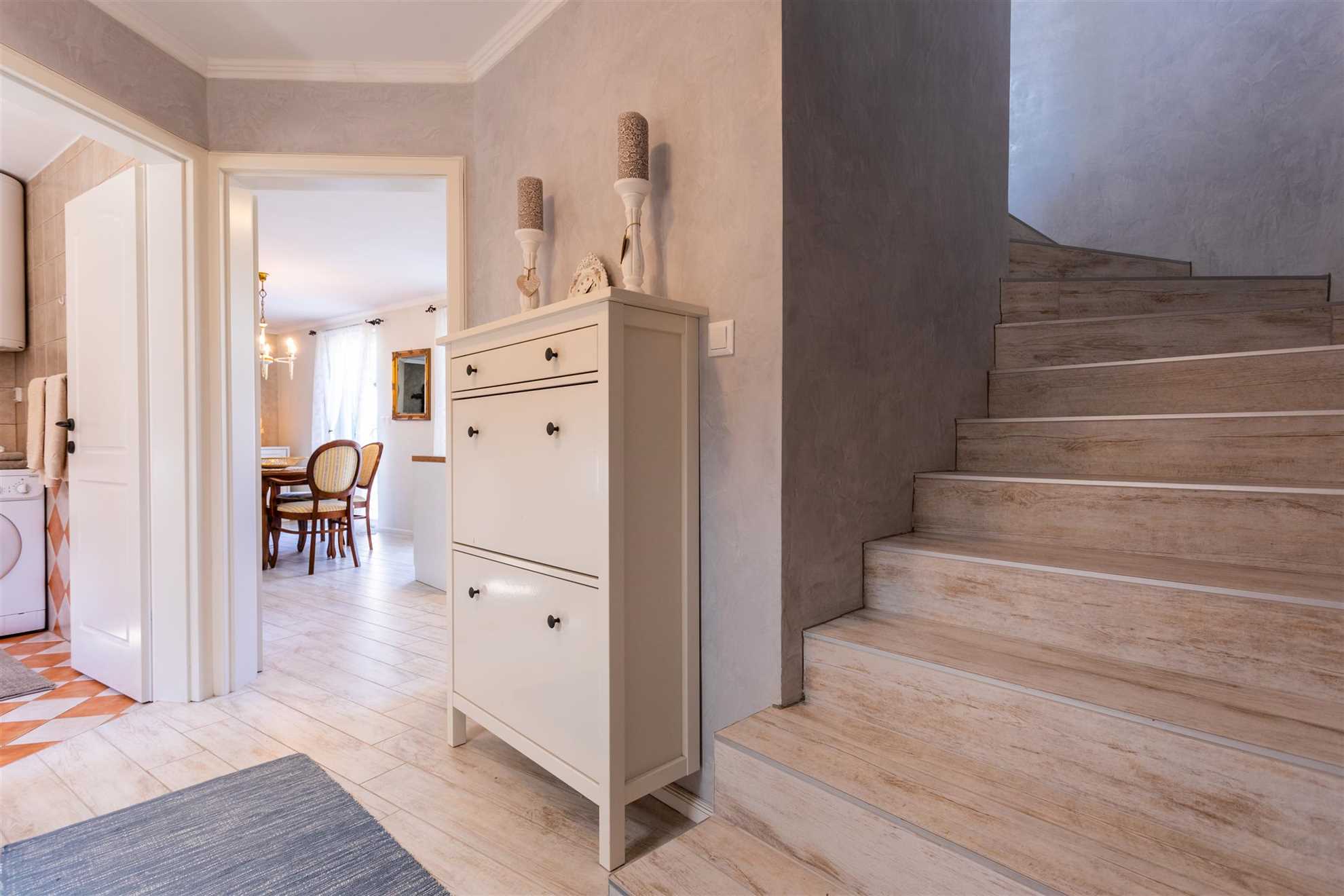 The ground floor of Villa Pinia features an open-plan living area that includes a fully equipped kitchen, dining space, and a cozy living room, as well as a bathroom and a bedroom. The kitchen is stocked with everything you need, from cookware, dishes, and utensils to modern appliances such as a dishwasher, coffee machine, electric cooktop, refrigerator with freezer, toaster, and electric kettle. The living space flows seamlessly, providing a welcoming atmosphere for guests to enjoy meals together or unwind in front of the TV. The villa is equipped with air conditioning for the summer months and heating for cooler days, along with Wi-Fi, satellite television, and a washing machine for added convenience. For families with young children, a baby cot can be arranged upon request.