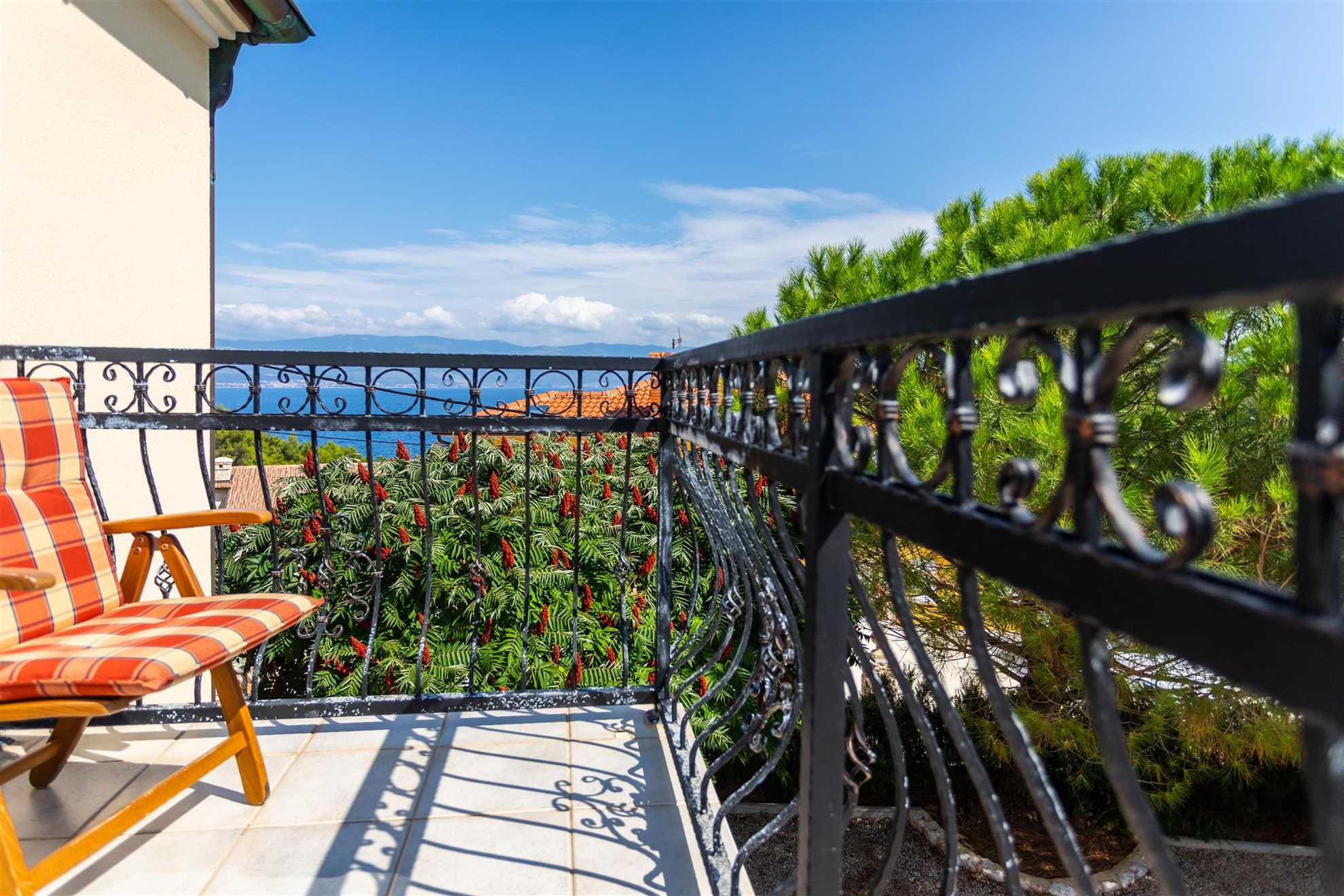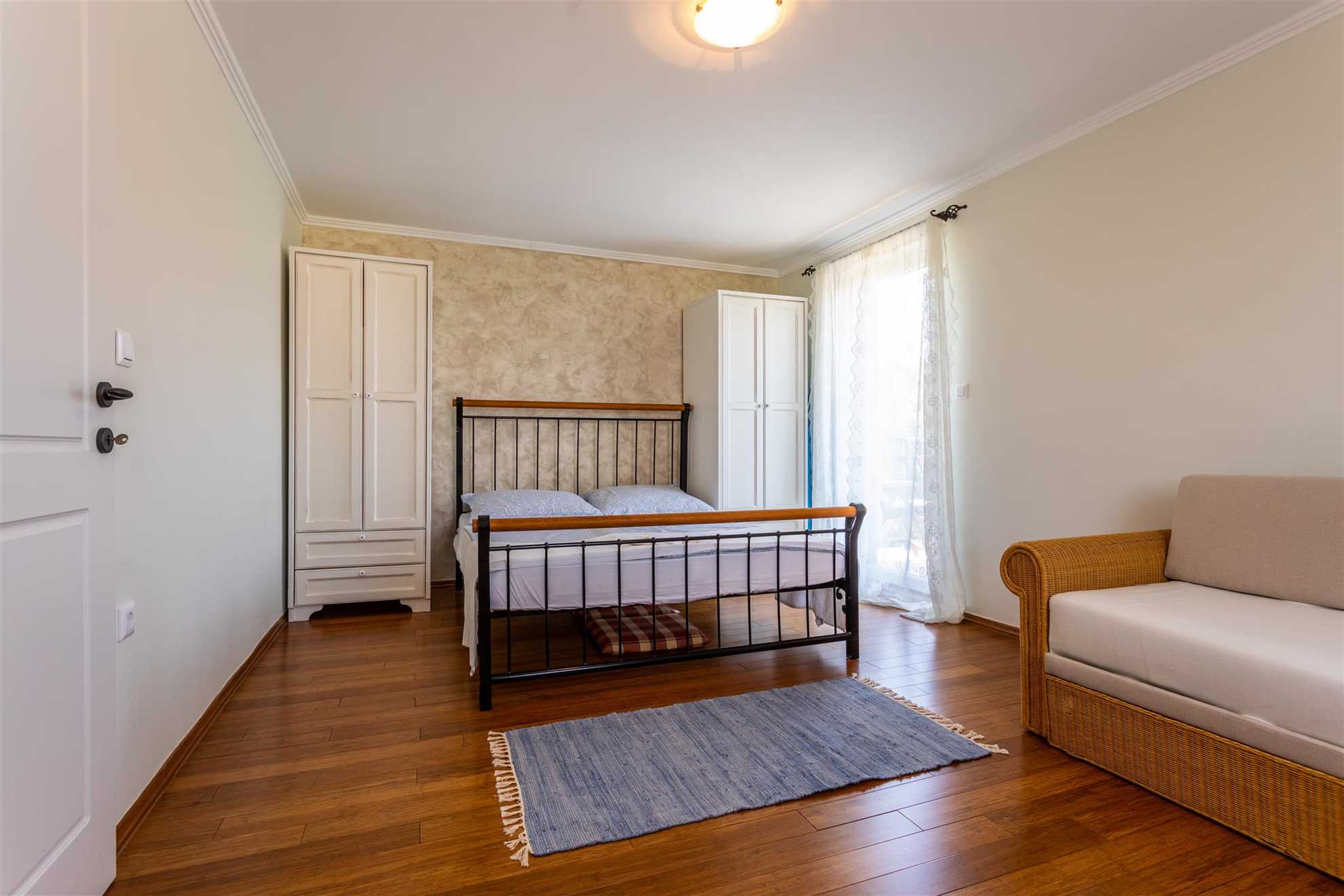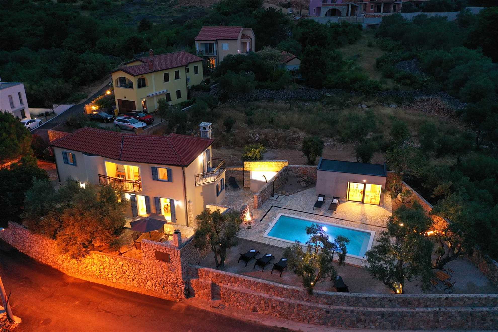Upstairs, the first floor houses two more bedrooms and a bathroom. Each bedroom has direct access to a balcony where you can soak in the breathtaking sunsets over Vrbnik. The balconies provide a perfect spot to start the day with a morning coffee or end it with a glass of local wine while admiring the view. The layout of the villa is designed to maximize comfort and privacy, making it suitable for families or groups of friends. In total, the main villa accommodates six guests across its three bedrooms.