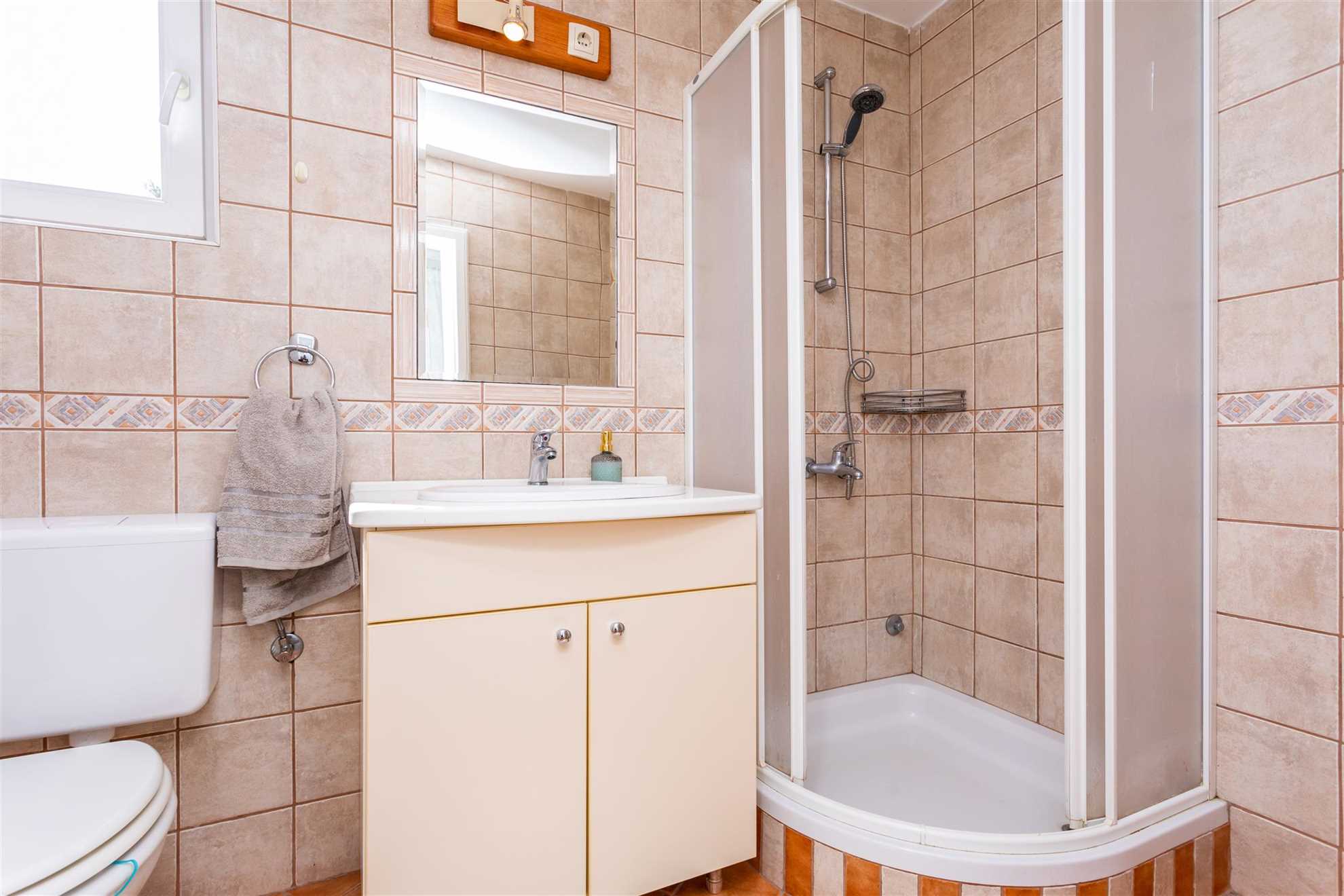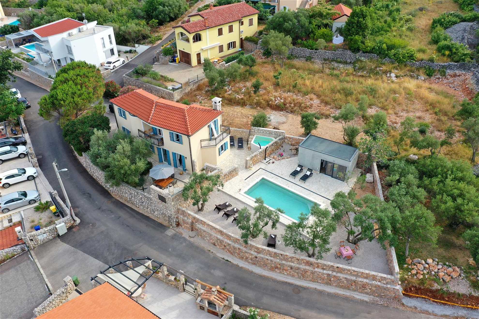 The outdoor area is designed for ultimate relaxation and enjoyment. Villa Pinia is fully enclosed, offering a private and secure environment for guests. The beautifully landscaped Mediterranean garden adds to the ambiance, featuring lush greenery and fragrant herbs. The spacious terrace overlooks the town of Vrbnik and offers a variety of seating areas for dining al fresco or simply lounging in the sun. The heated pool is perfect for a refreshing dip, whether in the warmth of summer or during the cooler months, while the nearby outdoor shower and additional WC provide added convenience.