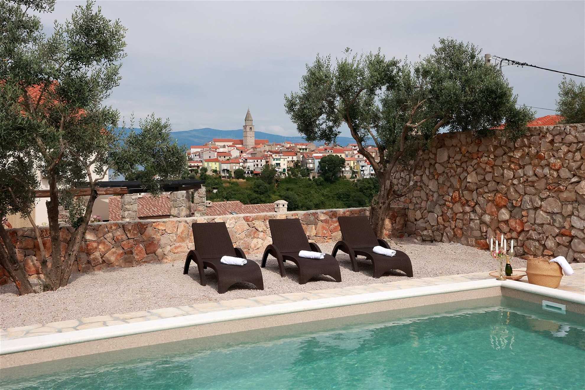 Villa Pinia is located in Vrbnik, a charming historic village on the east coast of the island of Krk, Croatia. Perched on a cliff 50 meters above the Adriatic Sea, Vrbnik is one of the oldest villages on the island, offering a rich cultural and artistic atmosphere. Its narrow medieval streets, stunning views, and connection to nature make it a perfect destination for artists, photographers, and writers seeking inspiration. The town is also famous for its indigenous Žlahtina wine, produced in the nearby Vrbnik valley. Vrbnik’s Glagolitic heritage further enriches its unique character and timeless charm.