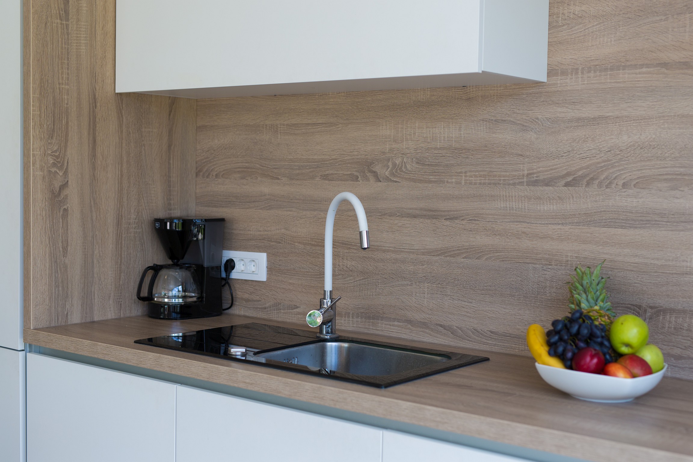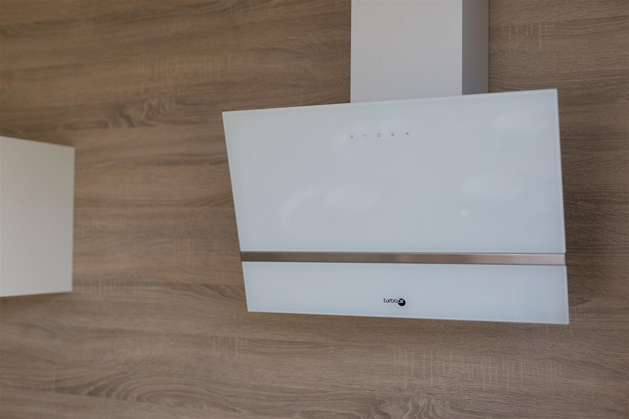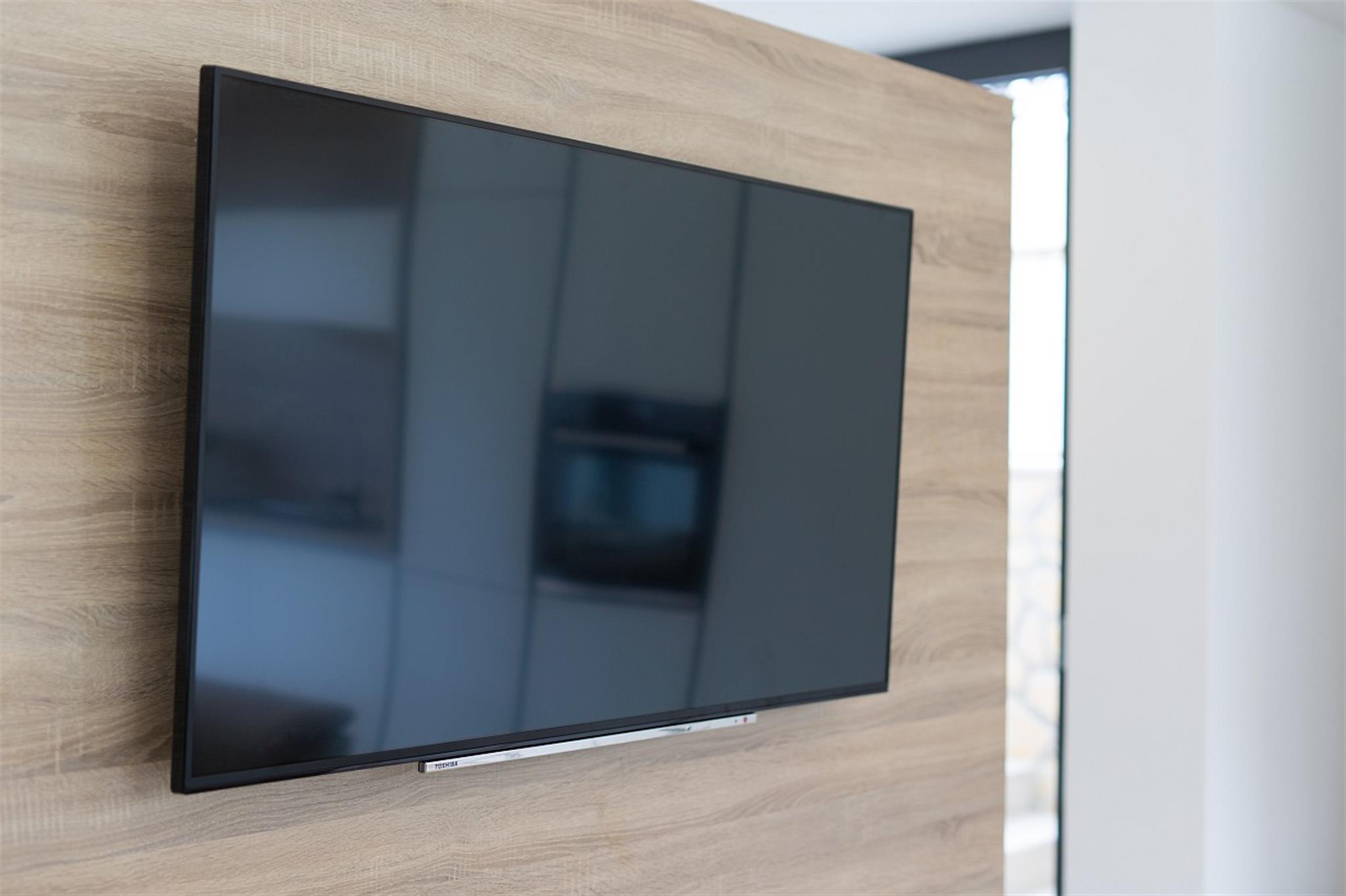 The first-floor apartment spans 100 m² and showcases modern design with functional living spaces. Large windows flood the interior with natural light and provide stunning views of the balcony and sea. The living room is furnished with a stylish leather sofa that converts into a bed for two adults. A large TV and a dining table for six complement the space. The fully equipped kitchen includes top-of-the-line appliances such as an oven, stove, refrigerator, freezer, dishwasher, kettle, coffee machine, cookware, and tableware.