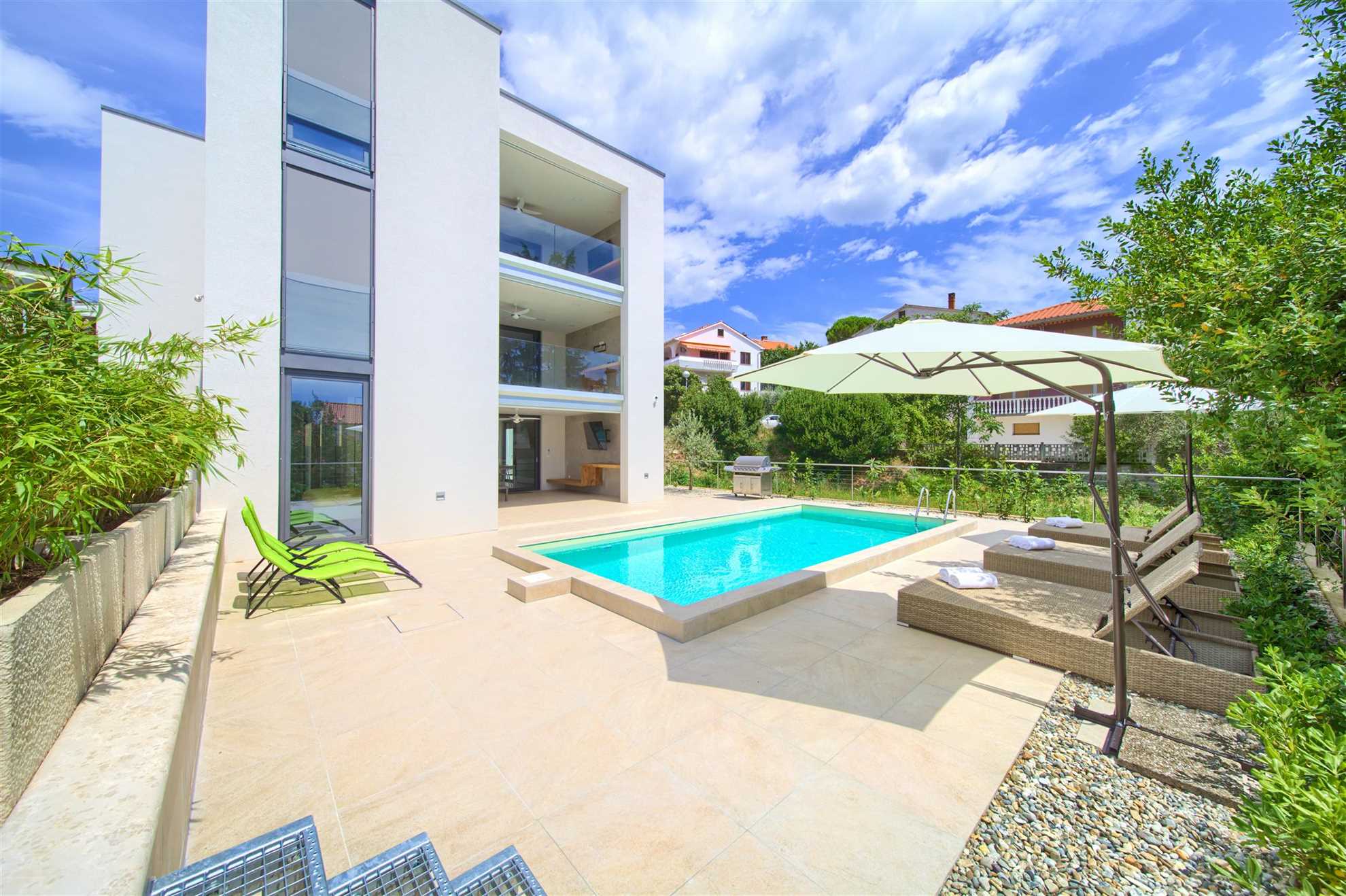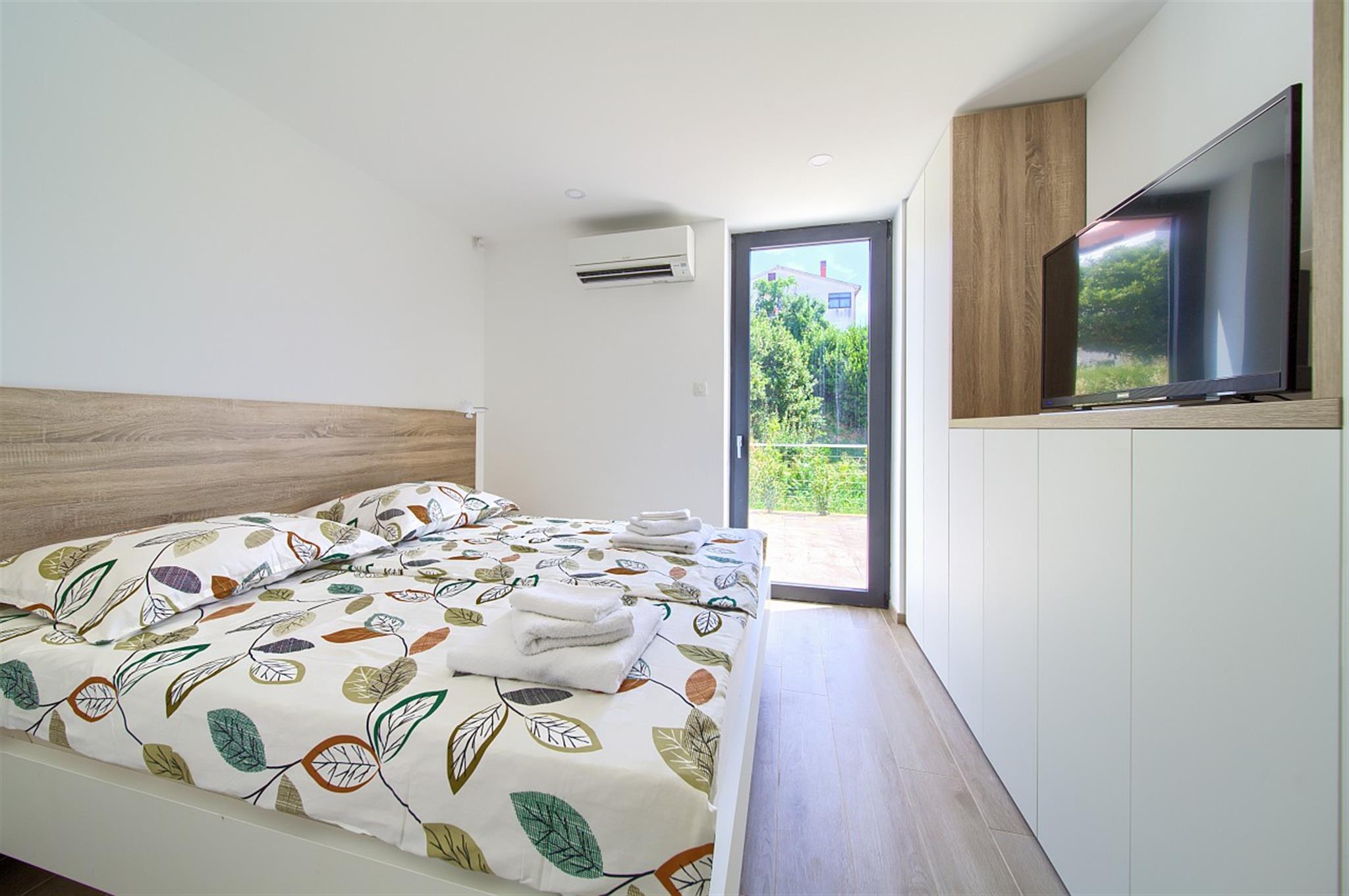 Upon arrival, you’ll be greeted by a beautifully landscaped garden with Mediterranean vegetation and a heated pool, perfect for refreshing dips on hot summer days. The poolside terrace is equipped with sun loungers, umbrellas, and a modern outdoor grill – ideal for preparing traditional Adriatic dishes. Your vehicle will be safely parked behind gates, ensuring privacy and security.