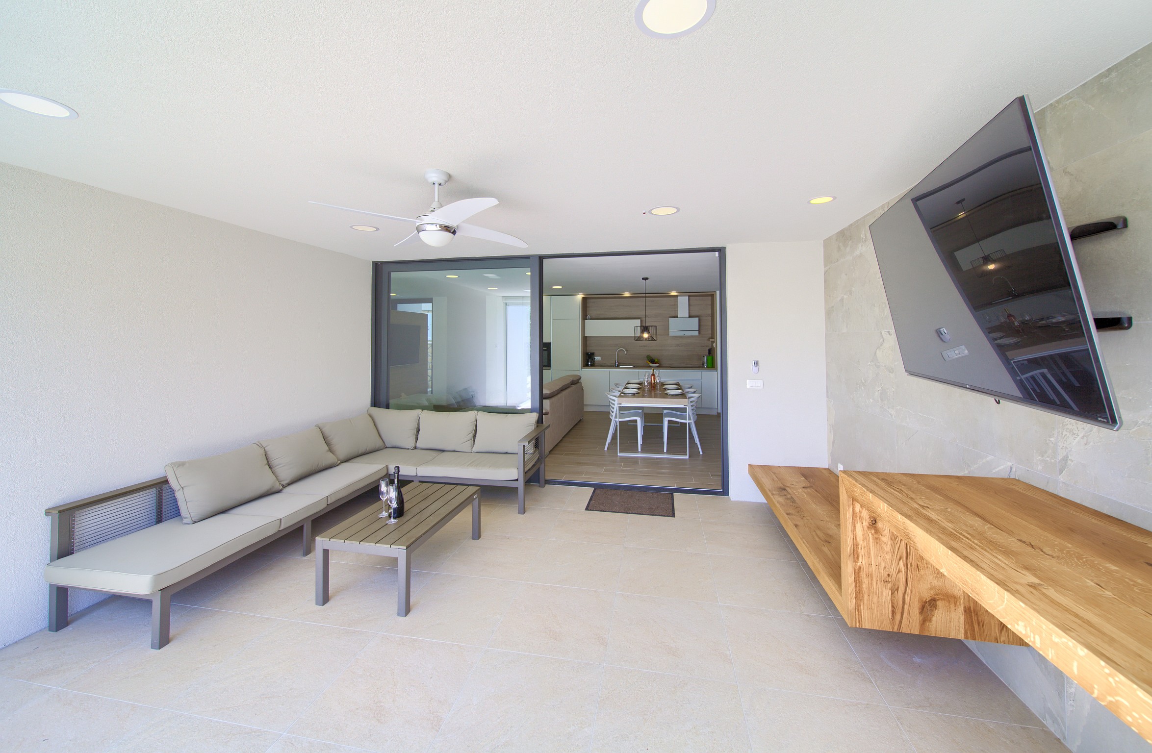The spacious terrace is the perfect spot for relaxation, offering outdoor furniture, a ceiling fan, a TV, and views of the pool. The entire apartment is air-conditioned, fitted with motorized blinds, and provides complete WiFi coverage.