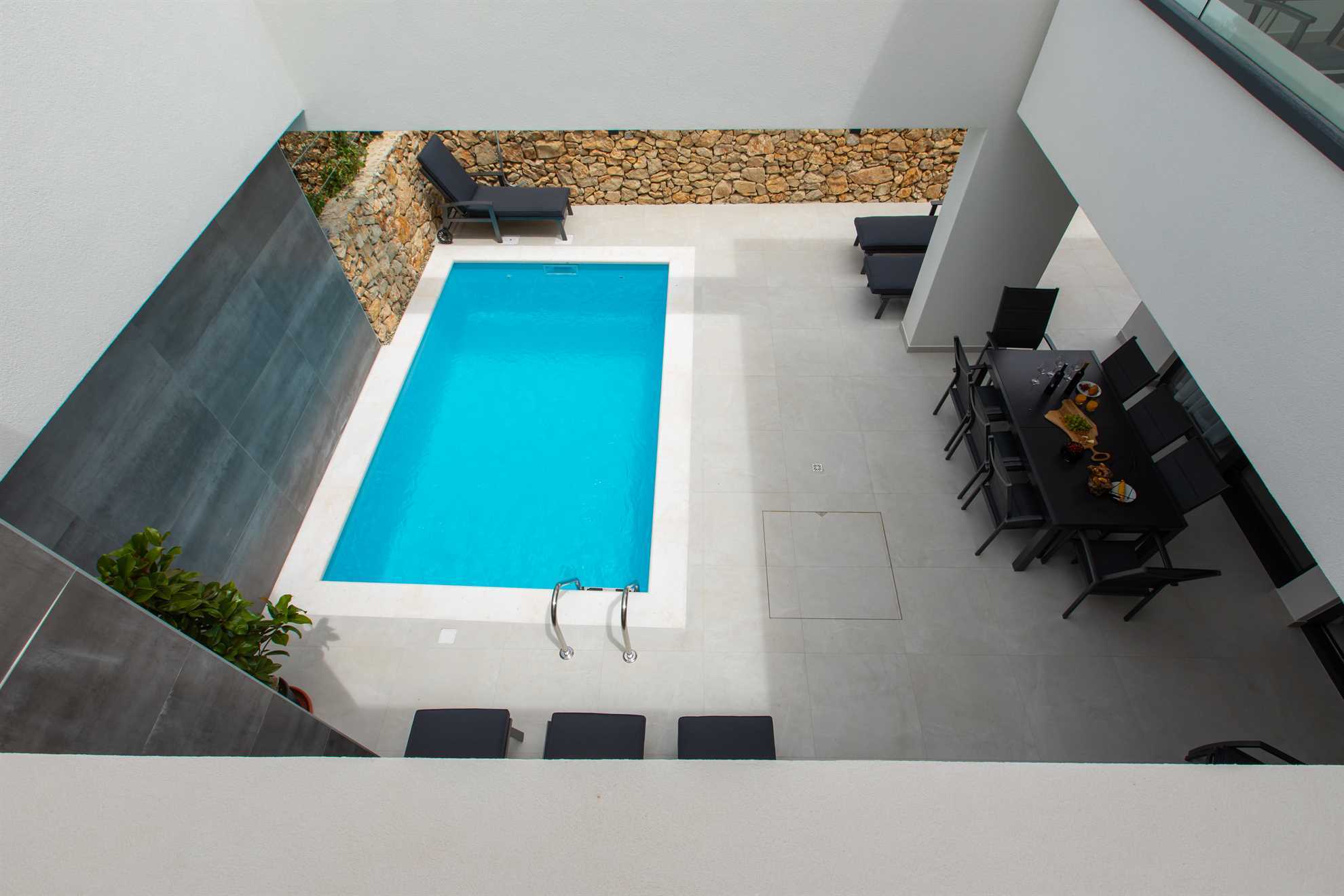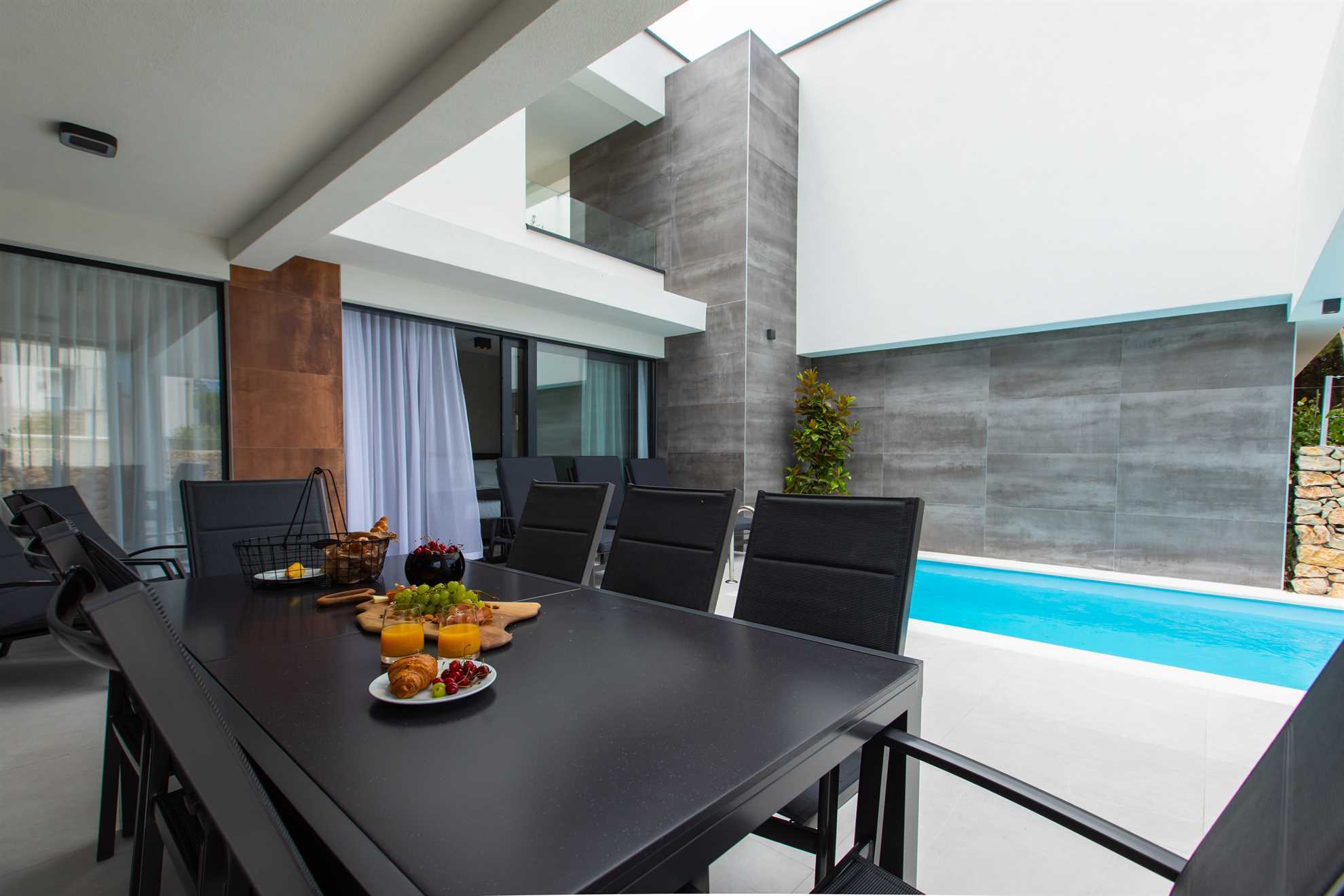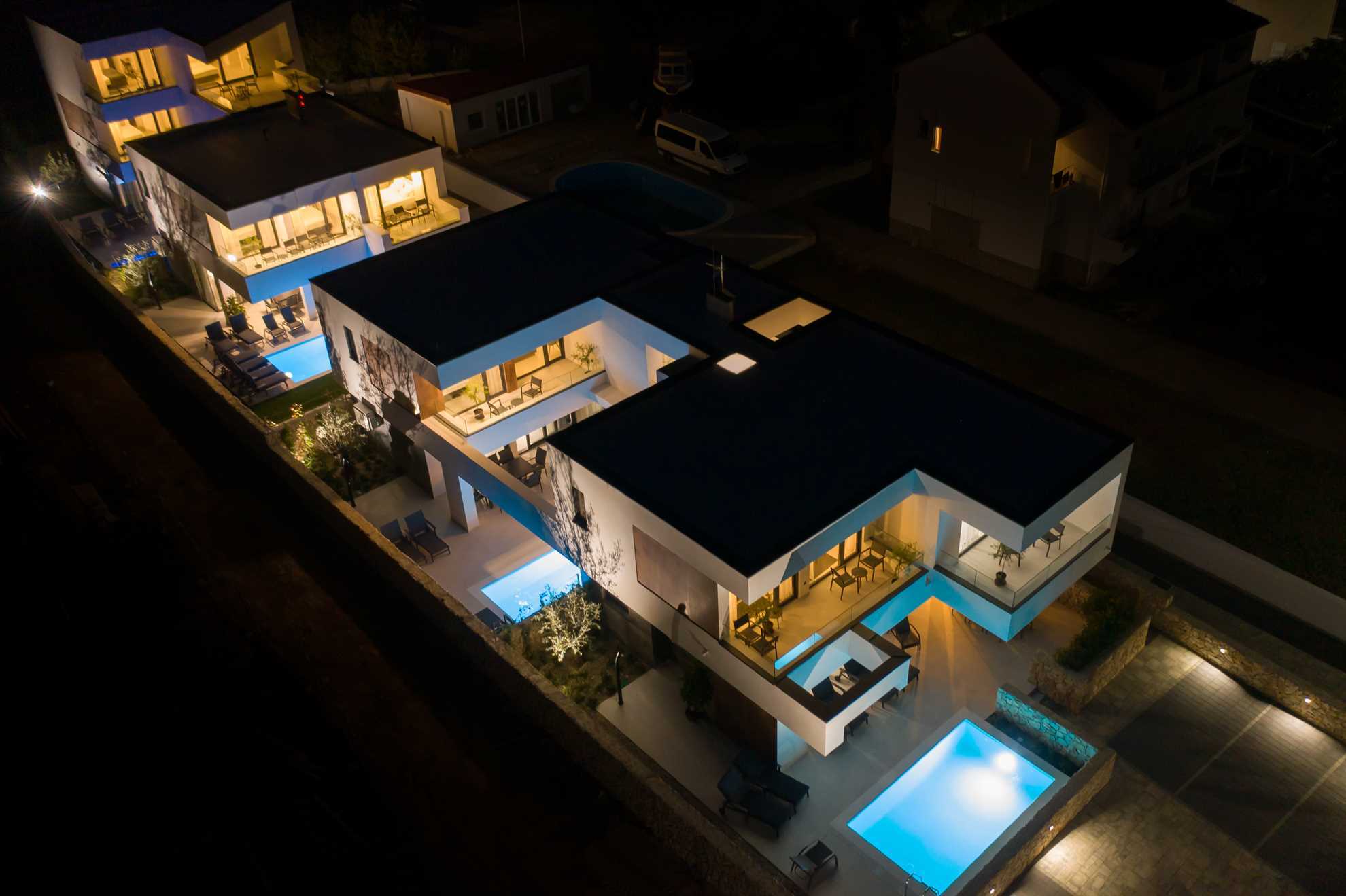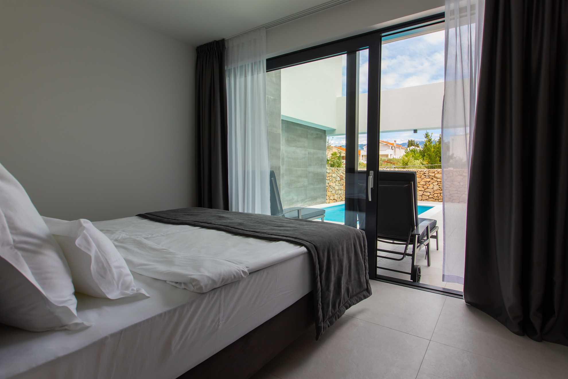 Novalja Bay Villas are new modern and sleek villas located in the center of Novalja. Exclusively furnished and fully equipped villas will make your stay comfortable and relaxing. Each villa has a private pool which makes warm summer days even more enjoyable. Each villa has a fully eqiupped modern kitchen with dining area, open space living room and can accommodate up to 10 guests. There are 4 bedrooms with en-suite bathrooms and comfortable king-size beds. The outside area includes a nice garden with a private Novalja Bay Villas are fully airconditioned, have WIFI and private parking for 3 cars.