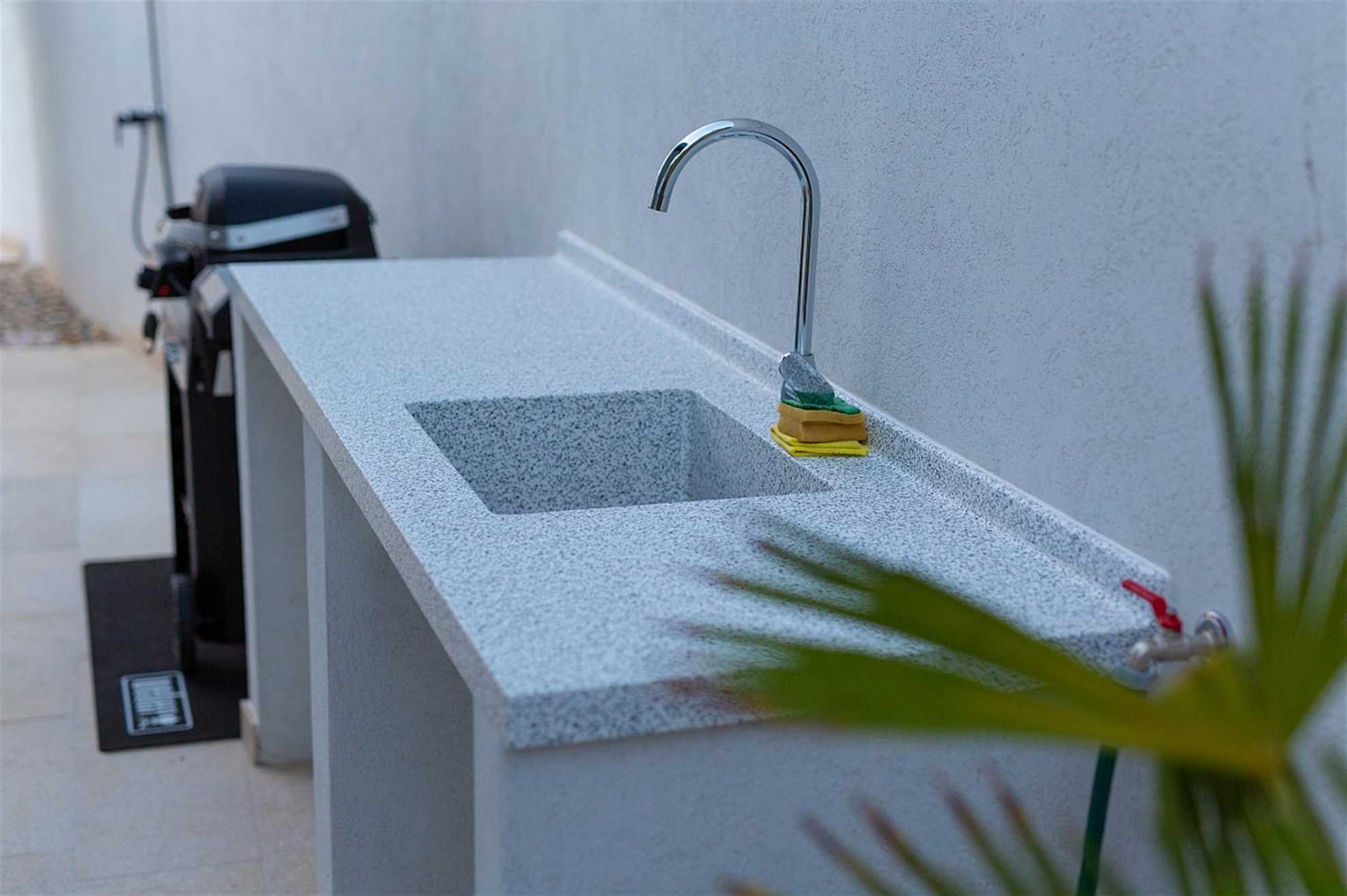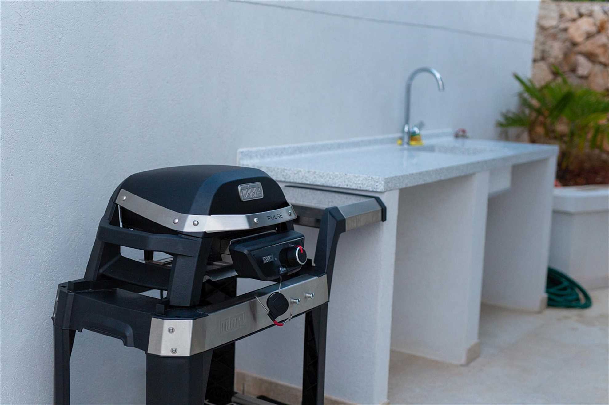 Upon arrival, you are welcomed by a spacious private parking area with room for three cars. From here, you access the beautifully designed terrace, equipped with a heated pool, an outdoor shower, comfortable sun loungers, and a dining table for eight people, all set under a stylish awning. The awning can be fully opened or closed as needed, allowing you to enjoy shade or sun as you prefer. A Weber grill is also available, making it easy to prepare delicious barbecue meals. The entire villa is enclosed, ensuring privacy and peace throughout your stay.