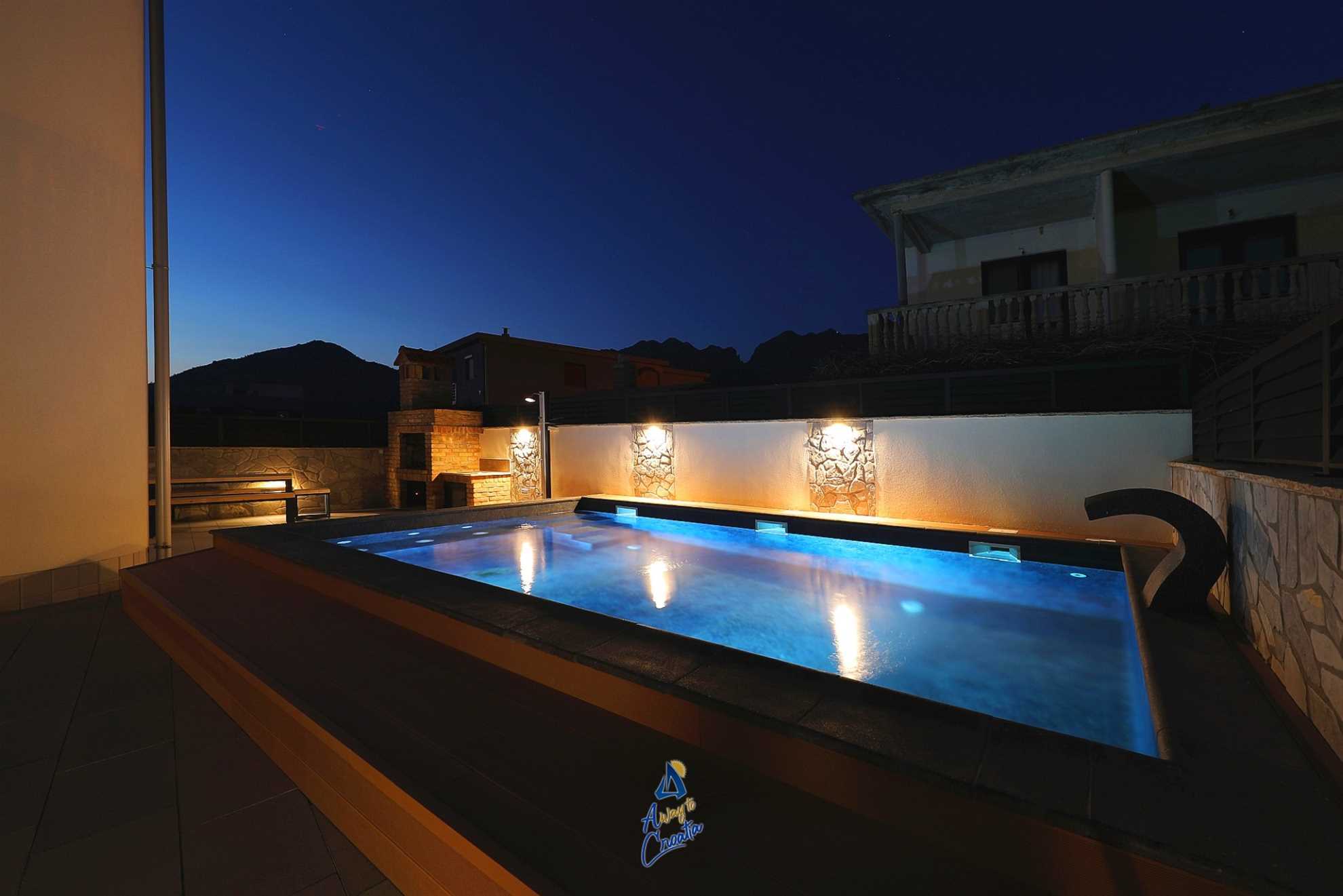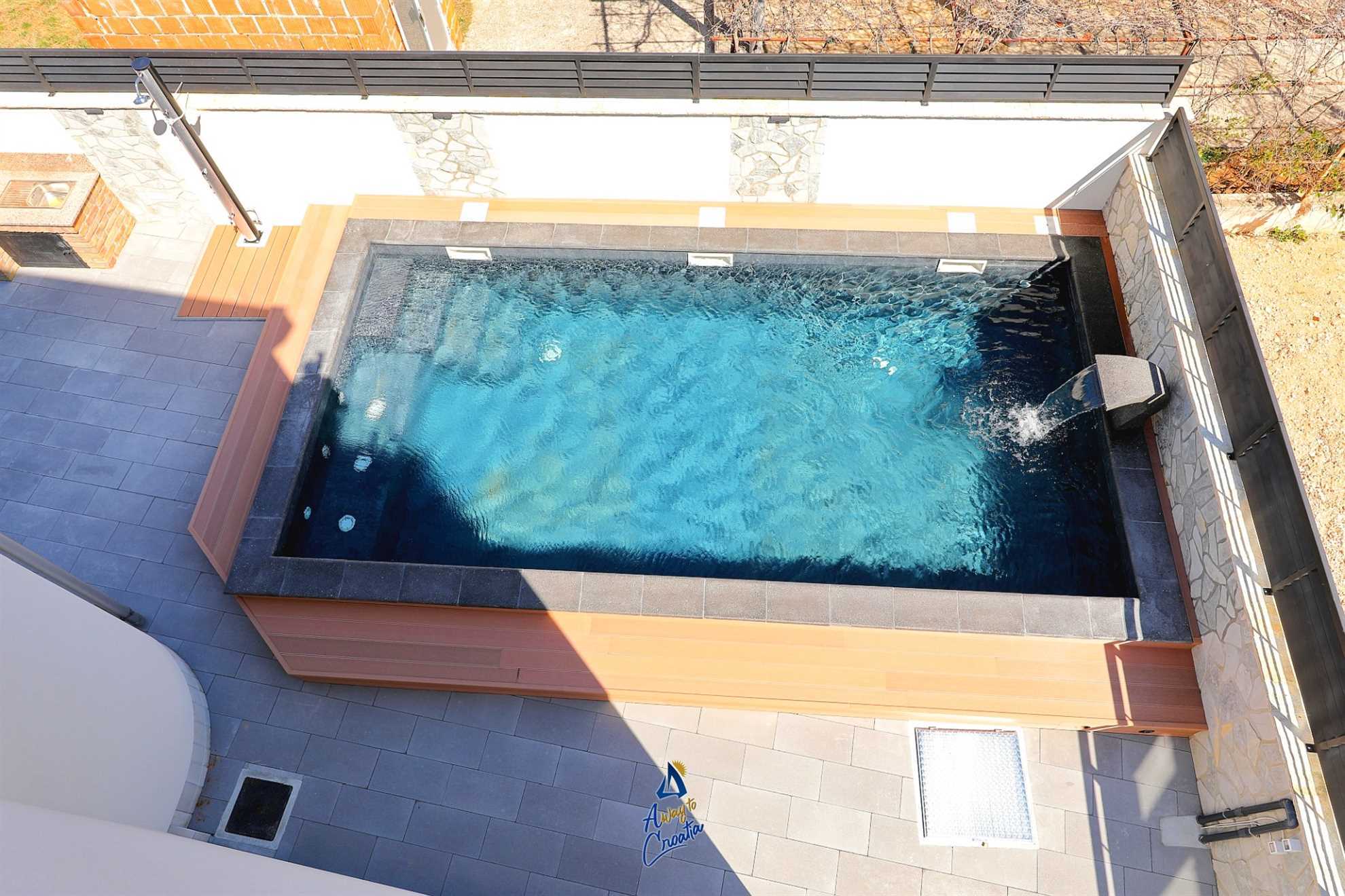 Behind the house, you’ll find a private pool, a large dining table for 16 guests, and a barbecue area, perfect for enjoying long summer evenings together.