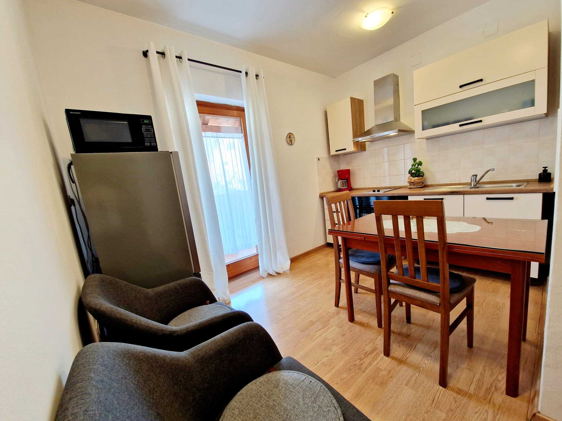 A2 SMILJE (2 persons) Apartment 33 m2 + 10 m2 balconie, situated on the first floor, consisting of: Bedroom with double bed 180 cm x 190 cm, Large private bathroom with a bathtube and bidet, Fully equipped kitchen with dining table, chairs and sofa, TV SAT, From the kitchen/dining room doors open on the balconie 10 m2 with chairs and table. Highlight: Large bathroom 5,40 m2. Access to the property through an electric gate (each guest has his own remote control).