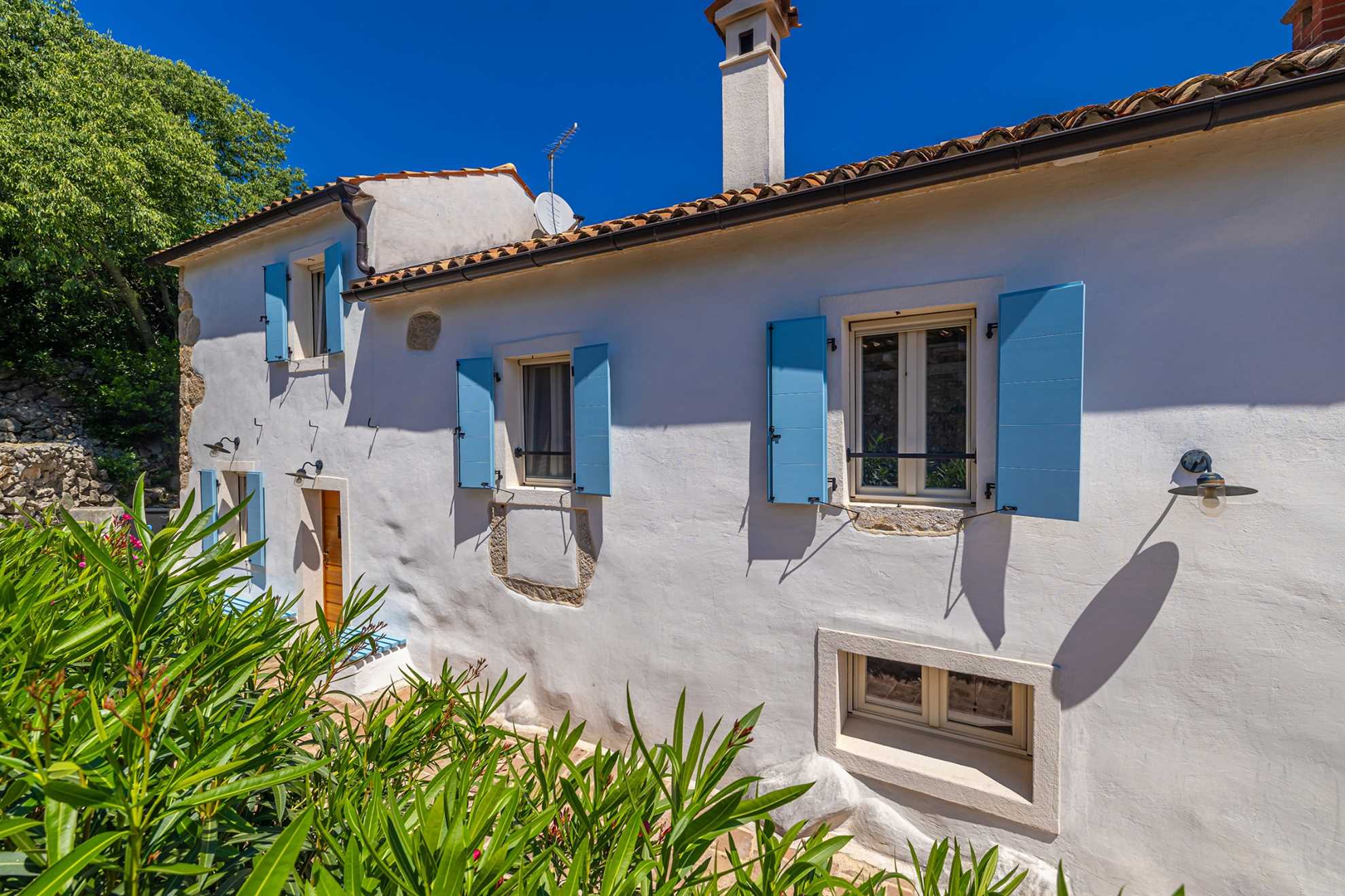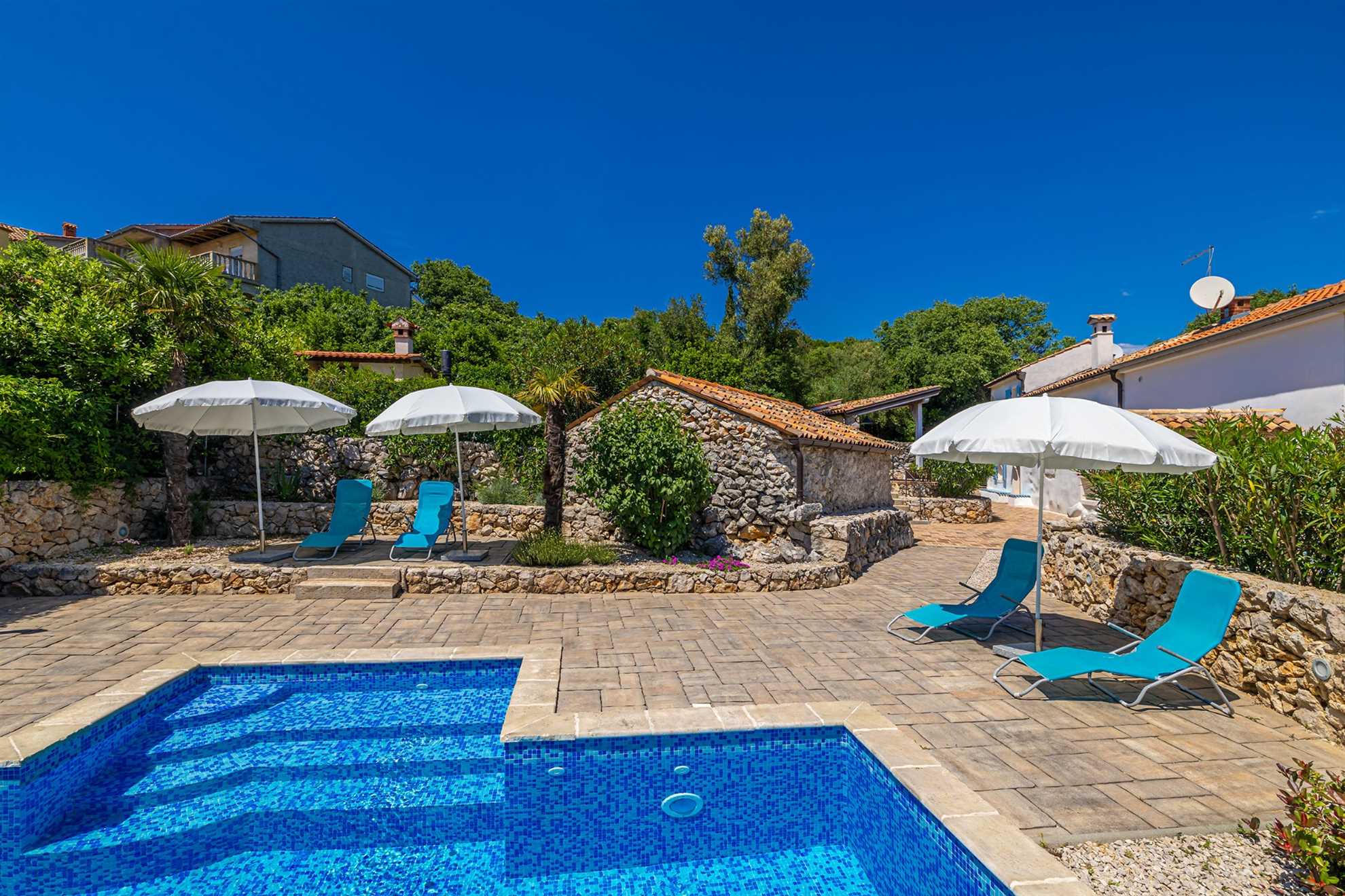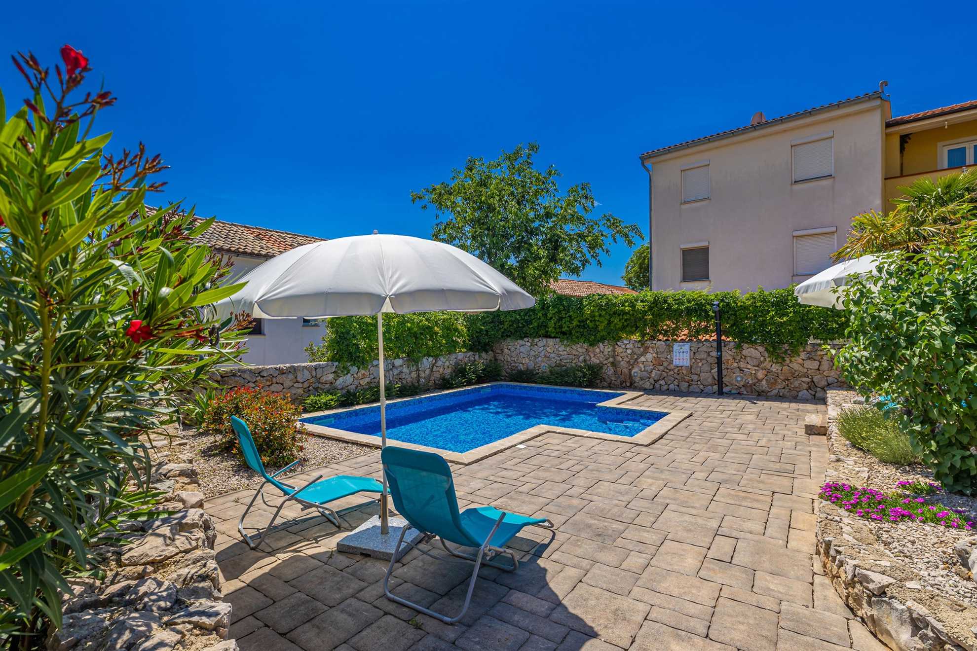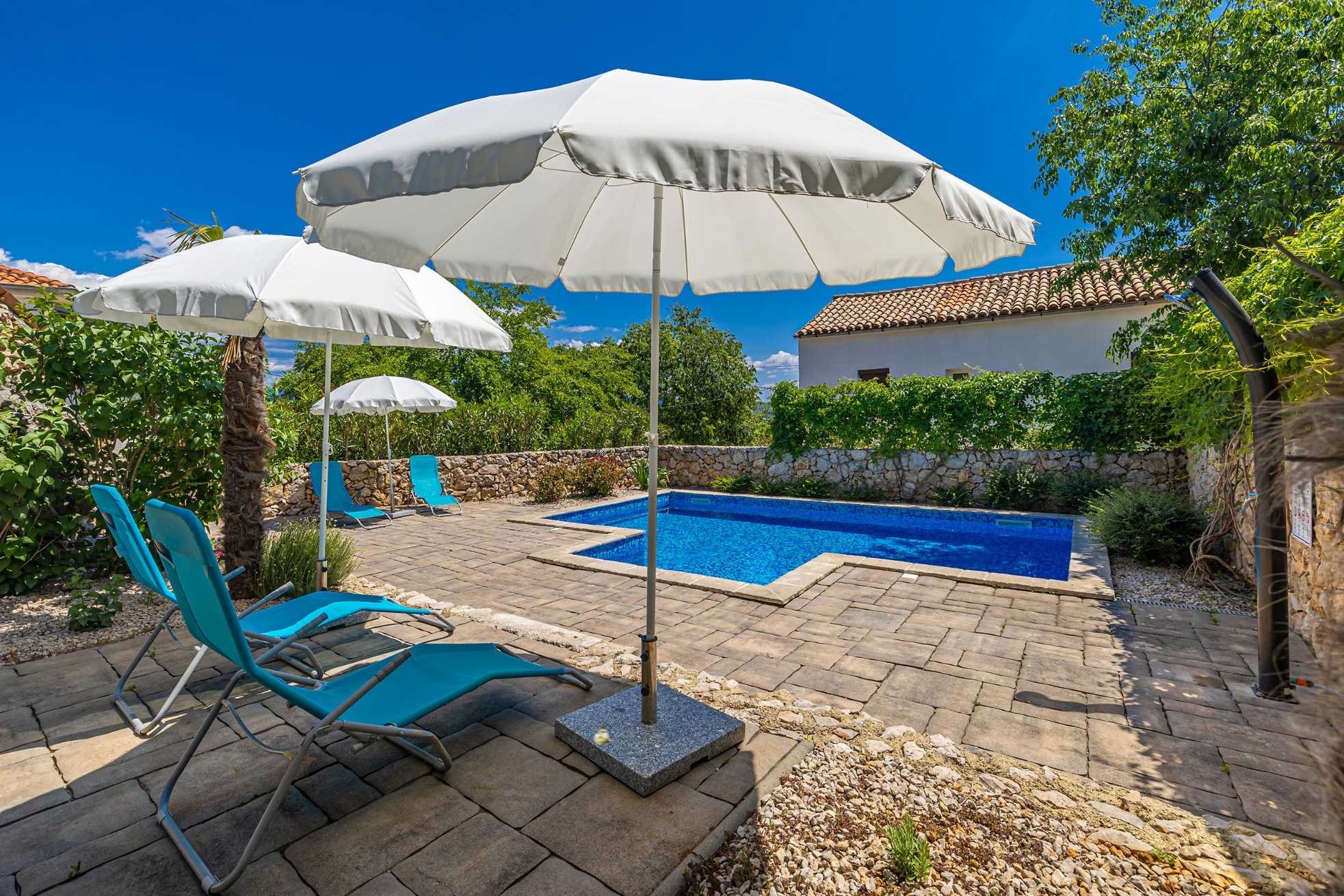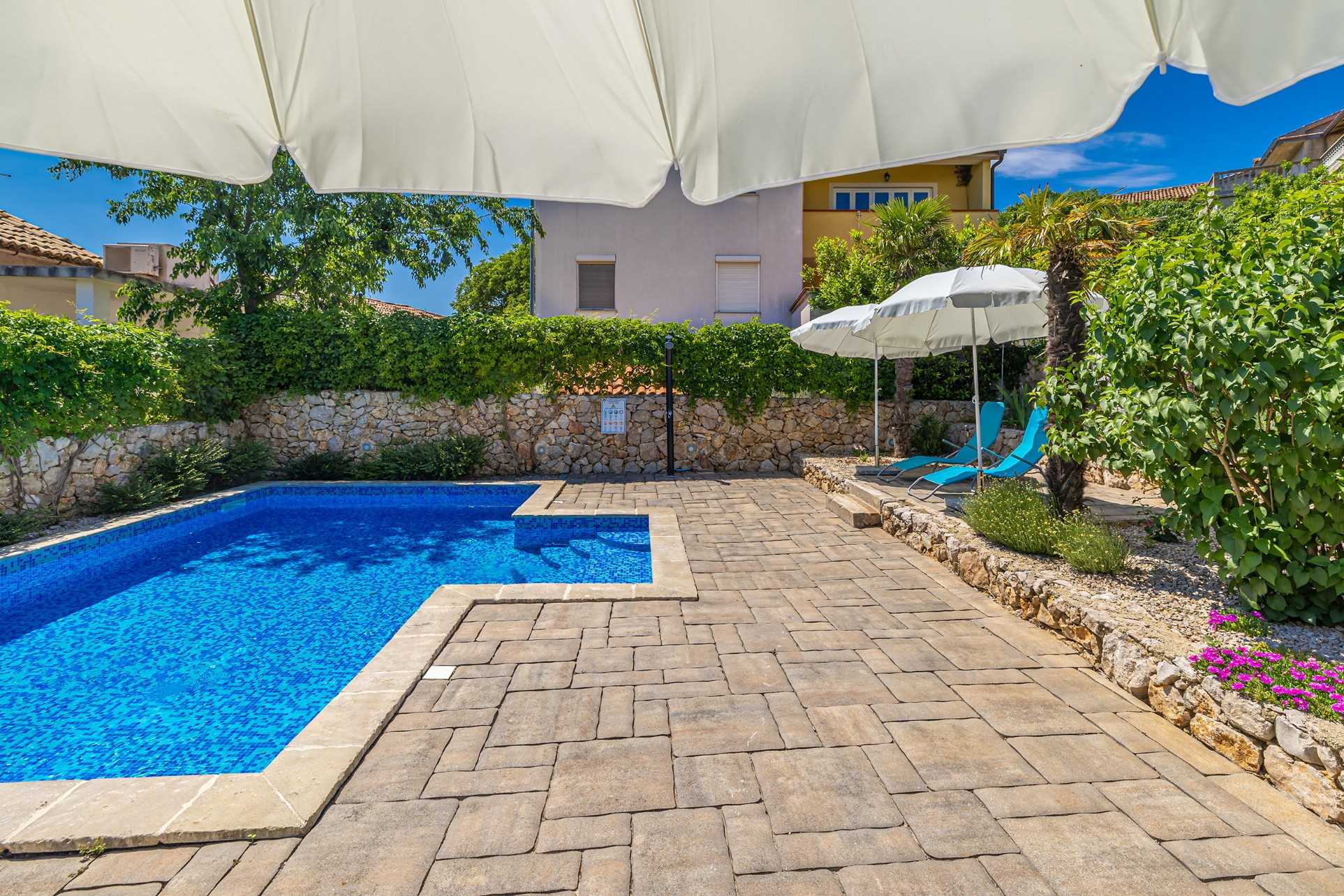 Luxury stone house with private swimming pool for 6 persons. It is located in Čižići on the island of Krk.The house has two bedrooms, two bathrooms and an outside bathroom. The holiday home is situated in a residential beach area, close to restaurants and bars, shops and supermarkets and at 400 m from the beach. Air-conditioned and fully furnished, the house is ideal for holidays with family or friends. Pets are welcome! The pool is open 01.03.-20.11.