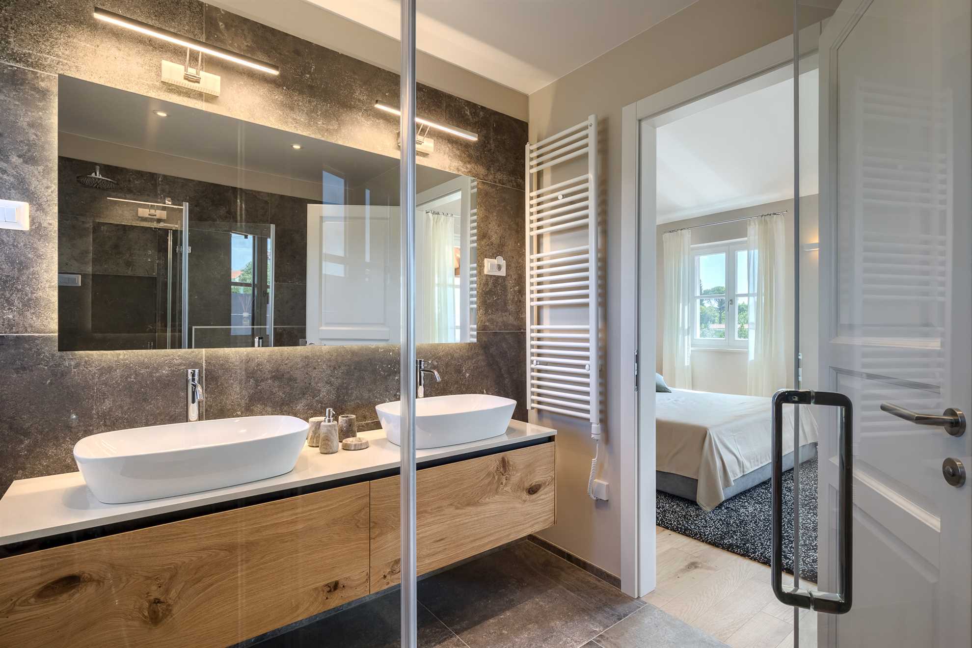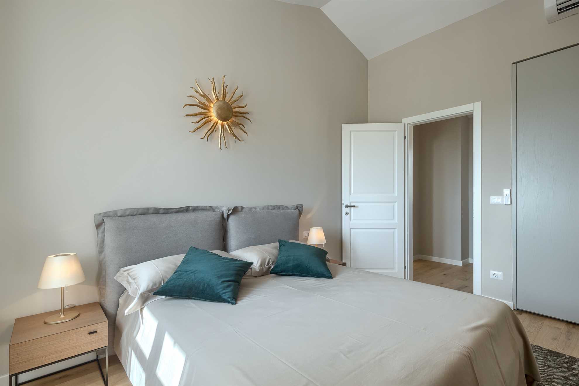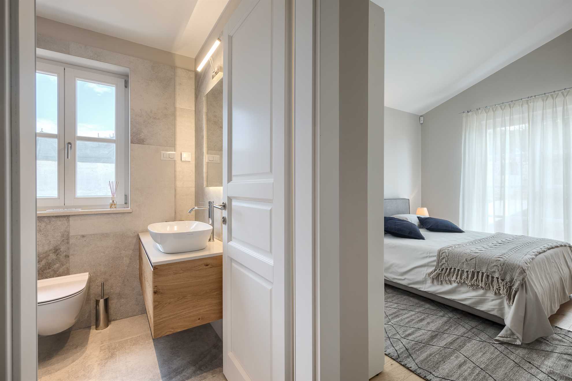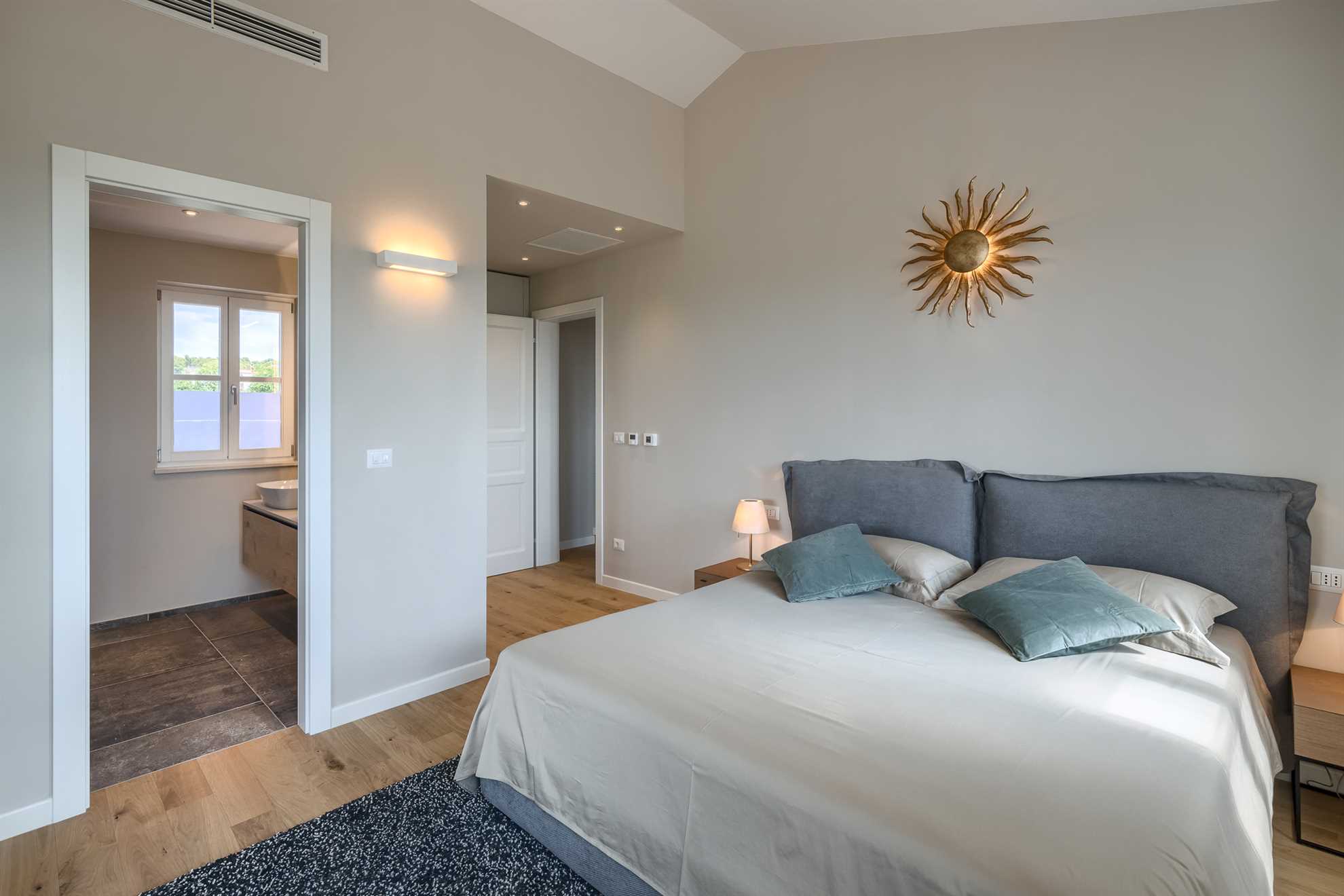 On the upper floor, there are two more elegant double bedrooms, each with its own luxurious bathroom. The master bedroom offers a private terrace with a charming view of the sea and the historic town of Višnjan – the perfect spot for a morning coffee or an evening glass of wine.
