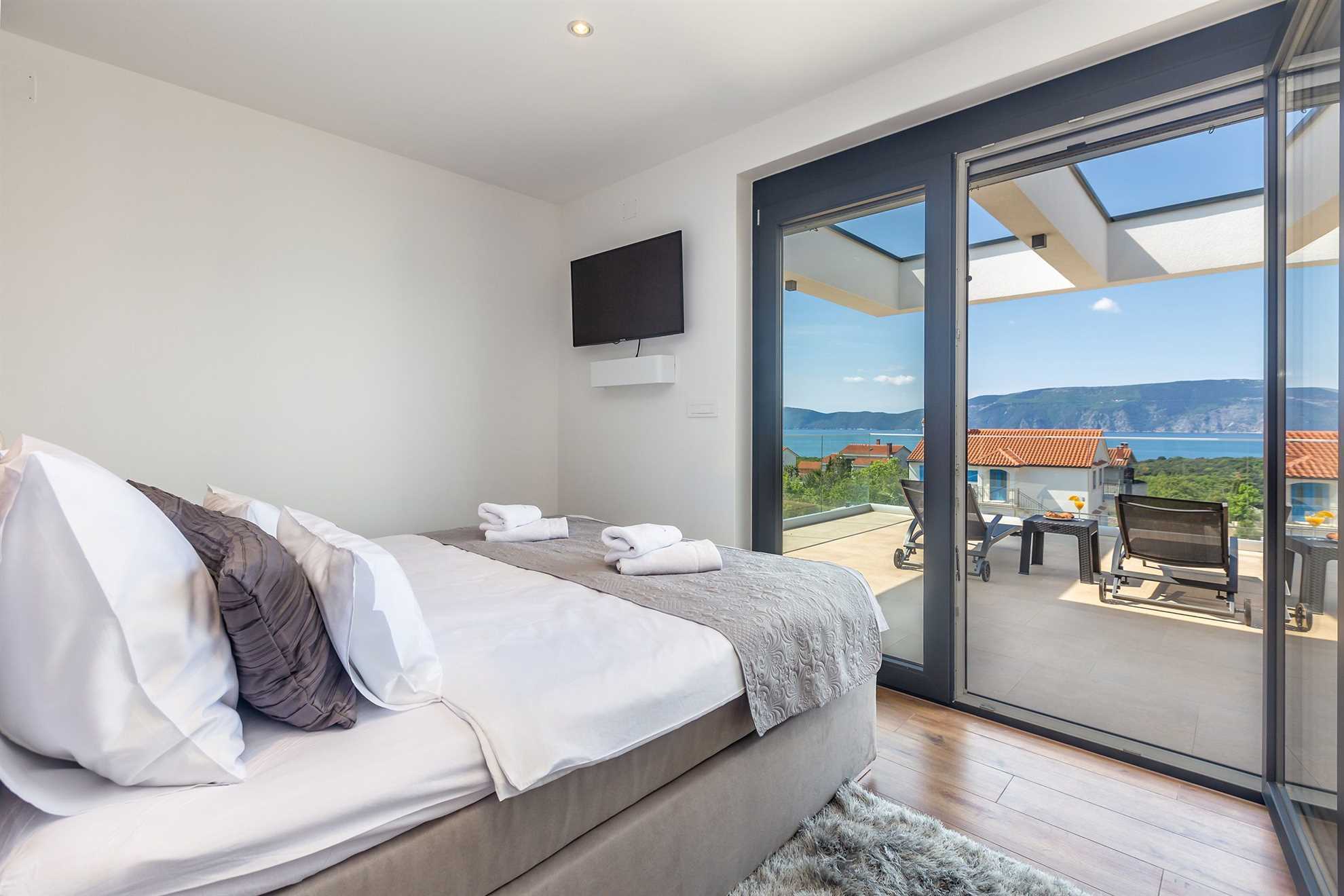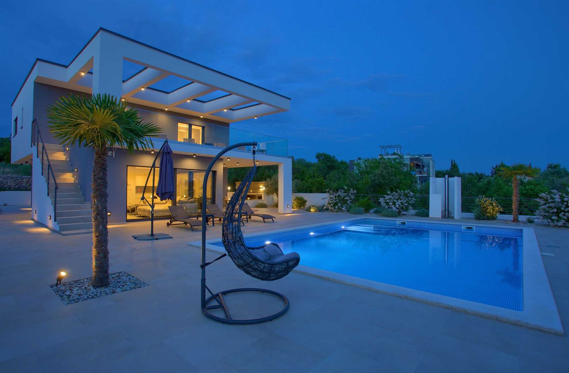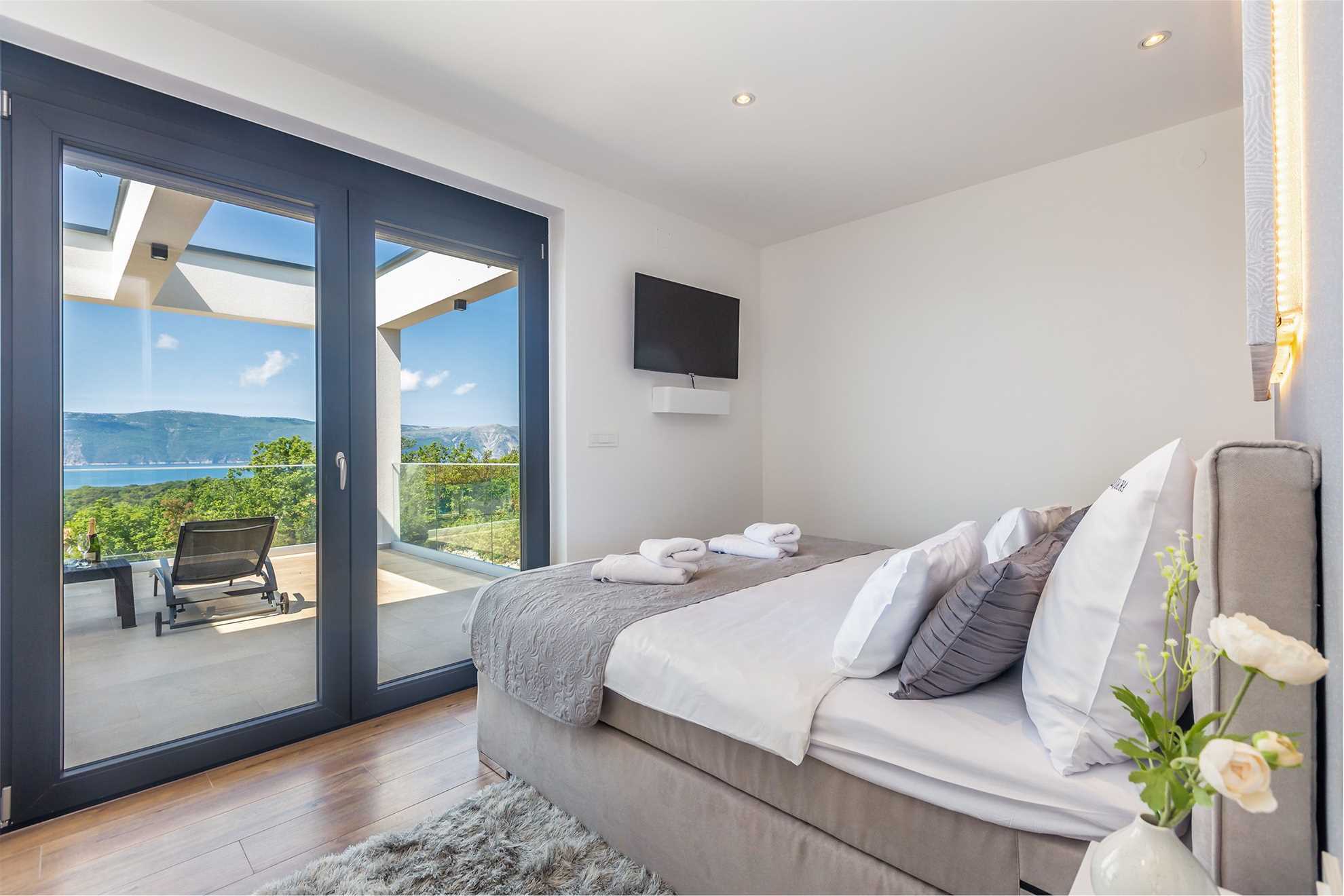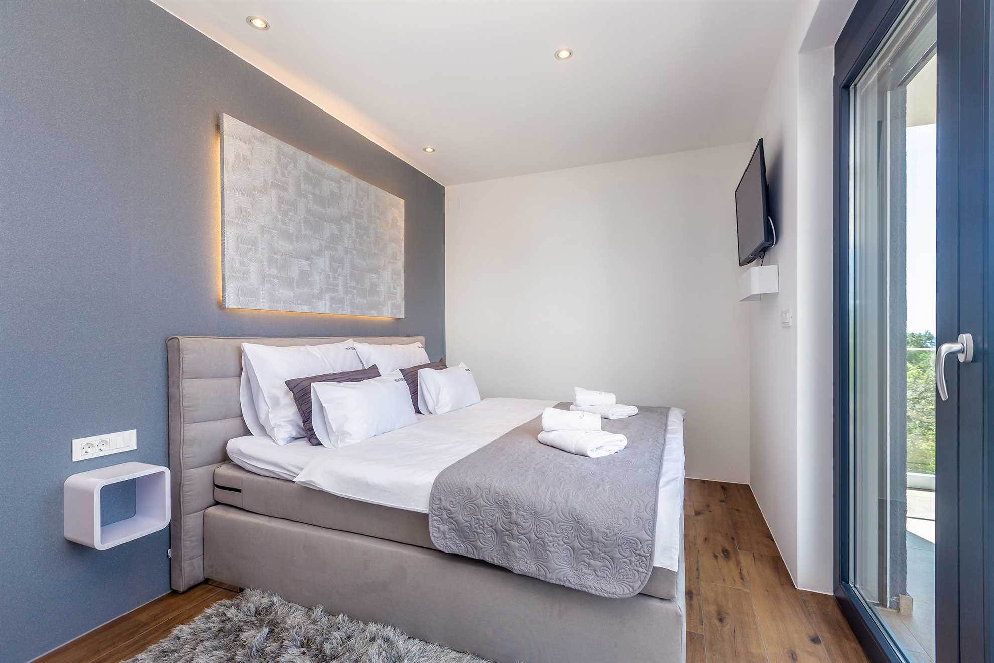 Luxurious, modern villa with beautiful sea view! The villa can accommodate 10 people, has a private swimming pool and a beautifully landscaped garden. Brand new and very tastefully furnished, it has five bedrooms, four bathrooms + one guest toilet, kitchen and dining room and living room with pool access. The villa is air-conditioned, has underfloor heating - ideal for families. Guests have access to private parking and garage.