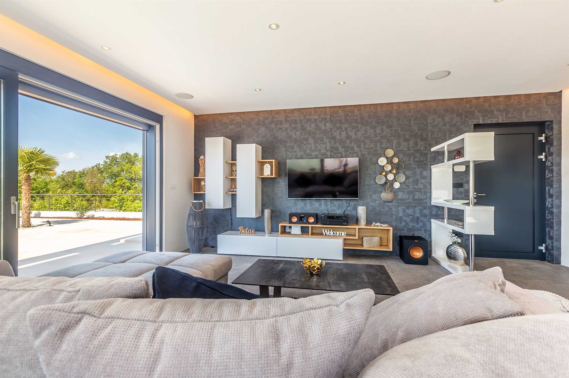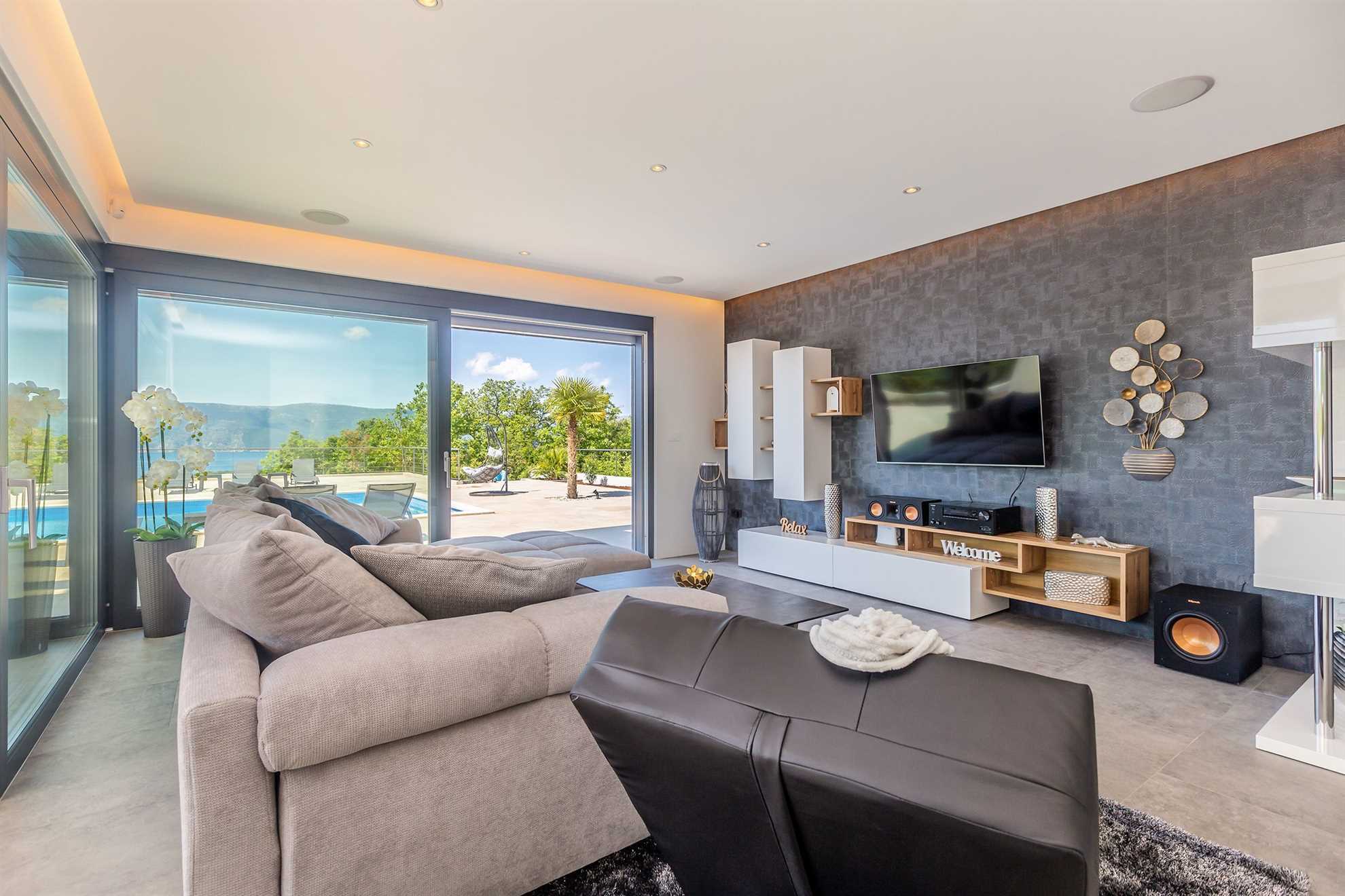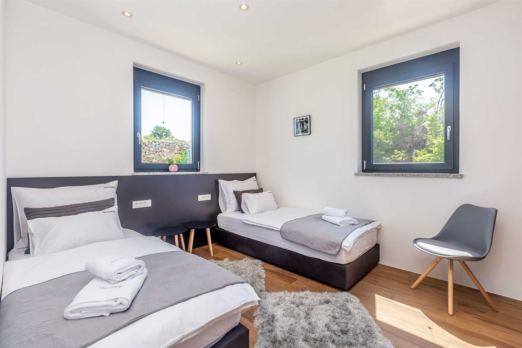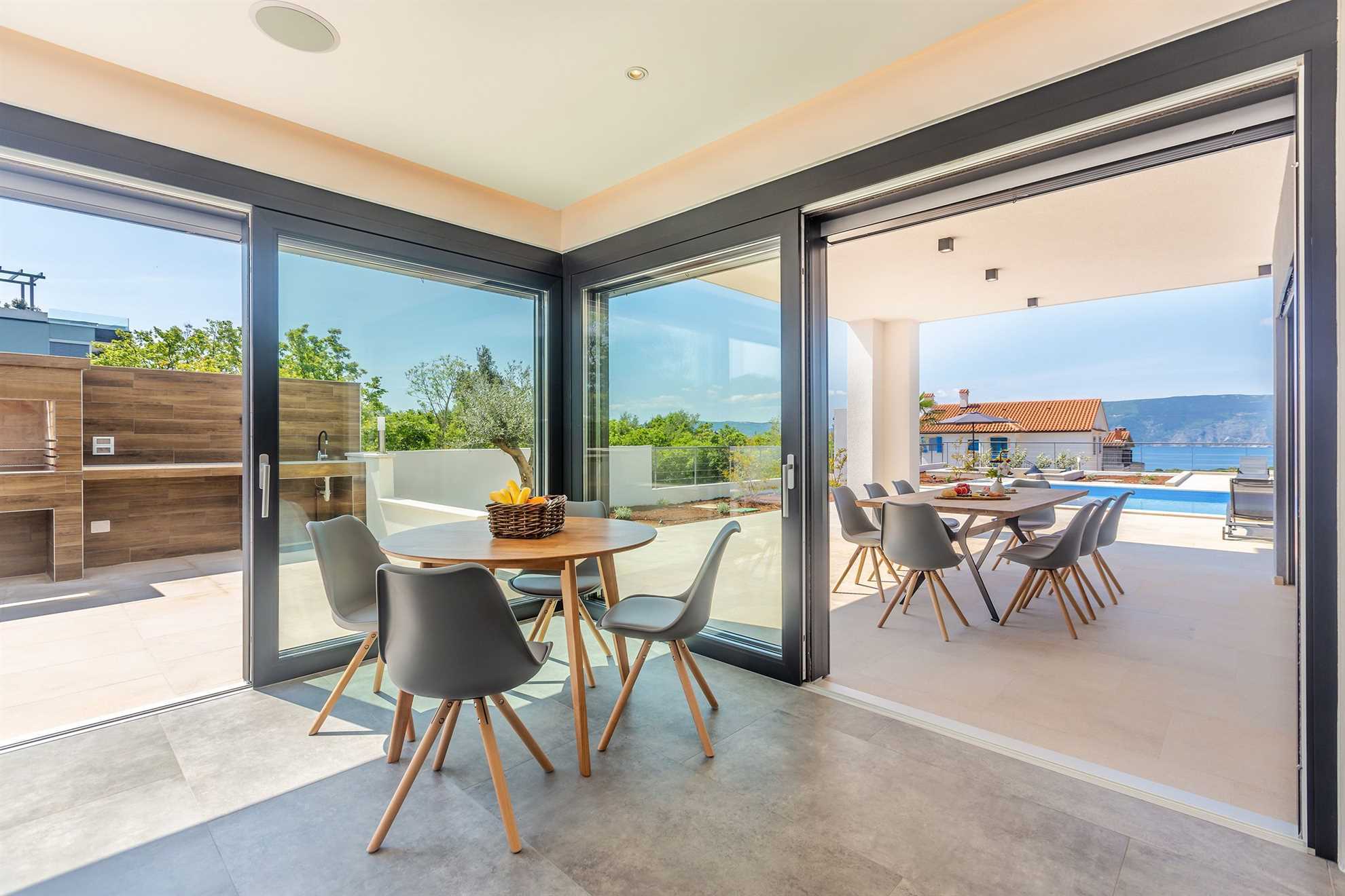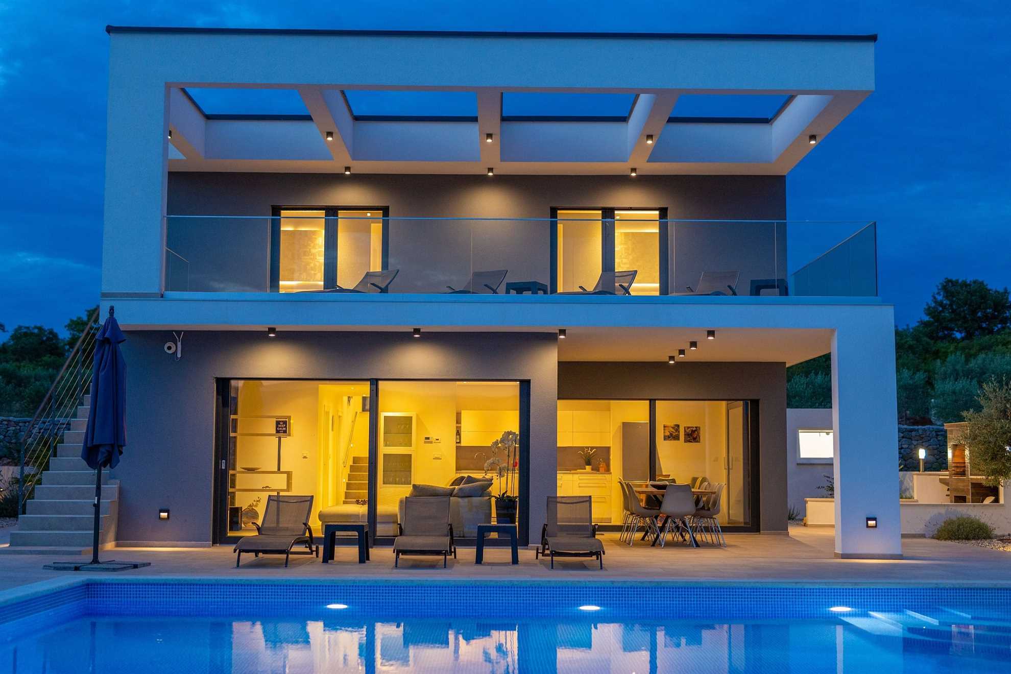 Luxurious, modern villa with beautiful sea view! The villa can accommodate 10 people, has a private swimming pool and a beautifully landscaped garden. Brand new and very tastefully furnished, it has five bedrooms, four bathrooms + one guest toilet, kitchen and dining room and living room with pool access. The villa is air-conditioned, has underfloor heating - ideal for families. Guests have access to private parking and garage.