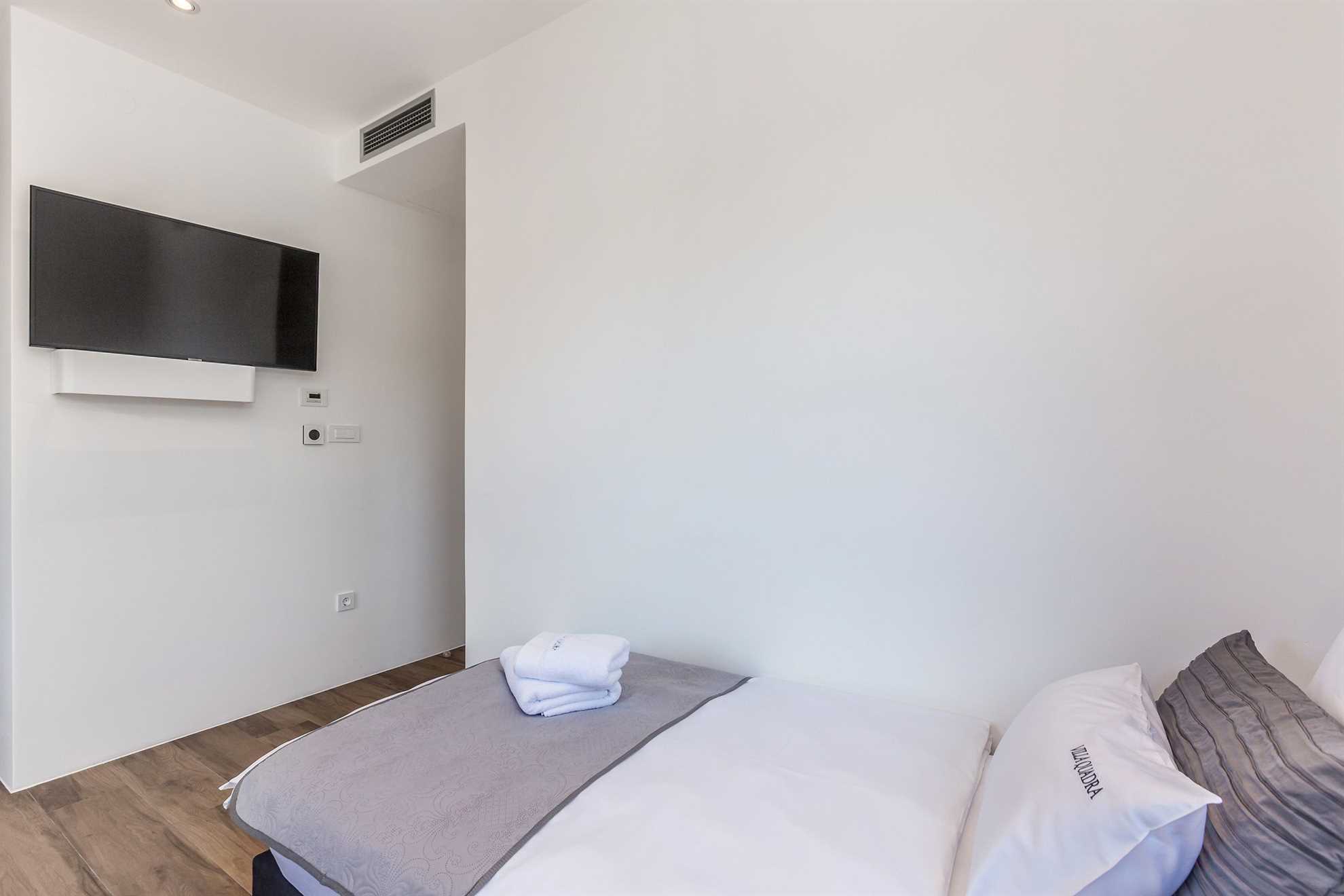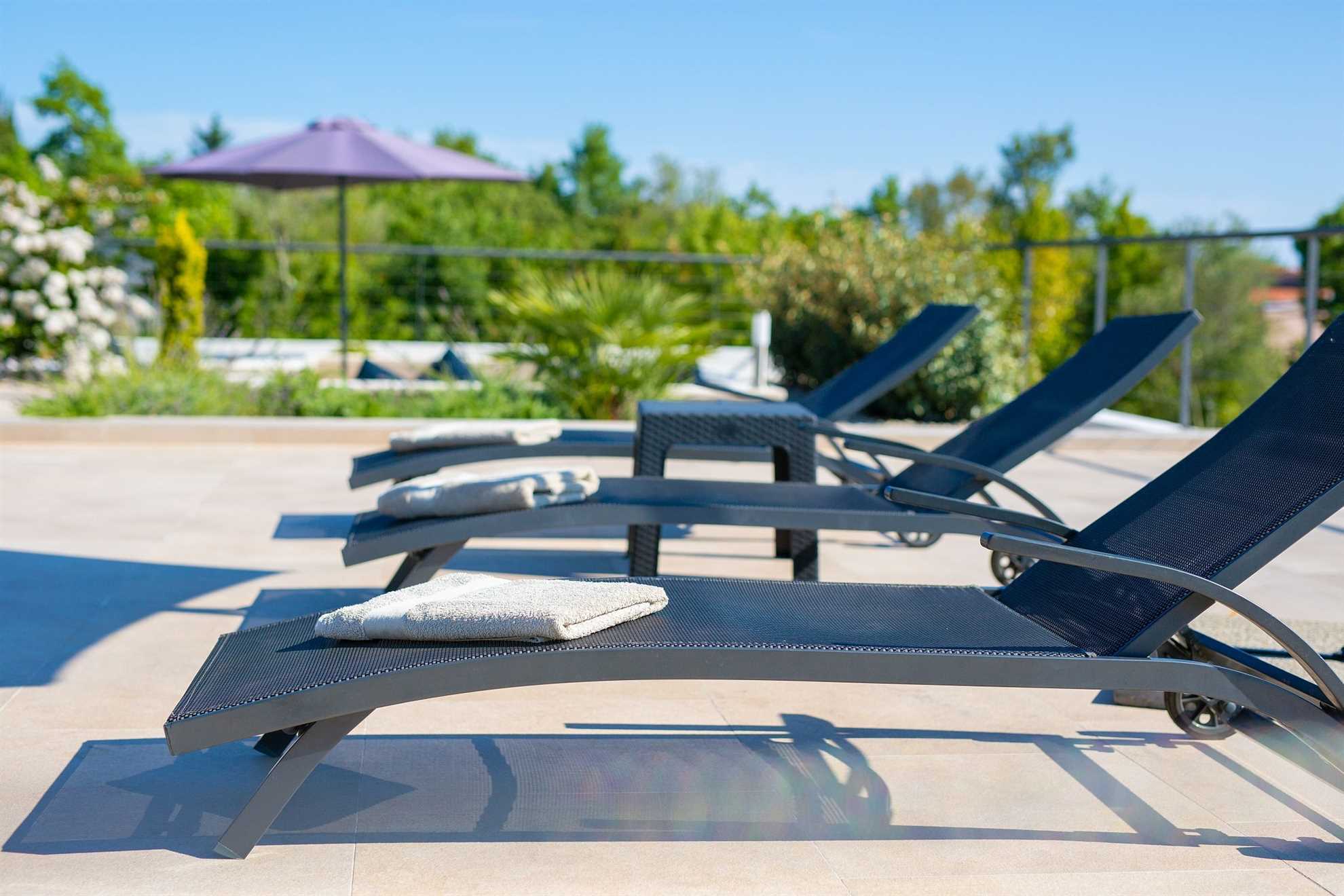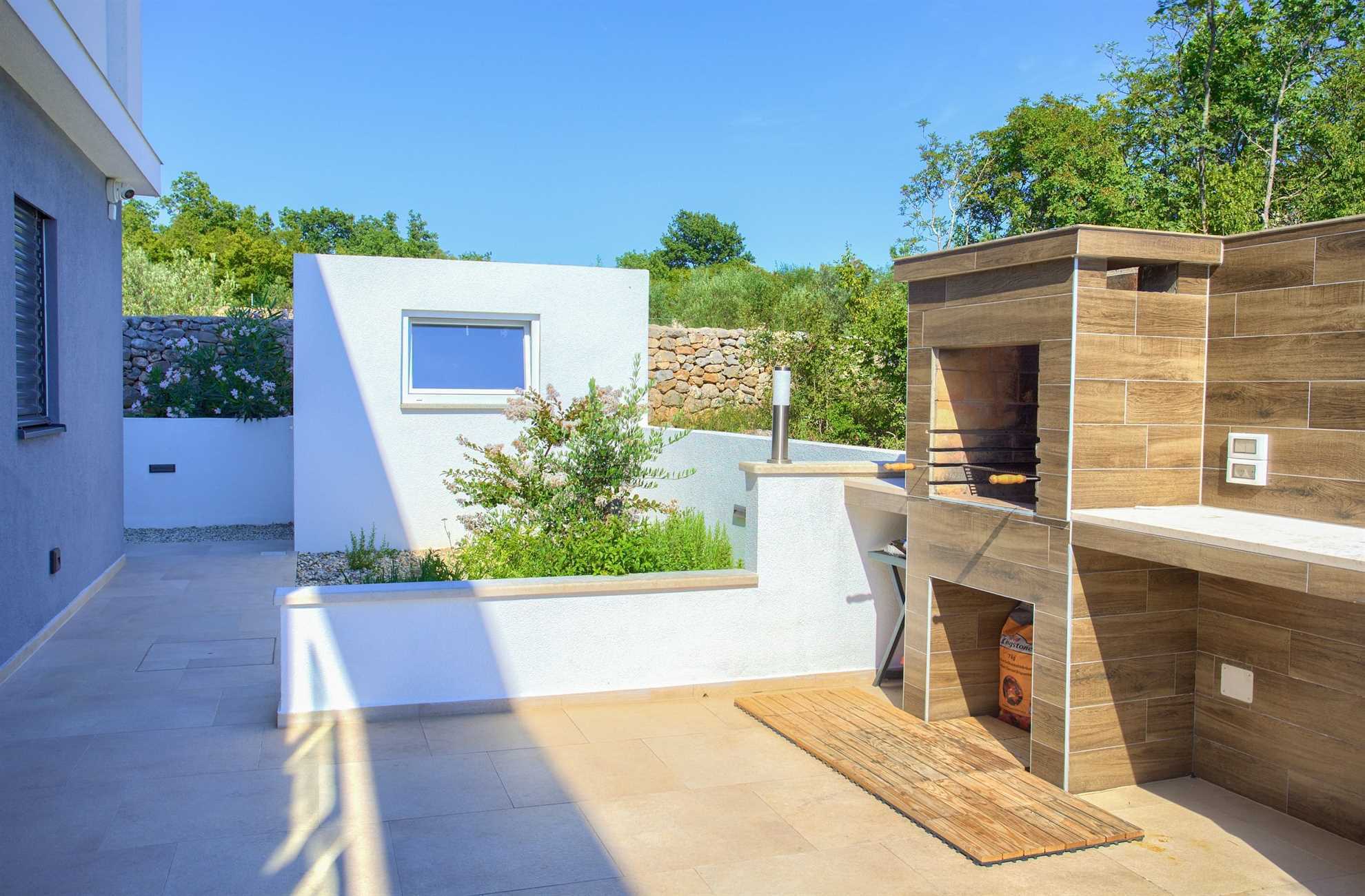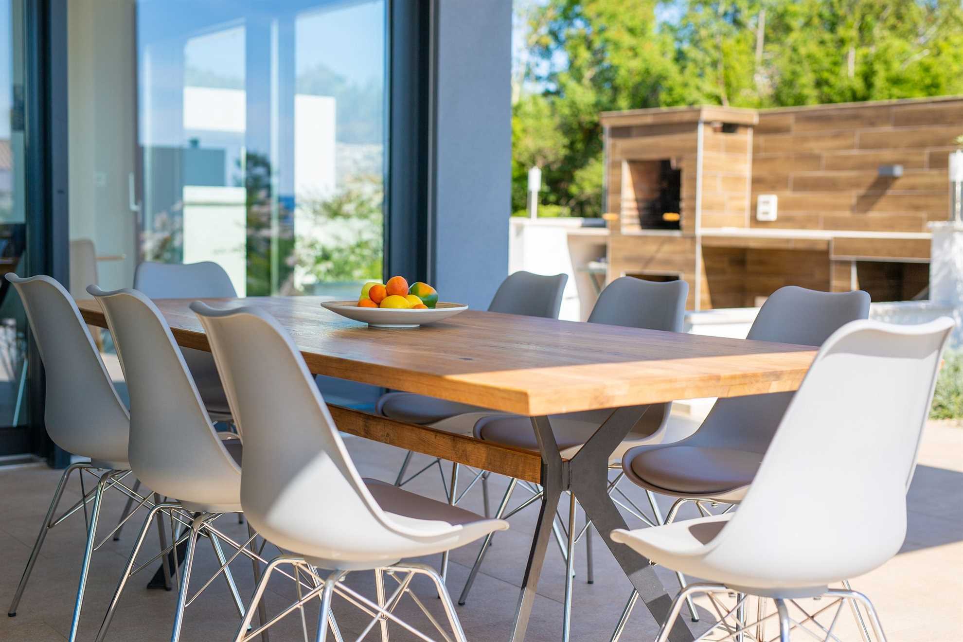 Luxurious, modern villa with beautiful sea view! The villa can accommodate 10 people, has a private swimming pool and a beautifully landscaped garden. Brand new and very tastefully furnished, it has five bedrooms, four bathrooms + one guest toilet, kitchen and dining room and living room with pool access. The villa is air-conditioned, has underfloor heating - ideal for families. Guests have access to private parking and garage.