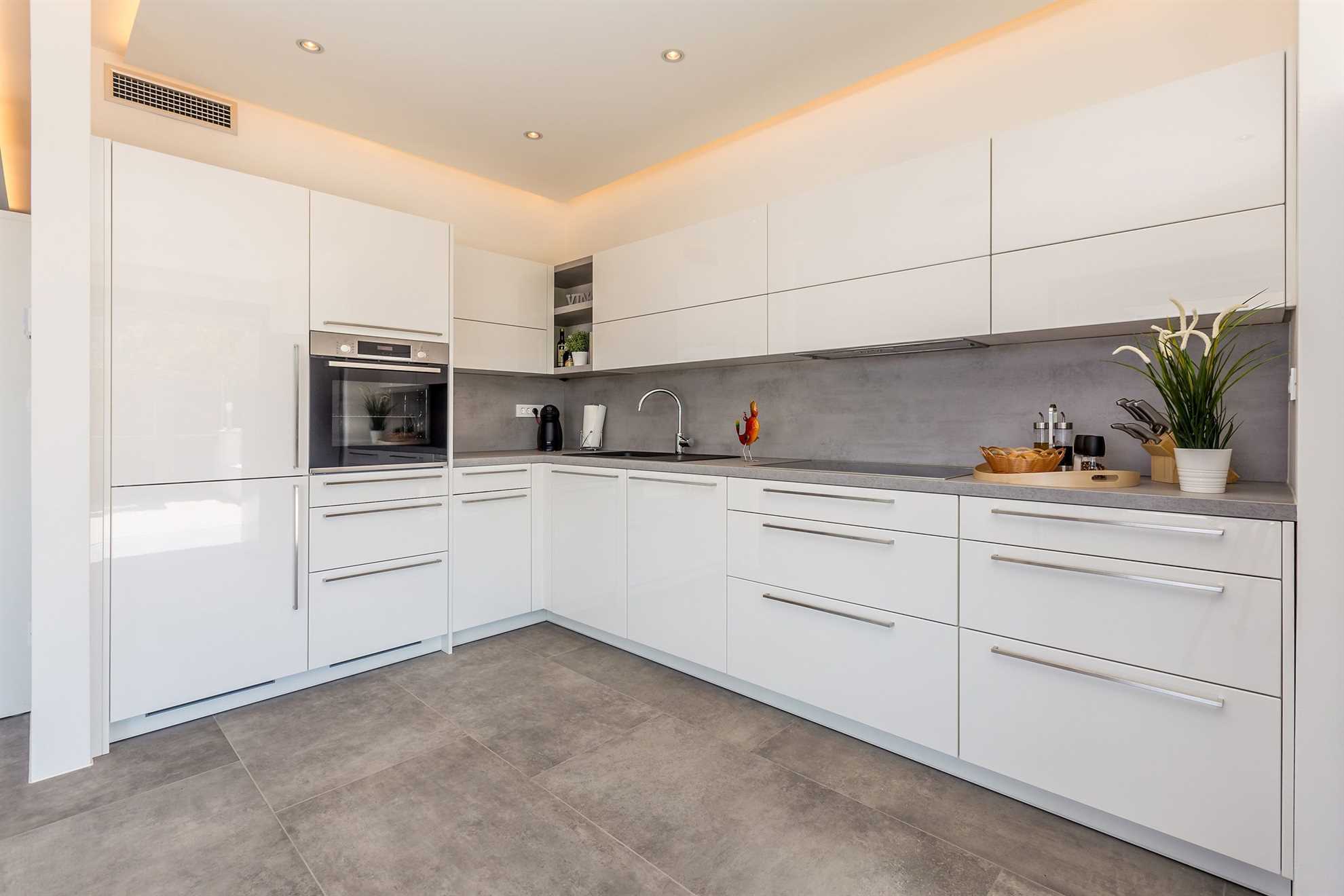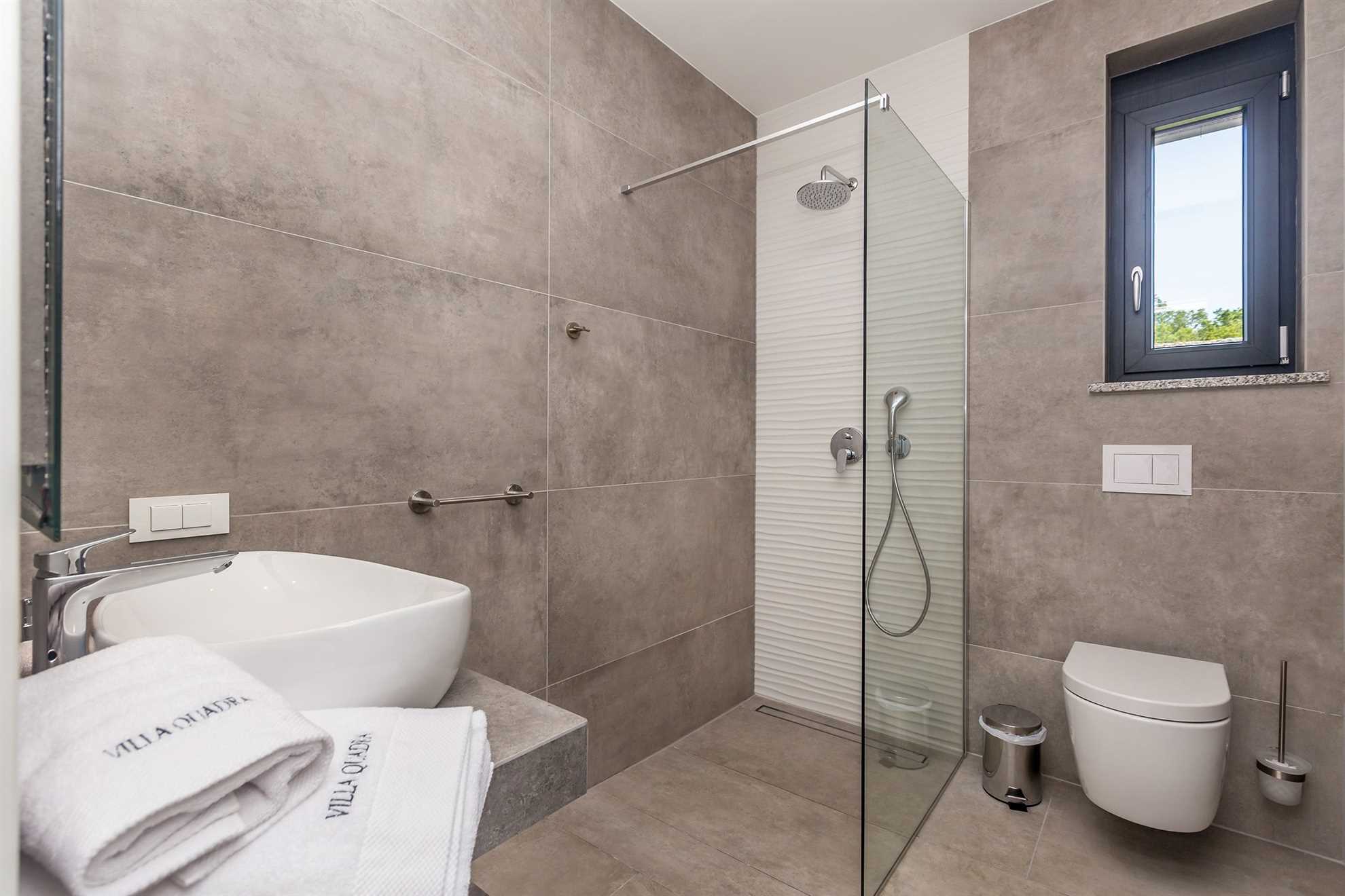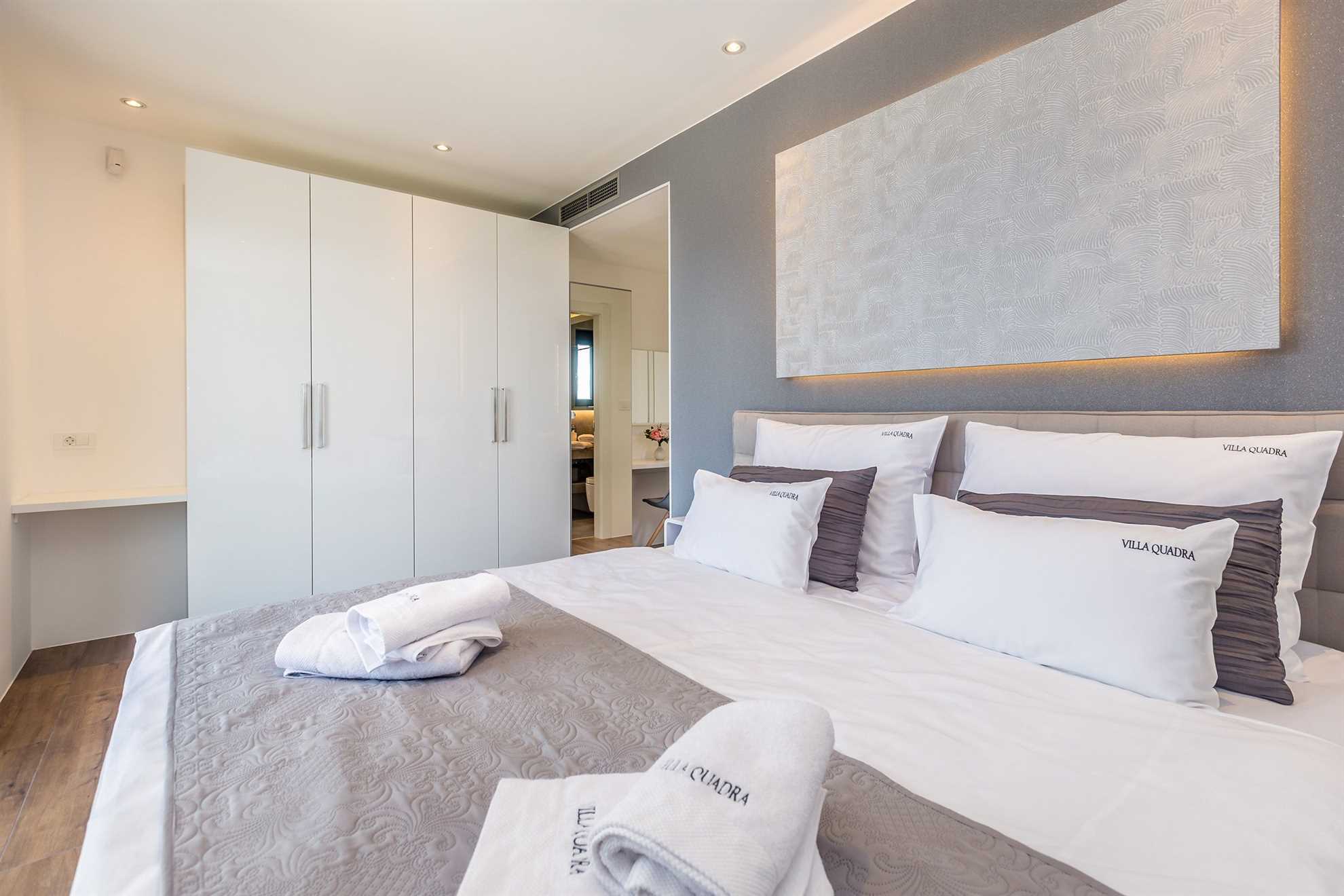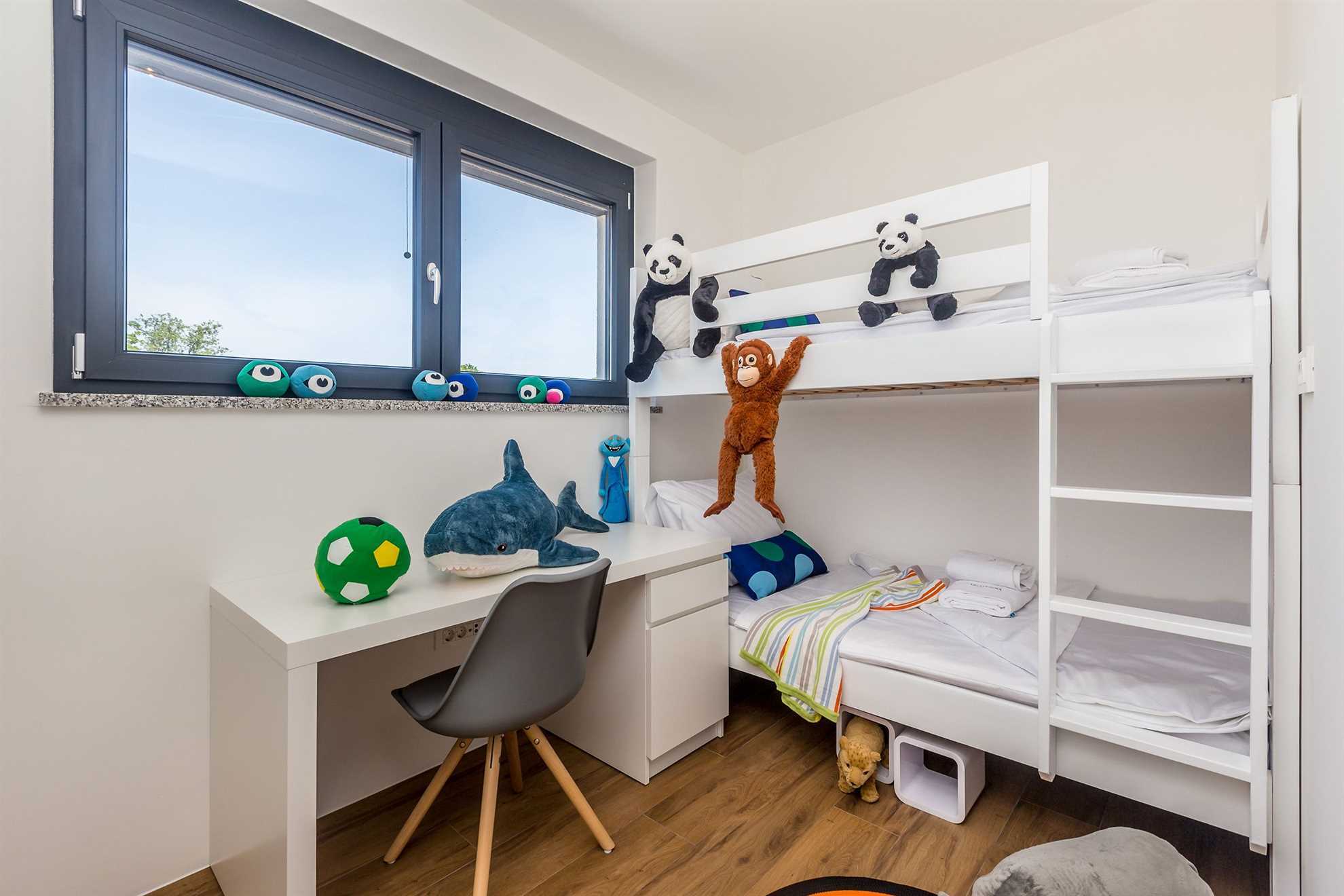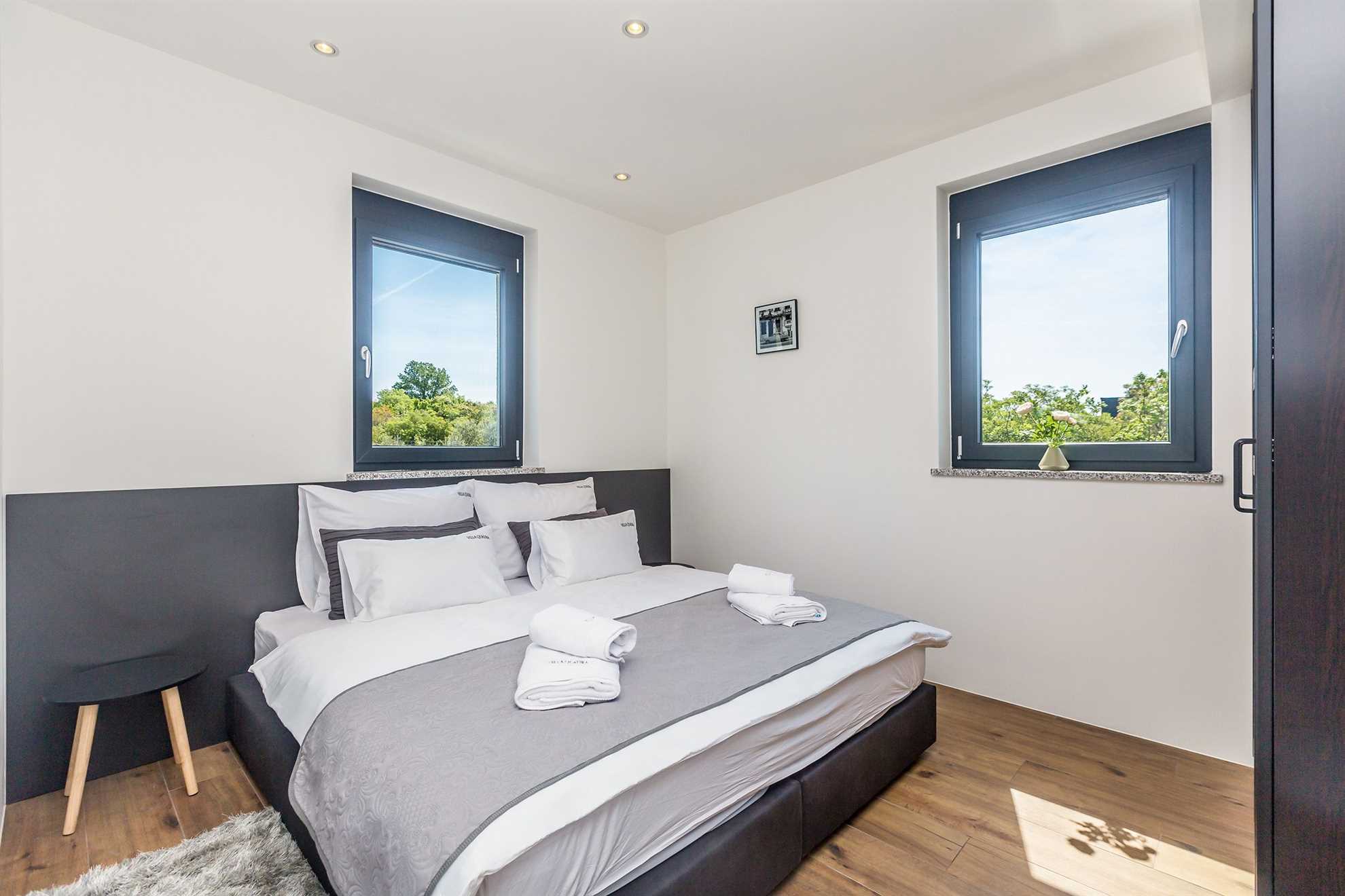 Luxurious, modern villa with beautiful sea view! The villa can accommodate 10 people, has a private heated swimming pool and a beautifully landscaped garden. Brand new and very tastefully furnished, it has five bedrooms, four bathrooms + one guest toilet, kitchen and dining room and living room with pool access. The villa is air-conditioned, has underfloor heating - ideal for families. Guests have access to private parking and garage. The pool is closed in the period from 01.11.-01.04.