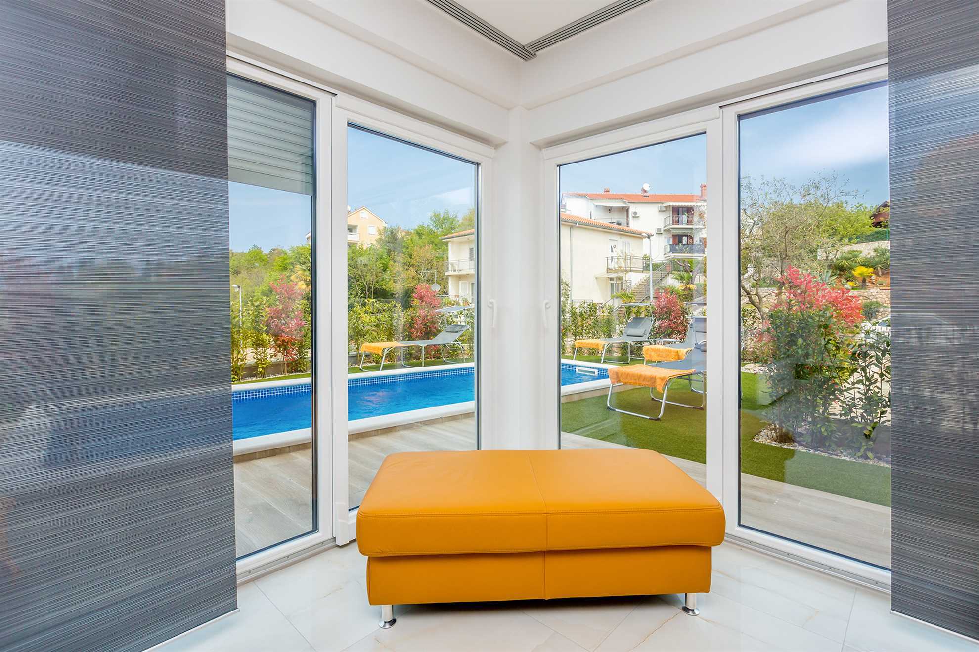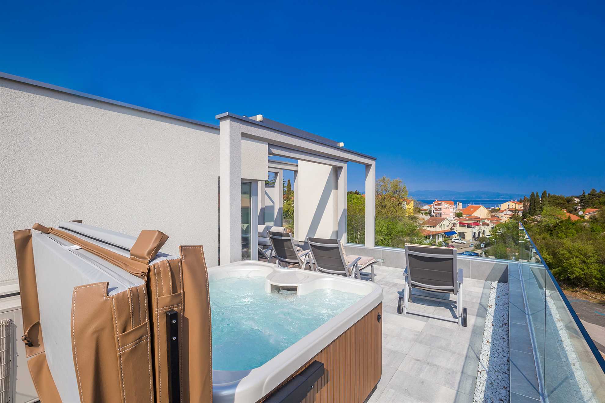 Luxuriously decorated villa Moderna in the city of Malinska can accommodate a total of 6 persons. It has three double bedrooms, three bathrooms, kitchen with dining room and living room. A heated swimming pool, sauna and jacuzzi as well as outdoor shower, sun lougers are also at your disposal. The beach and city center vicinity make this villa an ideal choice for your vacation on the island of Krk! Fully equipped, offers everything you need for a carefree summer day with your family. Parking spot provided.