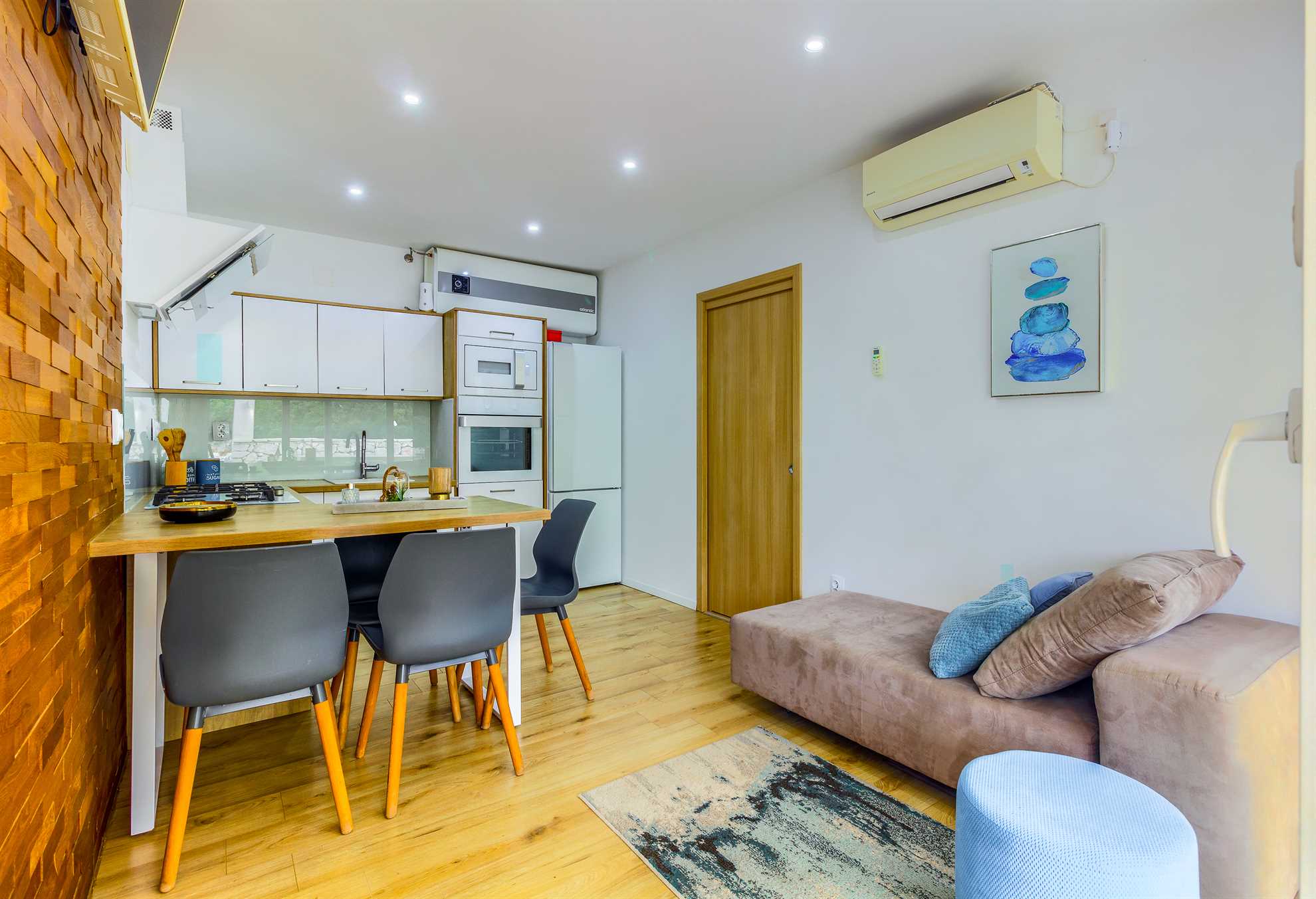 In two bedrooms four guests are comfortably accommodated, with an option of one more on the sofa bed.