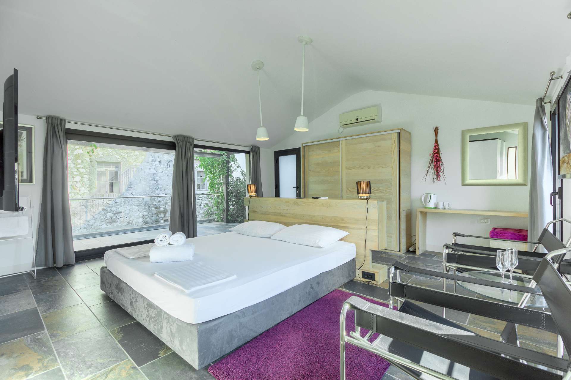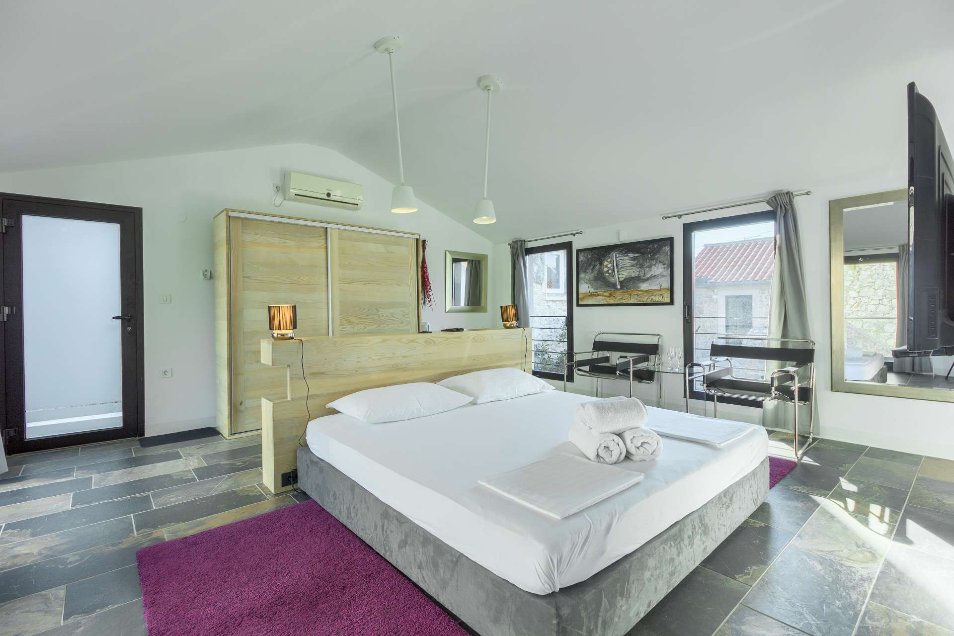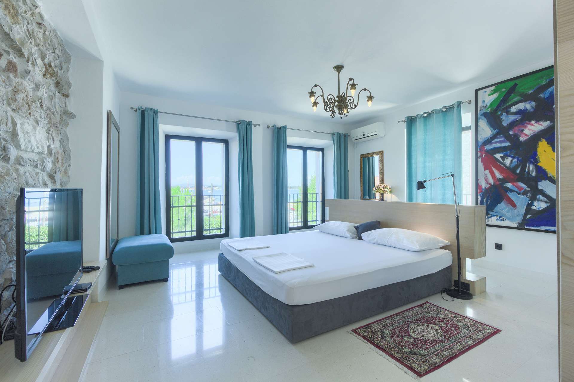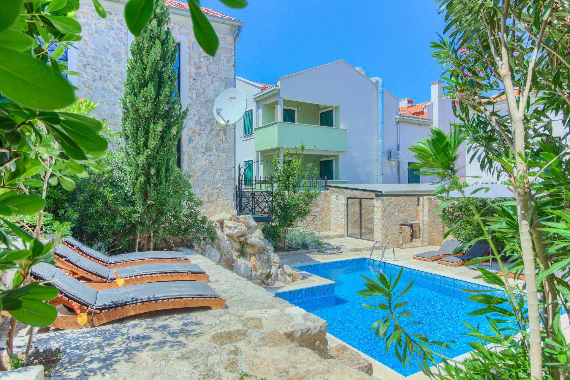 Welcome to Villa Cubismo, only 100 meters away from the sea with capacity to accommodate large groups or multiple families. Nine luxurious bedrooms come equipped with ensuite bathrooms, a separate seating area and some with in-room clawfoot bathtub. Modern and very spacious with elegant fixtures and timeless furnishings, sun filled rooms sparkle in the summer sun through floor to ceiling windows. Beamed wood vaulted ceilings, white walls covered with abstract art pieces, exposed stone craftsmanship and a flat screen TV are there to indulge you and set you up for a holiday you've been anticipating. Three living units comprise the villa with a pool and a Jacuzzi in the middle. In the main house is an ample and luminous fully equipped kitchen and seven of the bedrooms. Two annexes offer a bedrooms each with its own bathroom. The outdoor seating area accommodates 18 guests. Pool table and table football are available for your enjoyment. Beaches, restaurants and markets are all steps away. Villa Cubismo is a sanctuary for those seeking comfort, convenience, luxury, quality times with loved ones and some of the best beaches the Adriatic has to offer. Welcome to island Pašman.