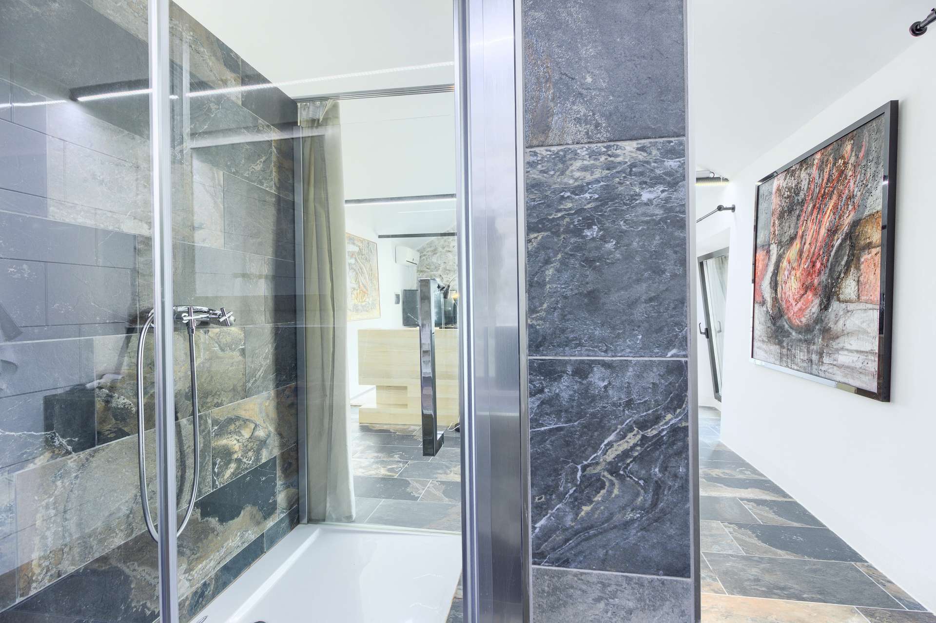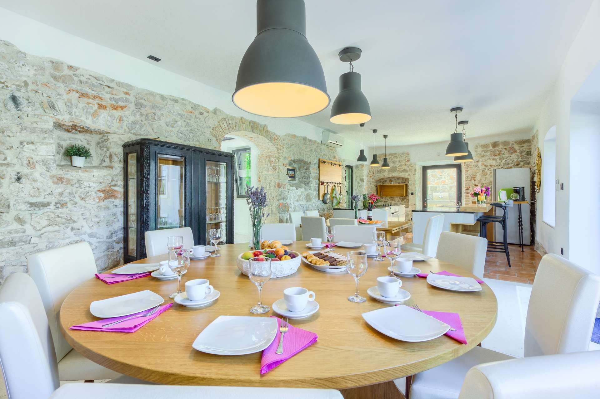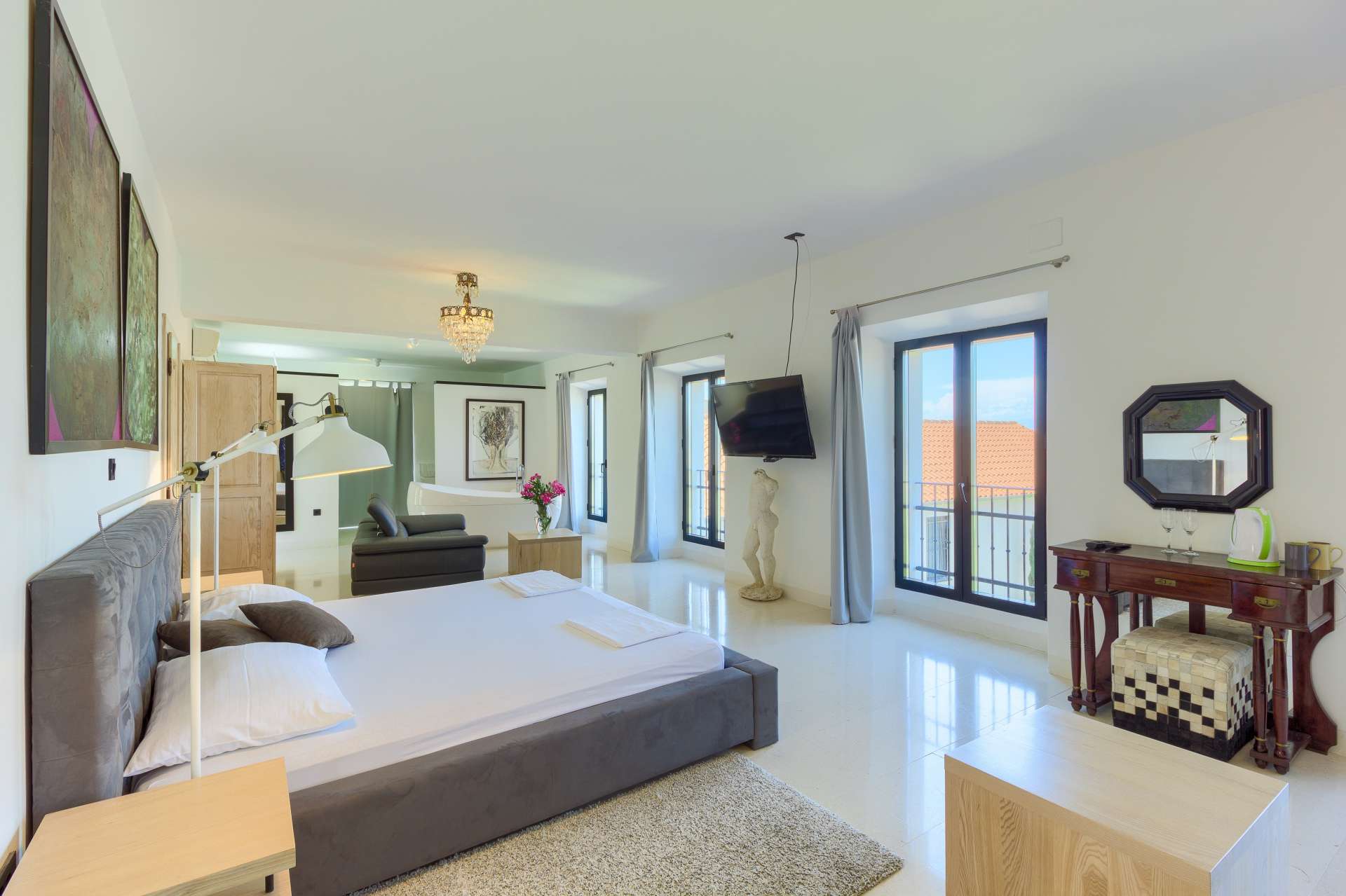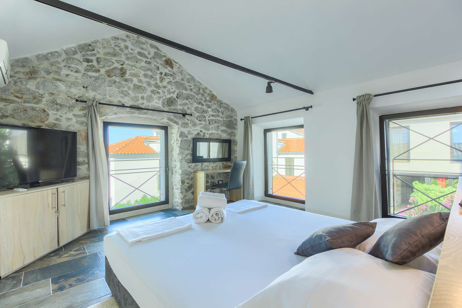 Welcome to Villa Cubismo, only 100 meters away from the sea with capacity to accommodate large groups or multiple families. Nine luxurious bedrooms come equipped with ensuite bathrooms, a separate seating area and some with in-room clawfoot bathtub. Modern and very spacious with elegant fixtures and timeless furnishings, sun filled rooms sparkle in the summer sun through floor to ceiling windows. Beamed wood vaulted ceilings, white walls covered with abstract art pieces, exposed stone craftsmanship and a flat screen TV are there to indulge you and set you up for a holiday you've been anticipating. Three living units comprise the villa with a pool and a Jacuzzi in the middle. In the main house is an ample and luminous fully equipped kitchen and seven of the bedrooms. Two annexes offer a bedrooms each with its own bathroom. The outdoor seating area accommodates 18 guests. Pool table and table football are available for your enjoyment. Beaches, restaurants and markets are all steps away. Villa Cubismo is a sanctuary for those seeking comfort, convenience, luxury, quality times with loved ones and some of the best beaches the Adriatic has to offer. Welcome to island Pašman.