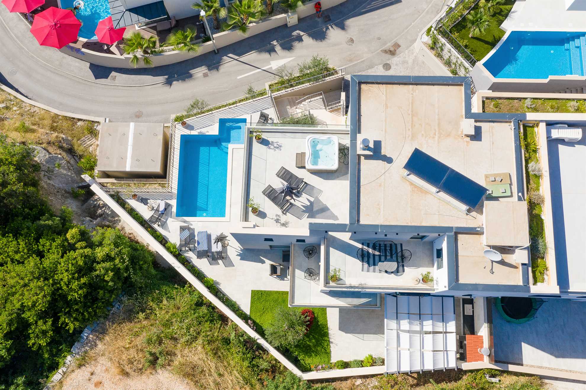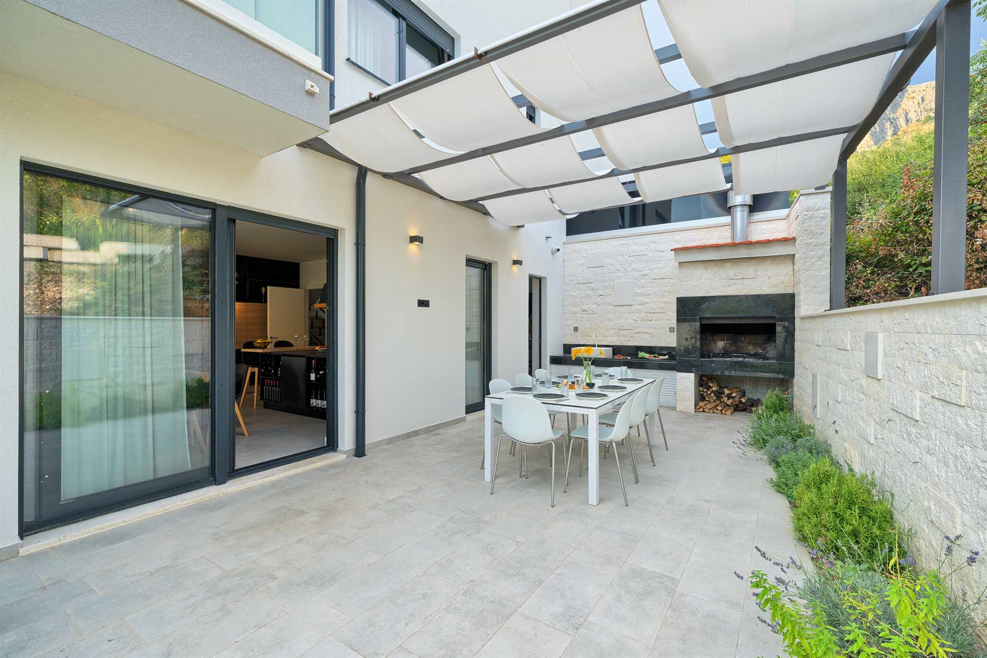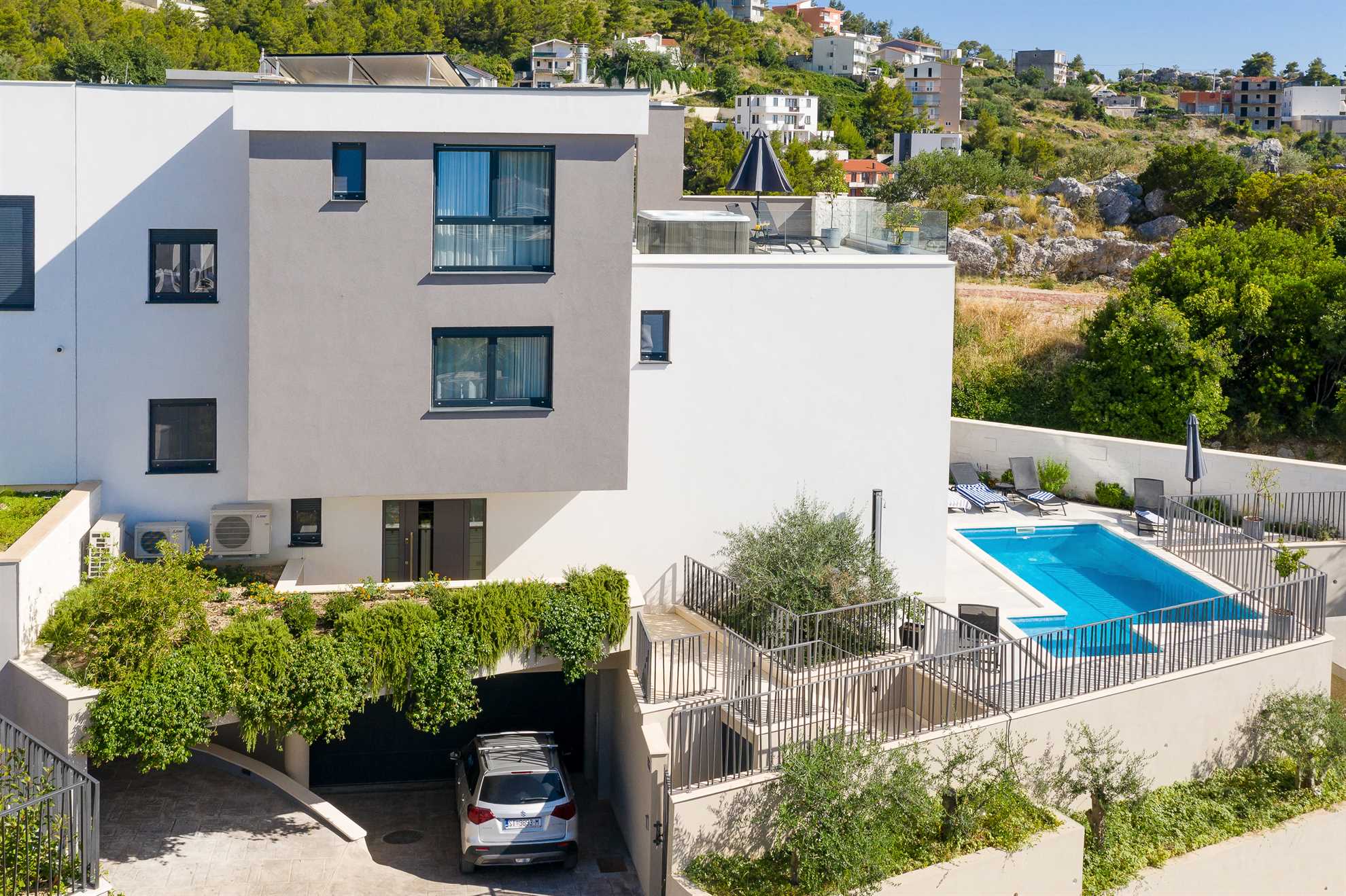 One of a kind 450 m² luxurious villa with a private pool, a sauna and stunning views of the Adriatic located nearby Split, in a picturesque village Podstrana. Beautifully designed, spacious, luminous and inviting living area with unique accents and tastefully decorated walls is equipped with luxurious oversized sofa, a fireplace and a large smart TV. An adjacent fully furnished, contemporary kitchen with a breakfast bar and a dining room completes the space with a sophisticated touch. Villa Pure Leisure is exactly that - pure leisure. Rooftop terrace, equipped with a Jacuzzi, is a perfect spot to enjoy the sunsets, while the downstairs pool deck, surrounded with sun loungers and meticulous garden, offers comfortable seating areas, outdoor dining and an authentic built-in barbecue. A four-car garage is provided for extra security and from here you can take a lift to any of the three floors of the house. Uniquely, the third floor of the house serves as a penthouse with a bedroom, its own living area, a bathroom, a separate kitchen, a terrace and access to the rooftop terrace and may be ideal for those in the family seeking extra privacy. We invite you to enjoy Croatia at its best!