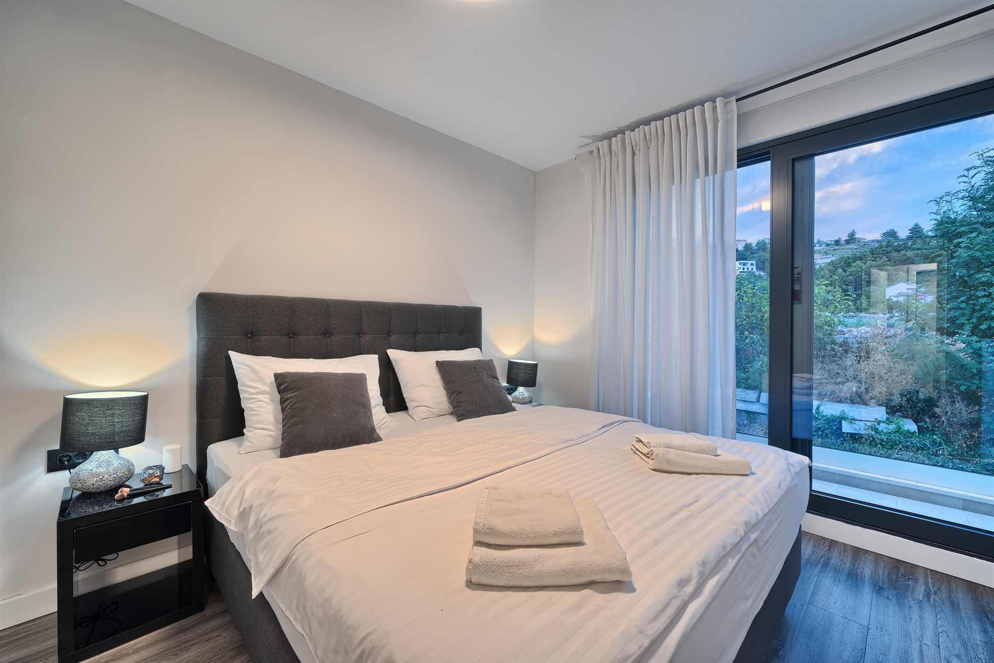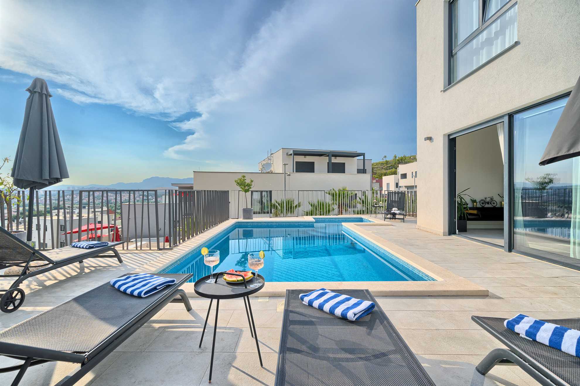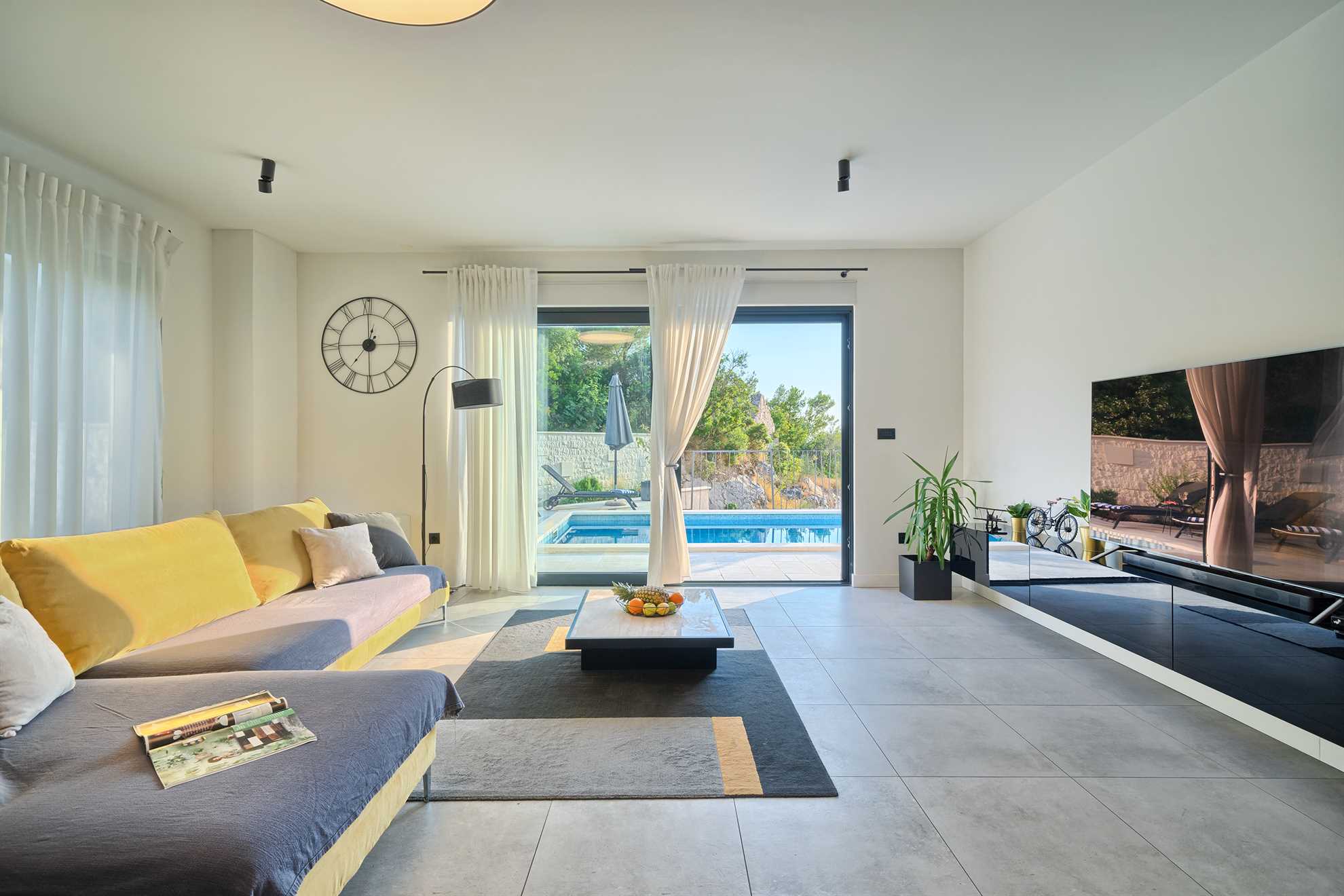 One of a kind 450 m² luxurious villa with a private pool, a sauna and stunning views of the Adriatic located nearby Split, in a picturesque village Podstrana. Beautifully designed, spacious, luminous and inviting living area with unique accents and tastefully decorated walls is equipped with luxurious oversized sofa, a fireplace and a large smart TV. An adjacent fully furnished, contemporary kitchen with a breakfast bar and a dining room completes the space with a sophisticated touch. Villa Pure Leisure is exactly that - pure leisure. Rooftop terrace, equipped with a Jacuzzi, is a perfect spot to enjoy the sunsets, while the downstairs pool deck, surrounded with sun loungers and meticulous garden, offers comfortable seating areas, outdoor dining and an authentic built-in barbecue. A four-car garage is provided for extra security and from here you can take a lift to any of the three floors of the house. Uniquely, the third floor of the house serves as a penthouse with a bedroom, its own living area, a bathroom, a separate kitchen, a terrace and access to the rooftop terrace and may be ideal for those in the family seeking extra privacy. We invite you to enjoy Croatia at its best!