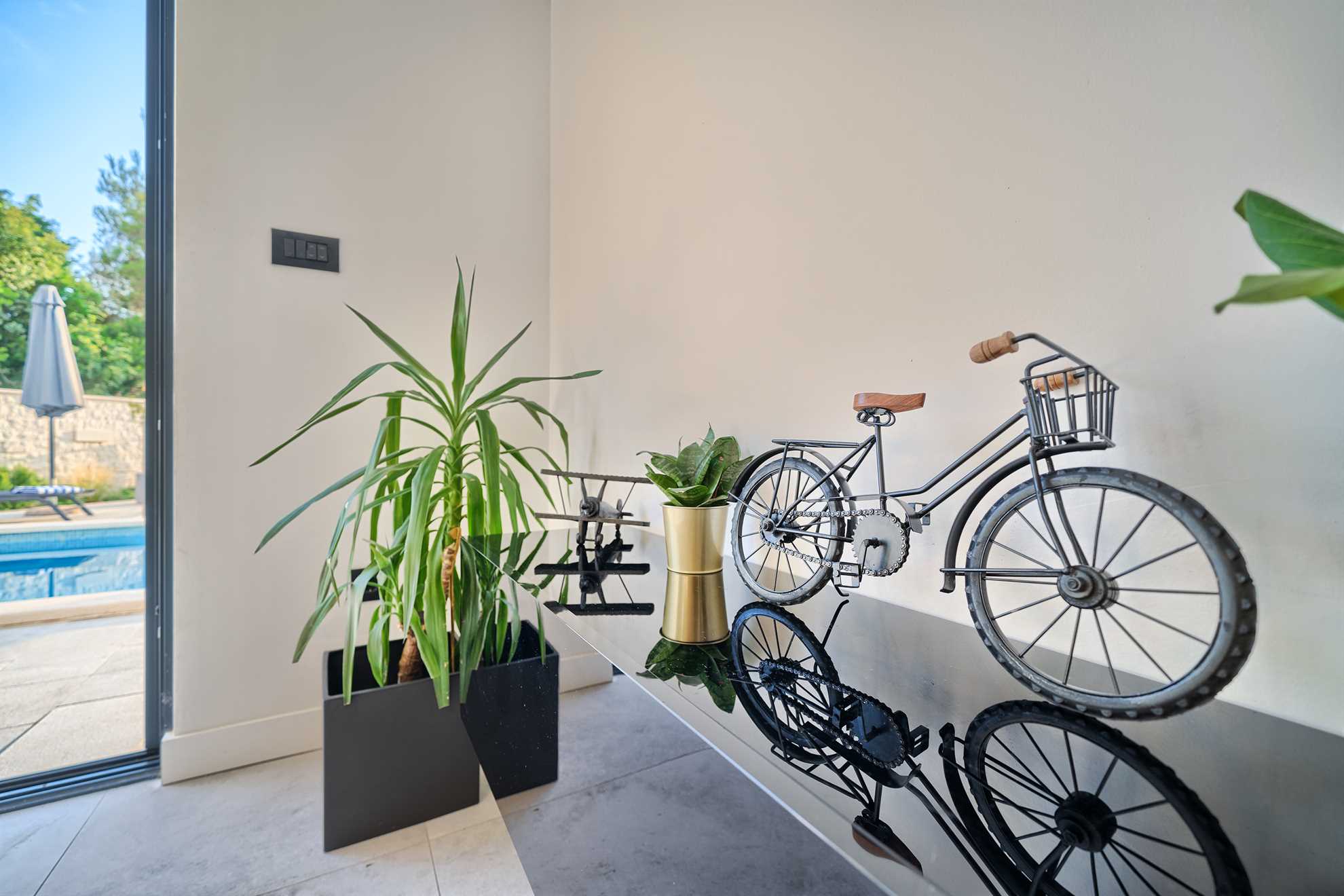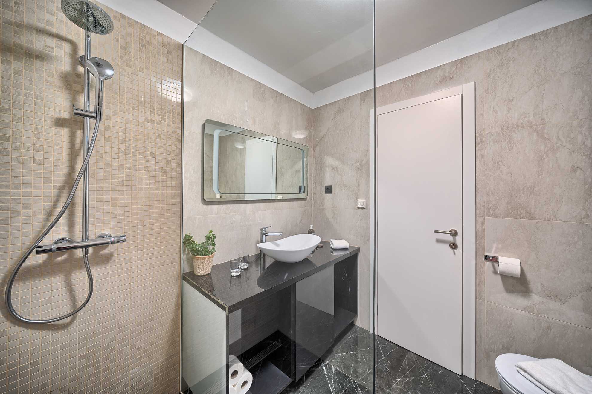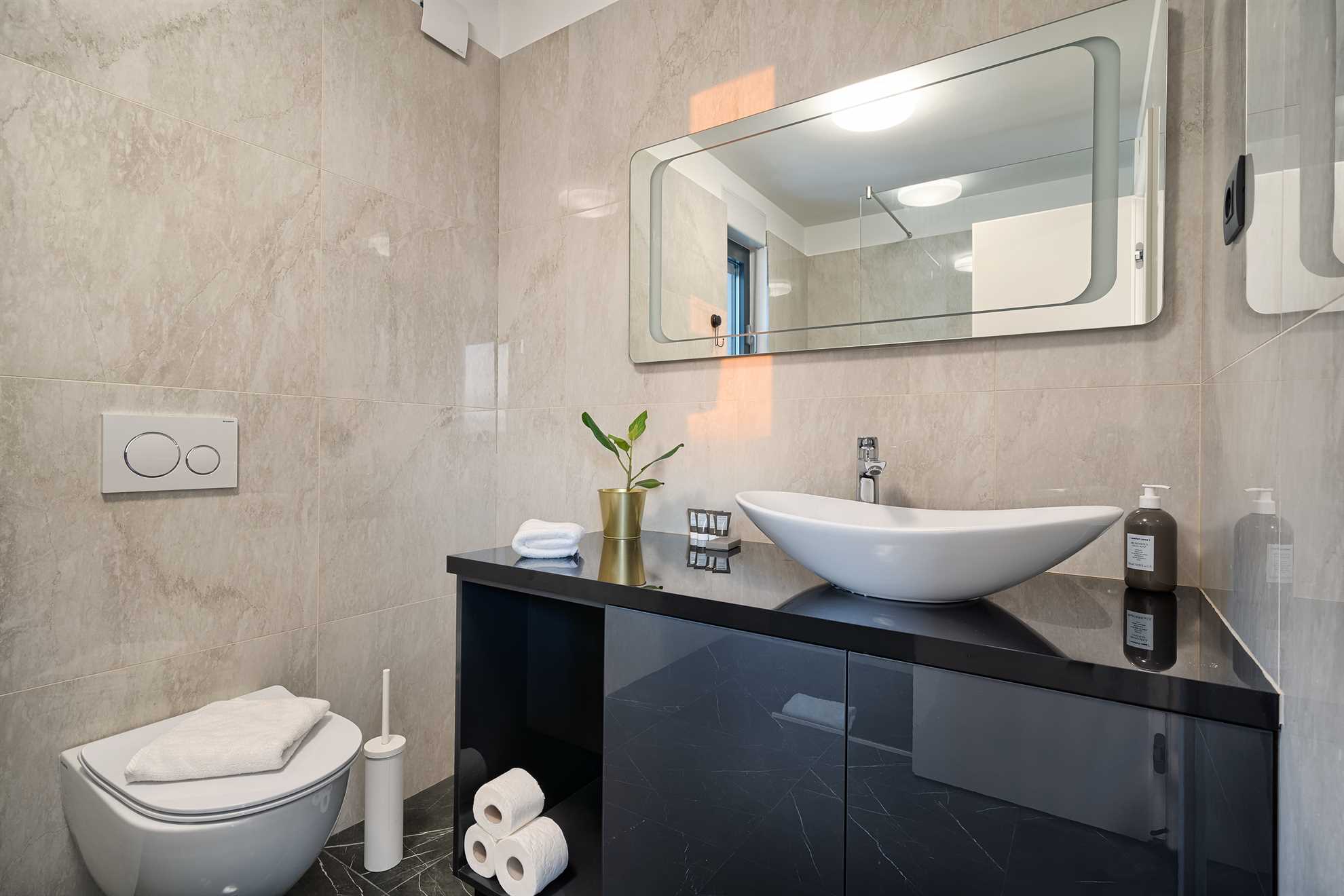 With five en-suite double bedrooms 10 adult guests are comfortably accommodated. Rooms, with walk-in closets, are beautifully decorated with creative wall art, subtle but modern light fixtures while charming bathrooms show of elegant design with wood tones and soft black textures that dominate this exquisite villa.