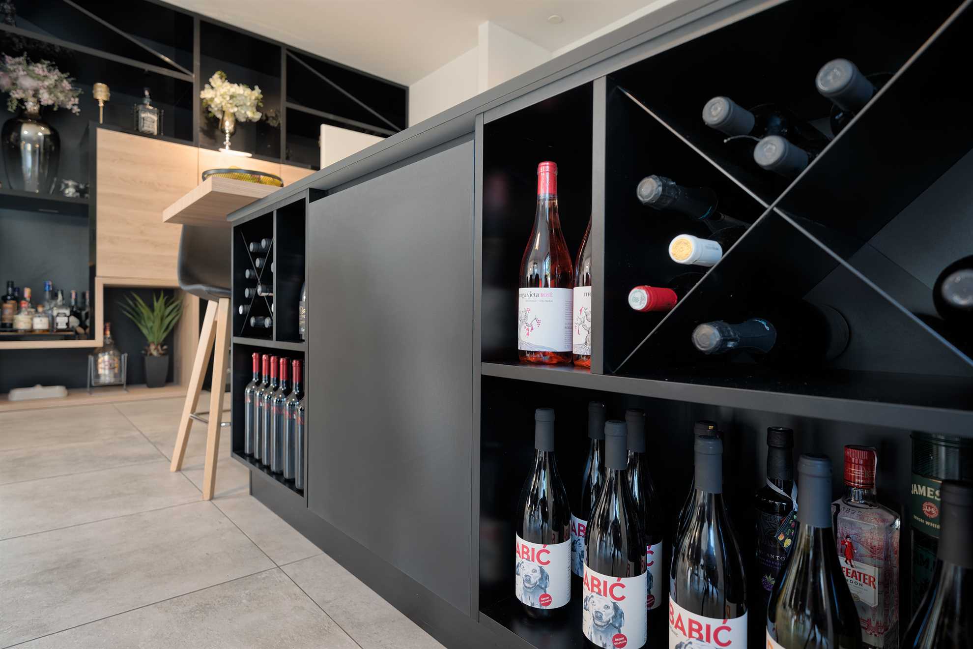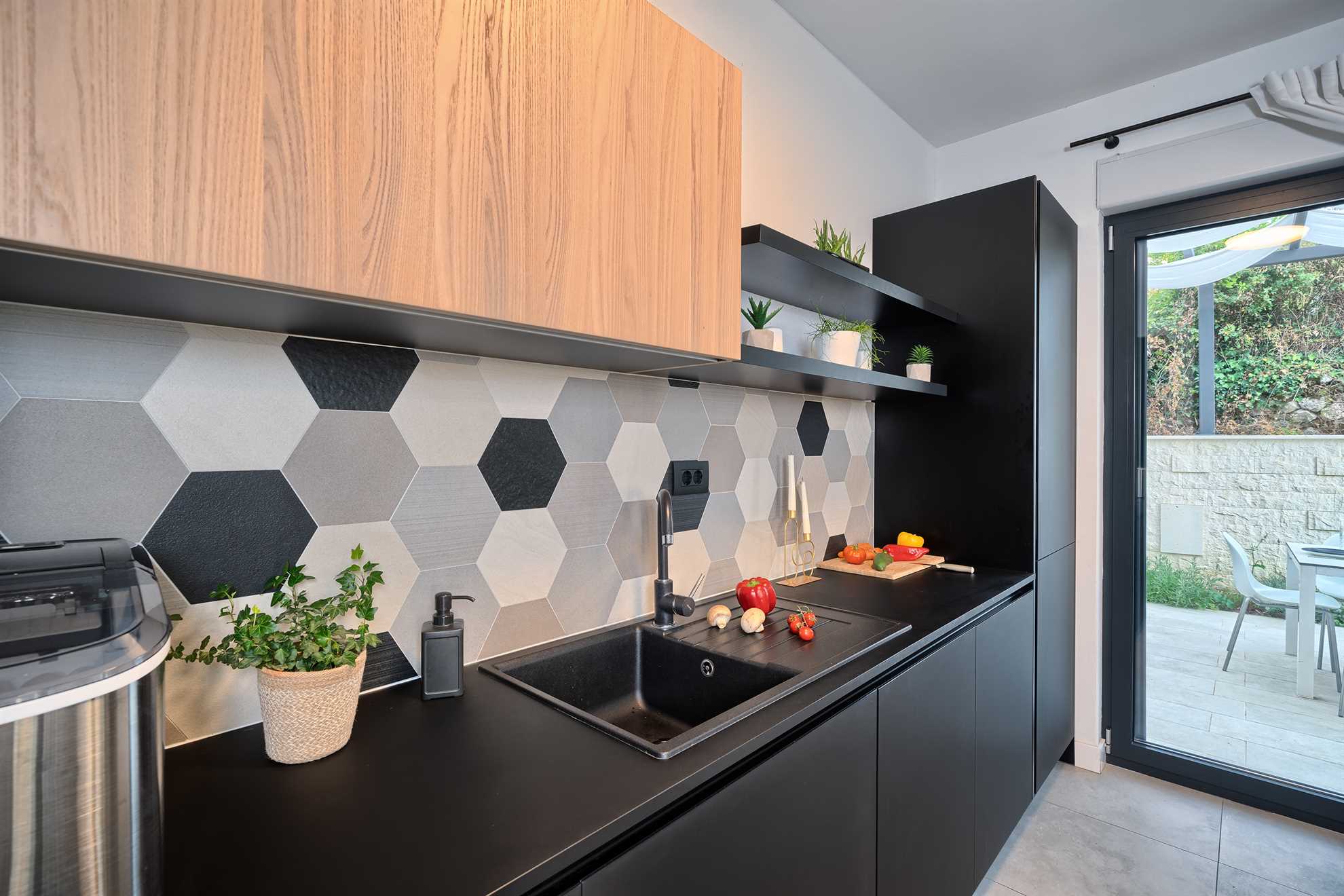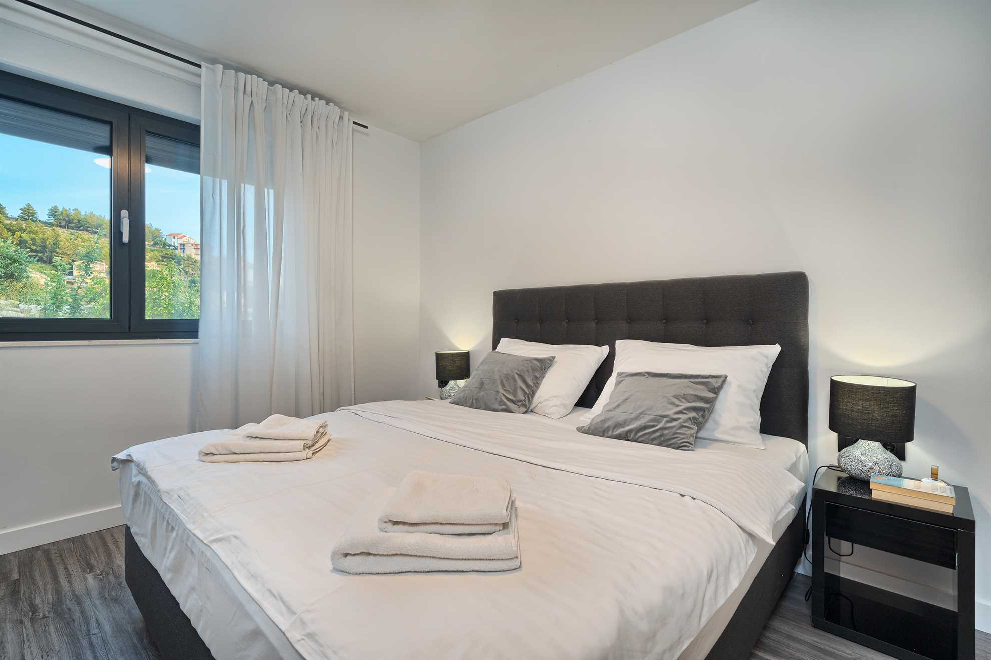 With five en-suite double bedrooms 10 adult guests are comfortably accommodated. Rooms, with walk-in closets, are beautifully decorated with creative wall art, subtle but modern light fixtures while charming bathrooms show of elegant design with wood tones and soft black textures that dominate this exquisite villa.