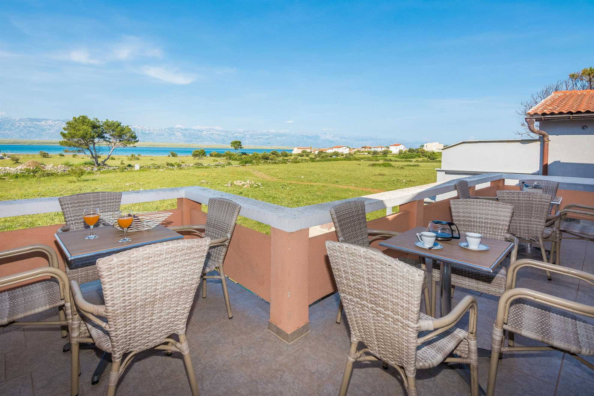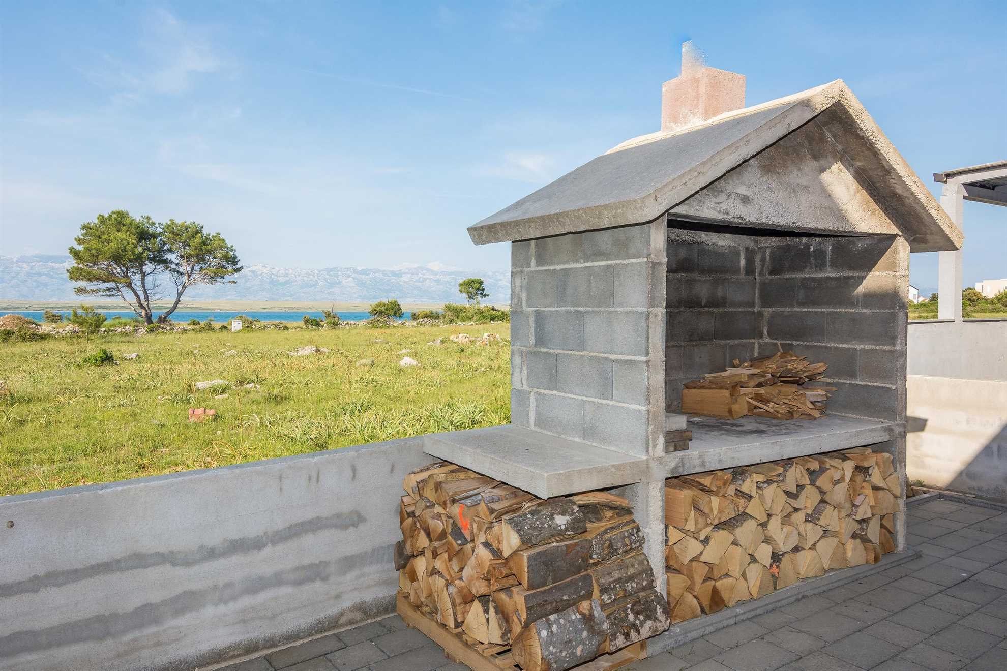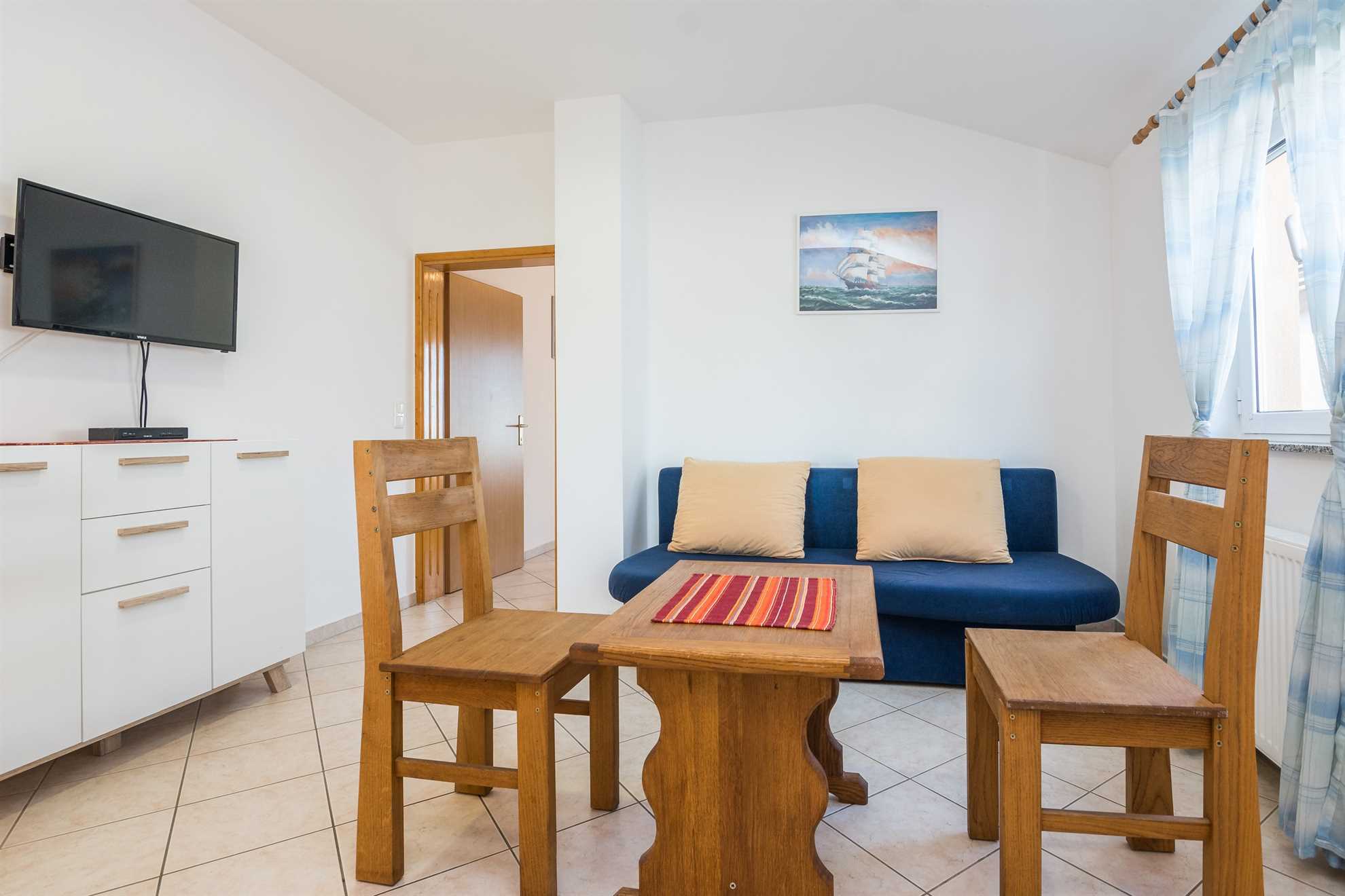 This apartment is located in a quiet area of the island of Vir called Virić. The apartment is about 300m from the pebble beach and can accommodate 2-4 persons.The 45 m2 apartment is on the first floor of the house and is divided into a living area with kitchen, a bedroom with double bed and a bathroom with shower and toilet. In the living room there is a sofa bed for two more persons. To the apartment belong two 10m2 common balconies, equipped with table and chairs. Air conditioning, Internet access, satellite TV, barbecue, parking on the property as well as bed linen and towels are among other facilities and without surcharge.