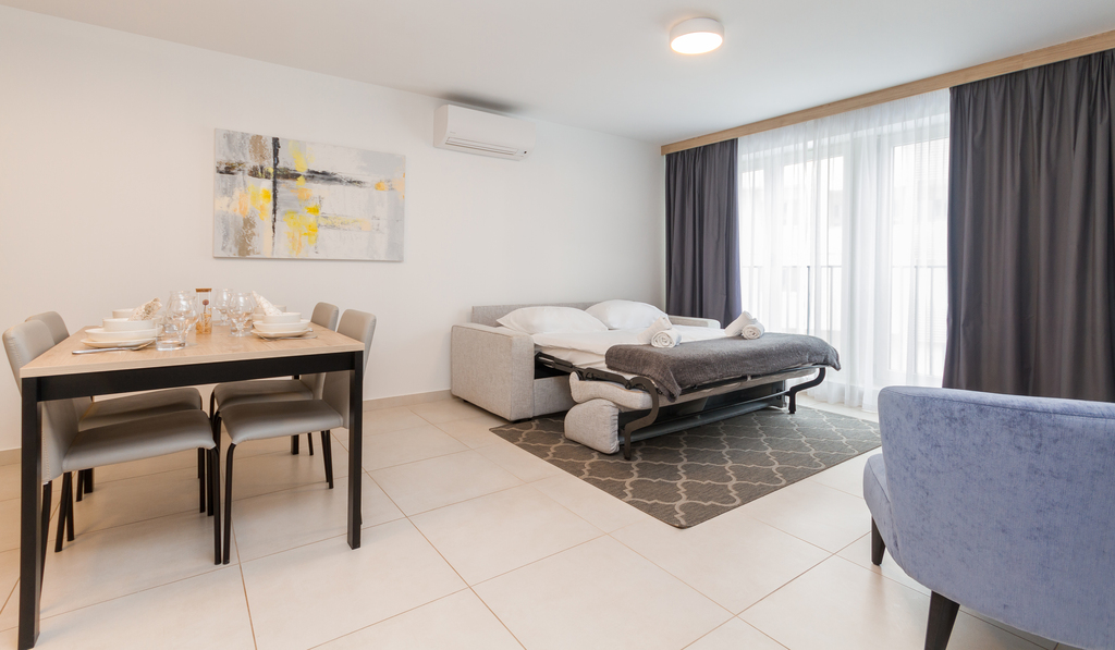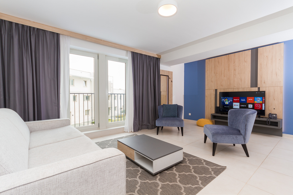 This modern apartment can accommodate 2 people in a permanent bed and 2 people on an additional bed prepared in the living room. It is especially popular among couples and families. There is also a shared pool available for all guests of the Garden Palace tourist facility.