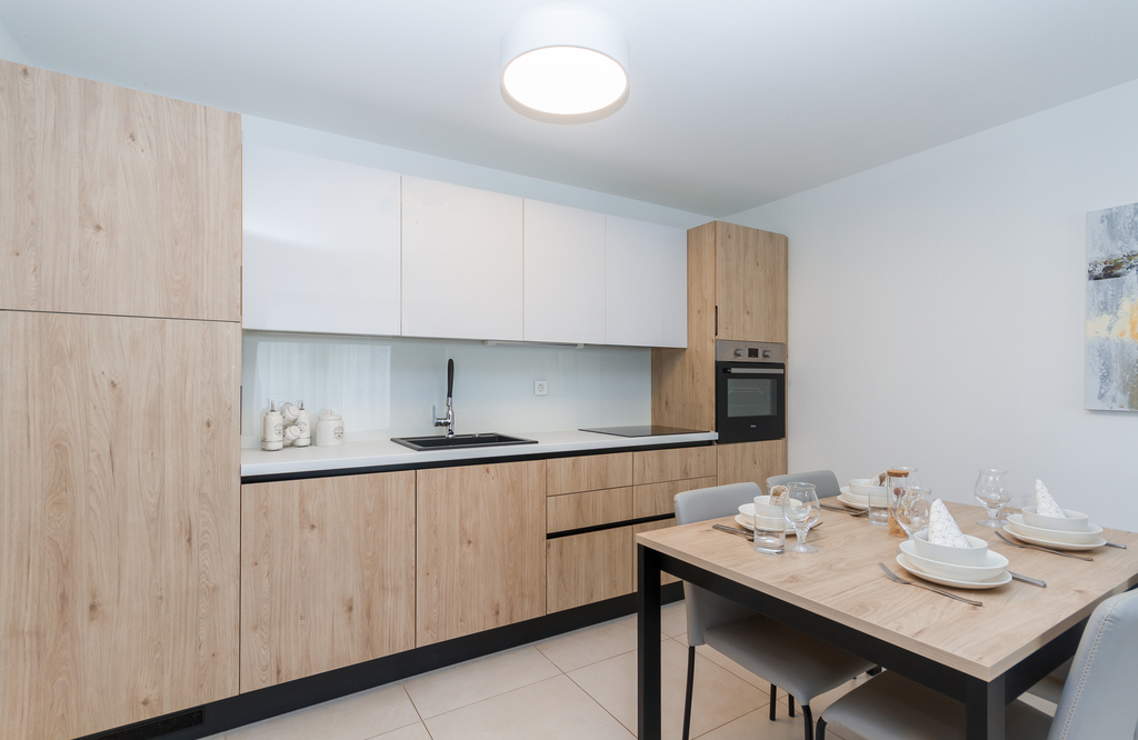 The living room has a comfortable sofa set, two armchairs, a coffee table, and a flat-screen TV. The sofa can be extended into an additional bed. The dining area and kitchen are spatially connected to the living room. The kitchen has clean lines and a long counter. Fully equipped with an oven, dishwasher, coffee maker, and other necessary utensils, it provides a comfortable stay. The apartment features a combination of wood and gray tones, enhanced with wall paintings.