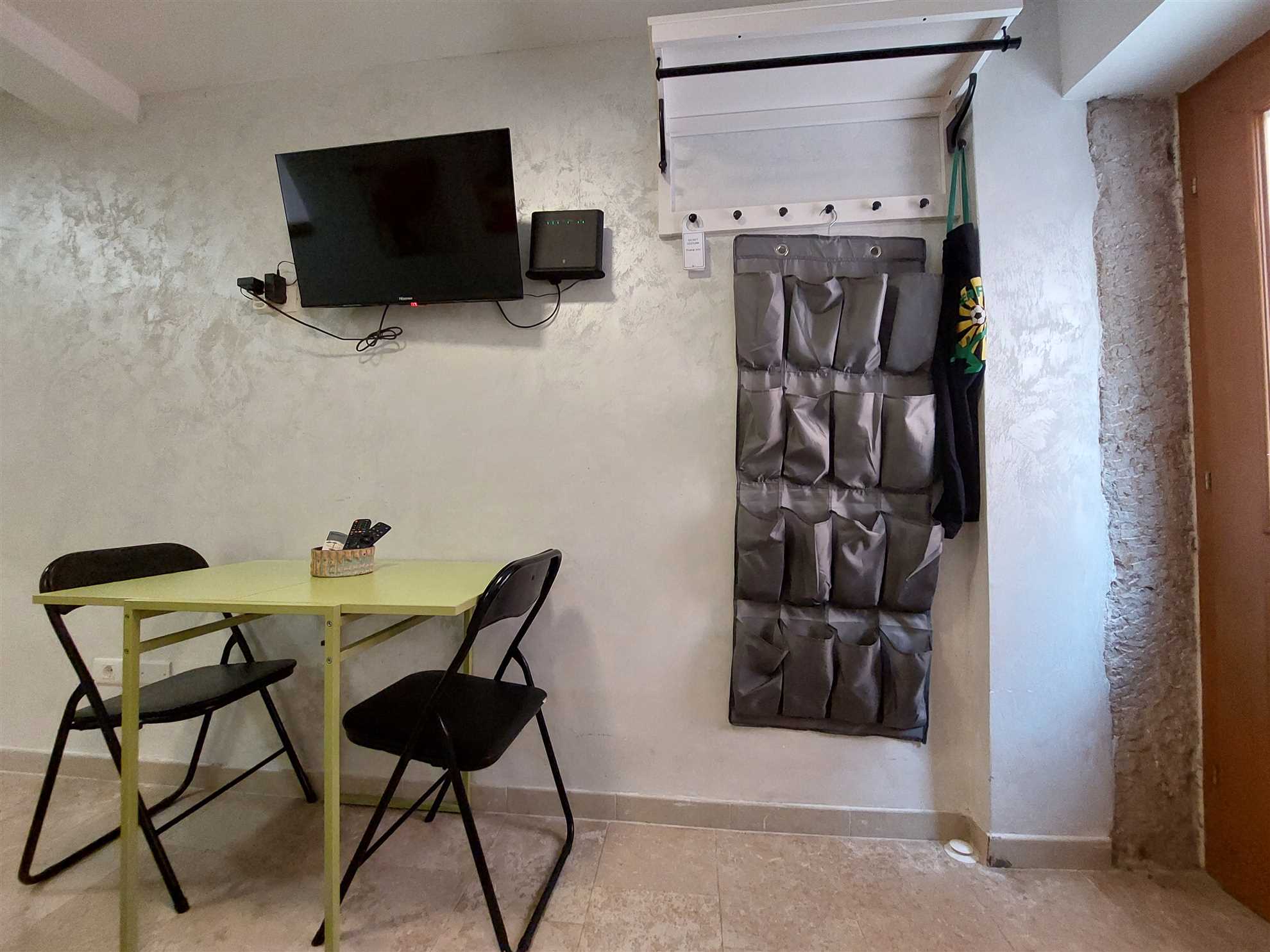 Step into a stylish living area, dedicated to your comfort and relaxation. Even though there are no designated bedrooms, this studio apartment blends convenience and comfortableness to ensure a restful night for its occupant. And the outdoor table and chairs invite you to blend in with the events in the center of Rovinj, exploring and relaxing at the same time.