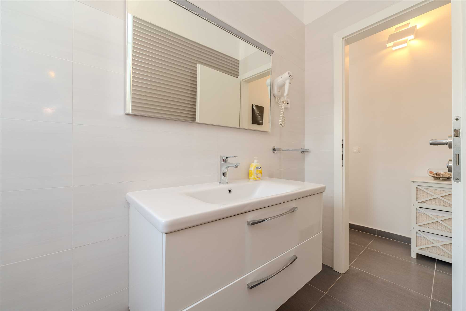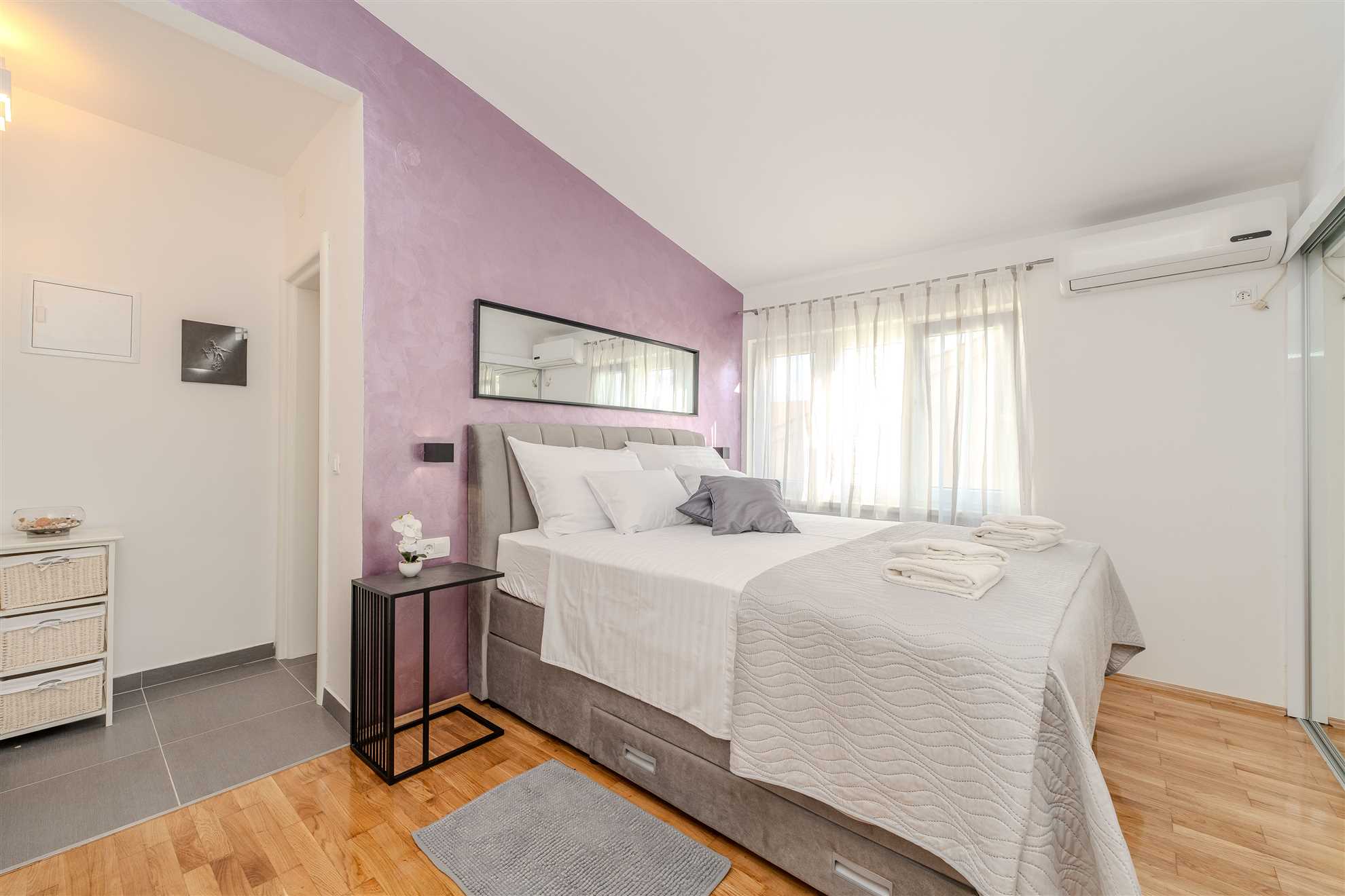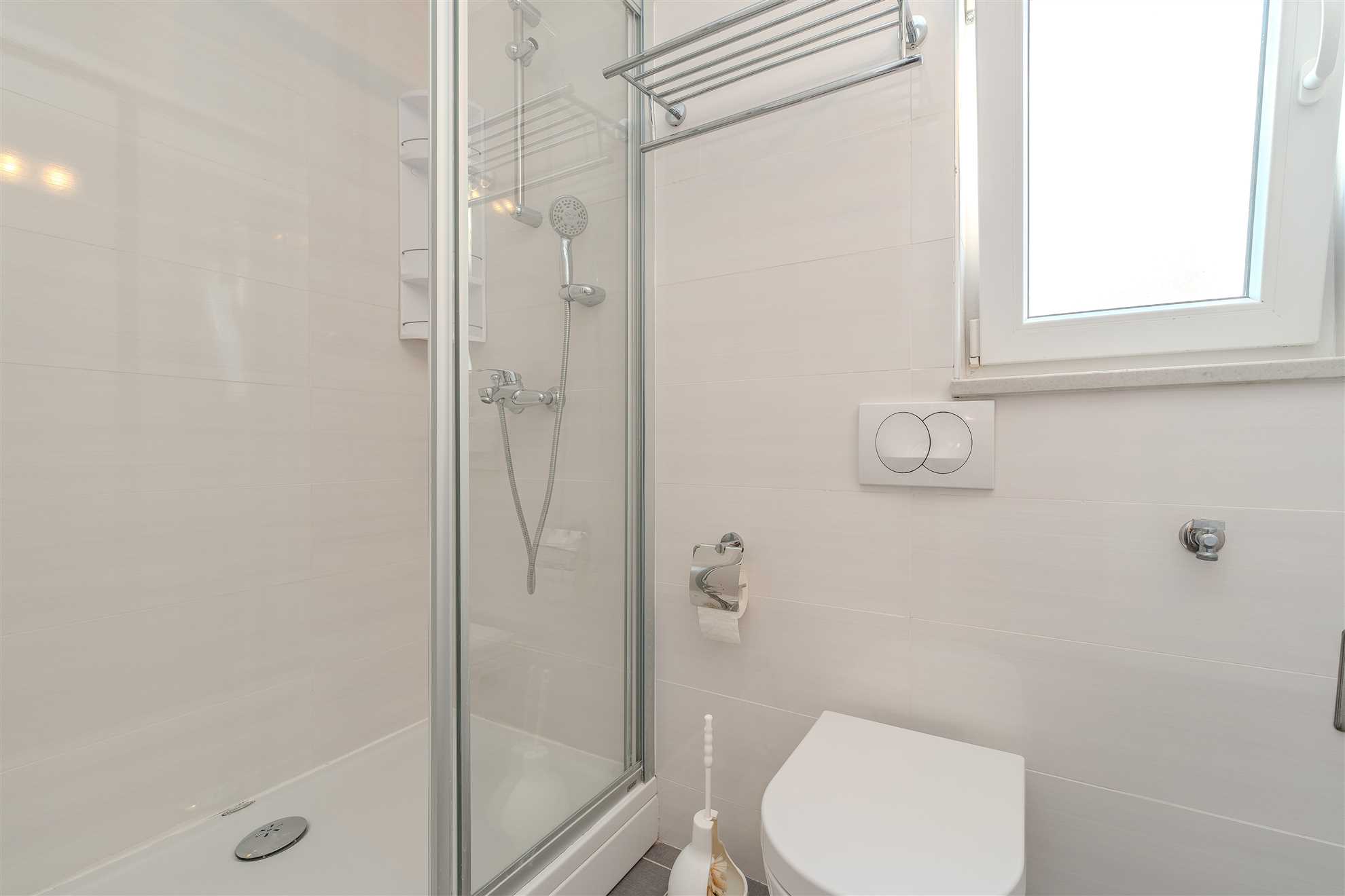 Apartment (70 m²) is divided on a living room with a dining area, fully equipped kitchen, two bedrooms with double beds, of which one is air-conditioned and two bathrooms with showers. To the apartment belongs a 22 m² roofed balcony with sea view, loungers, table and chairs. Courtyard (900 m²) of the property is equipped with barbecue, table and chairs.