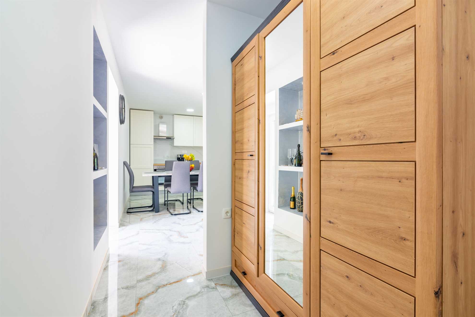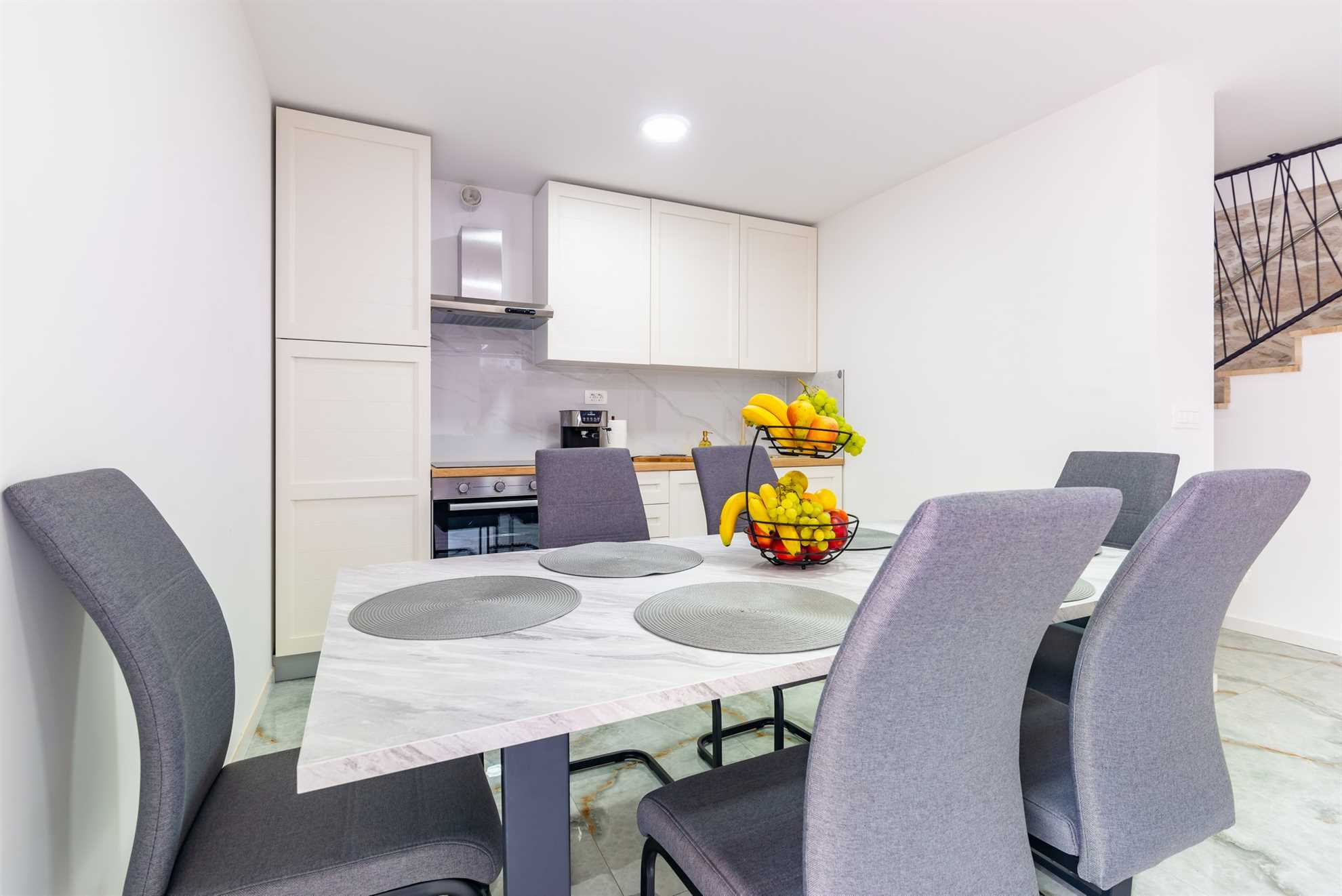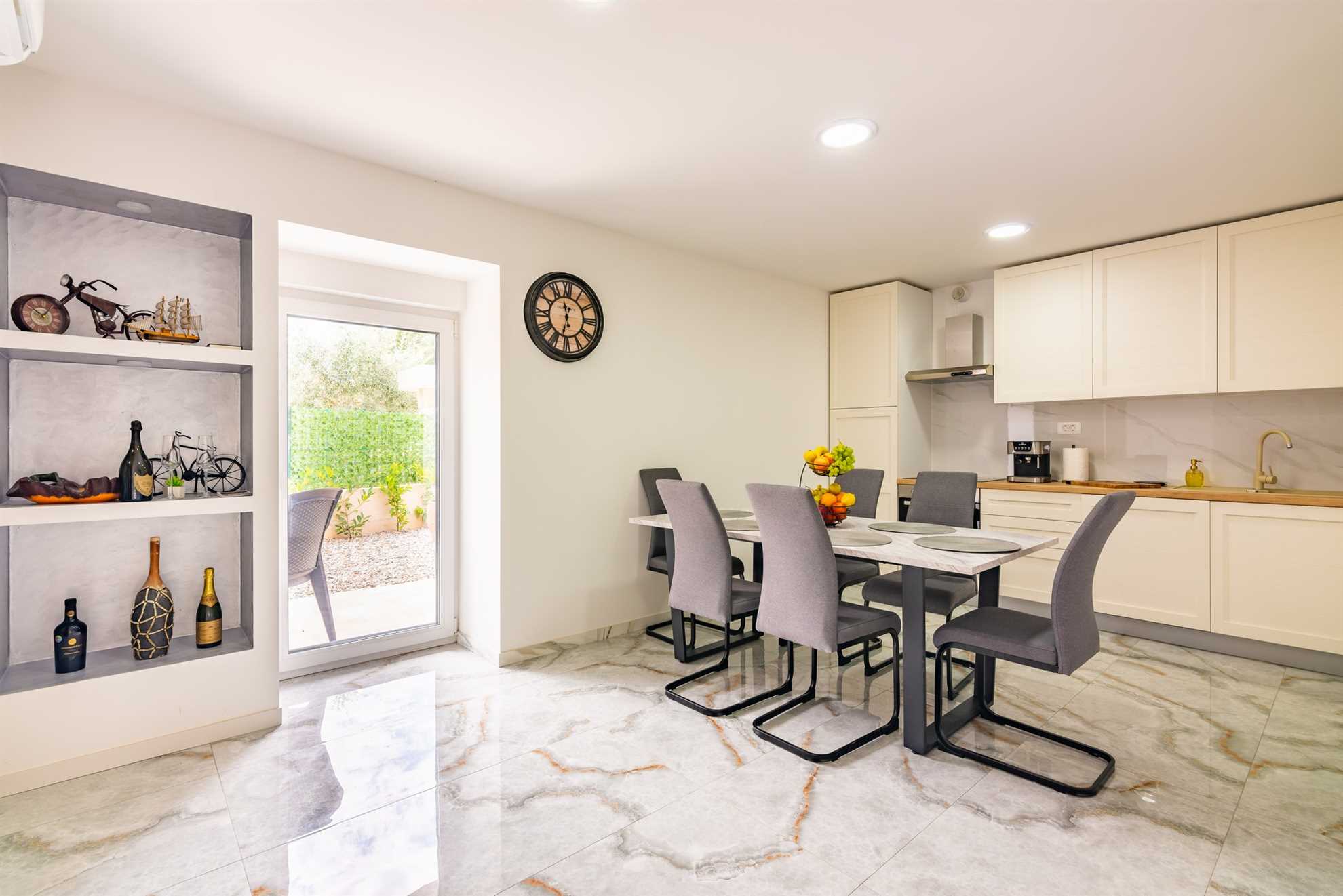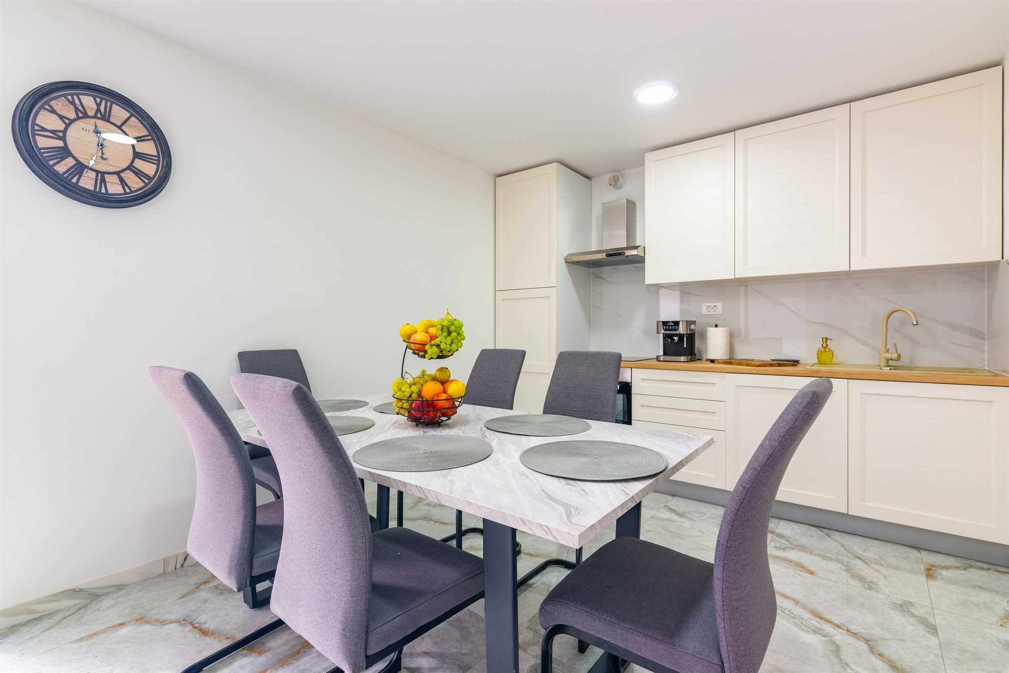 The kitchen is fully equipped with modern appliances and all the utensils you need to prepare delicious meals. Whether you're cooking a full dinner or just whipping up a quick snack, you'll find everything you need at your fingertips. The adjacent dining area features a stylish table where you can enjoy meals together, creating memories over shared conversations and local delicacies. A guest toilet is also conveniently located on the ground floor.