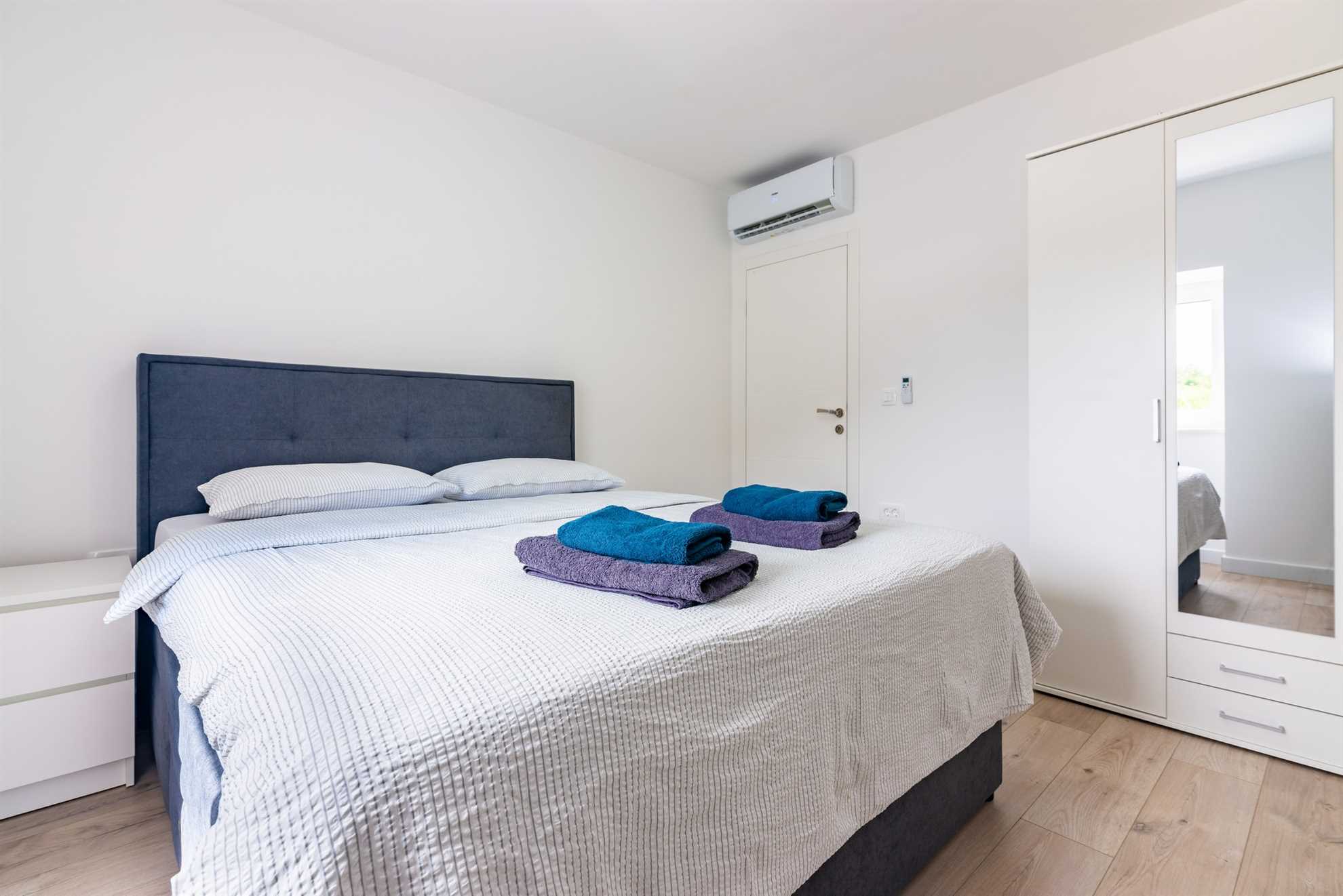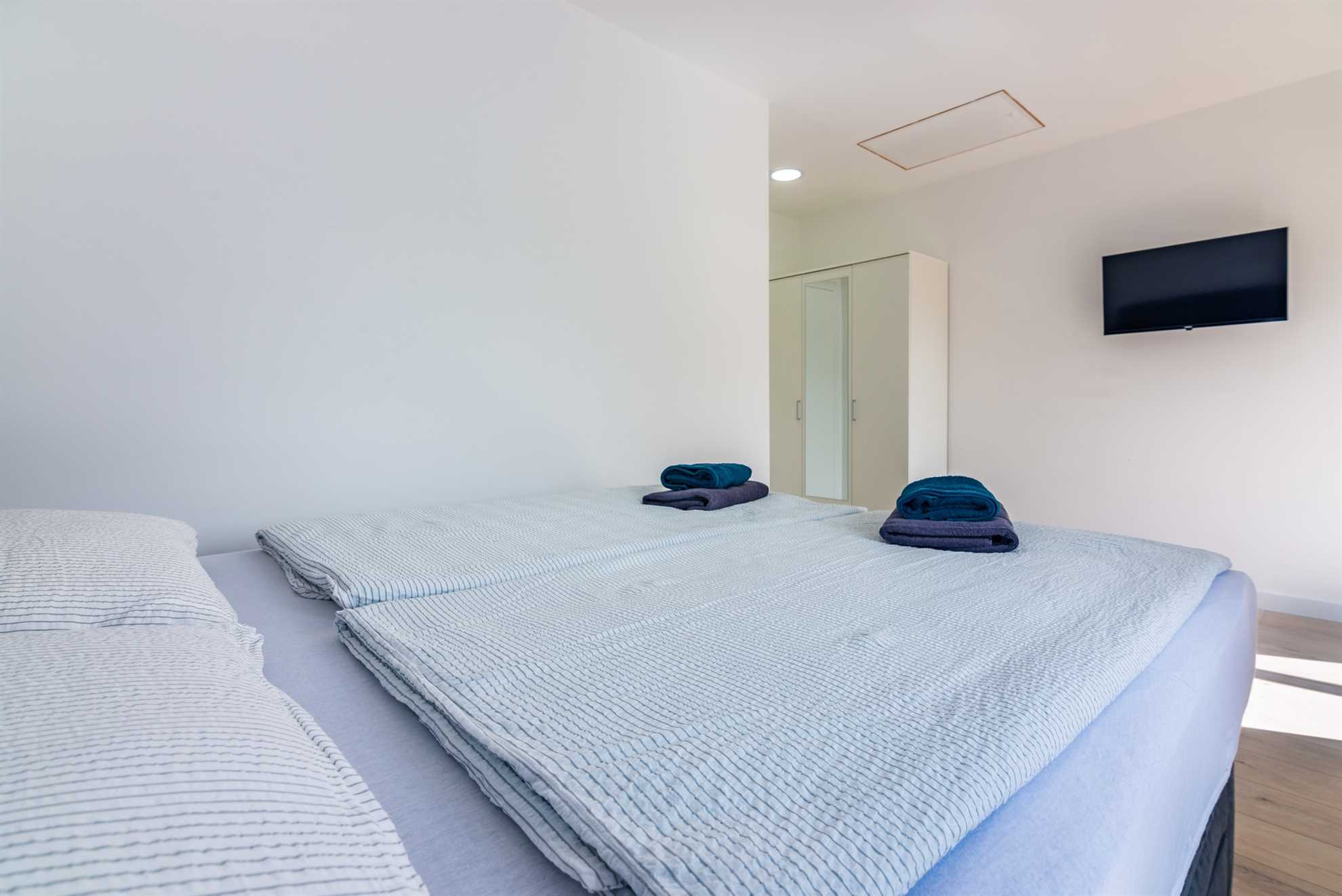 Villa Old Stone offers three thoughtfully designed bedrooms on the first floor, providing ample space and comfort for all guests. The first two bedrooms are equipped with king-size beds, ensuring a restful night’s sleep. Each of these bedrooms also features its own television, air conditioning, and a private balcony. These balconies offer a lovely spot to enjoy your morning coffee while taking in the fresh air and peaceful views.