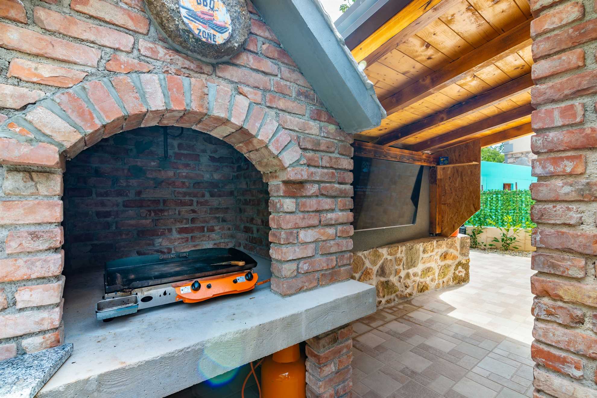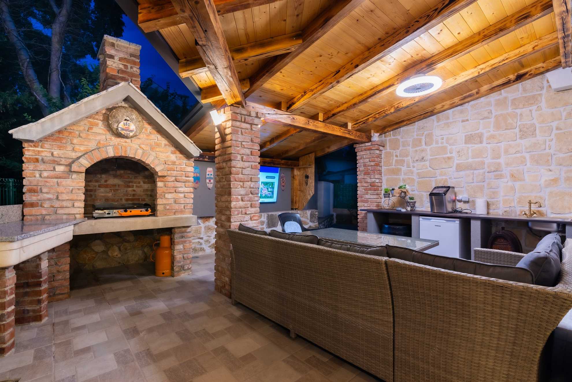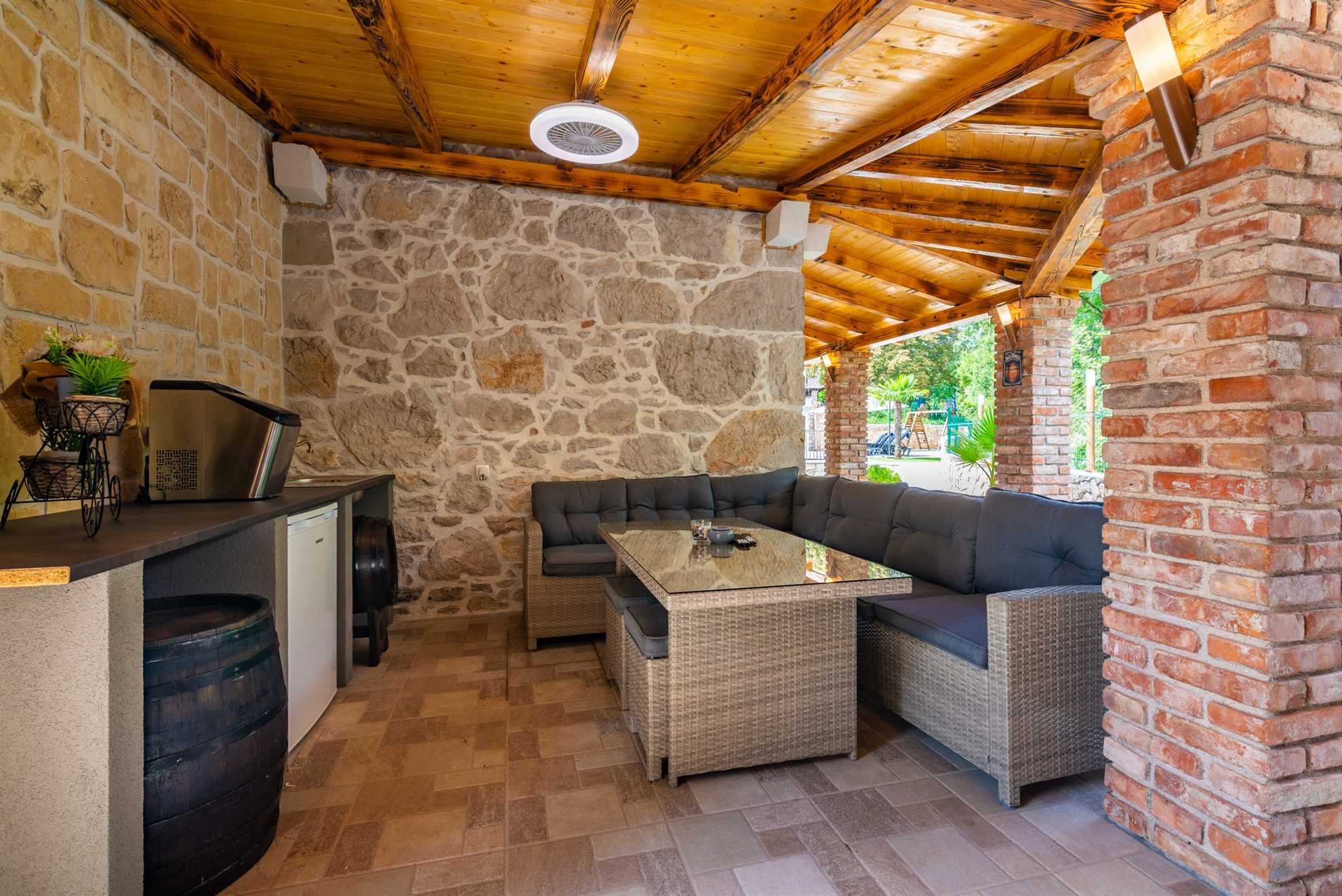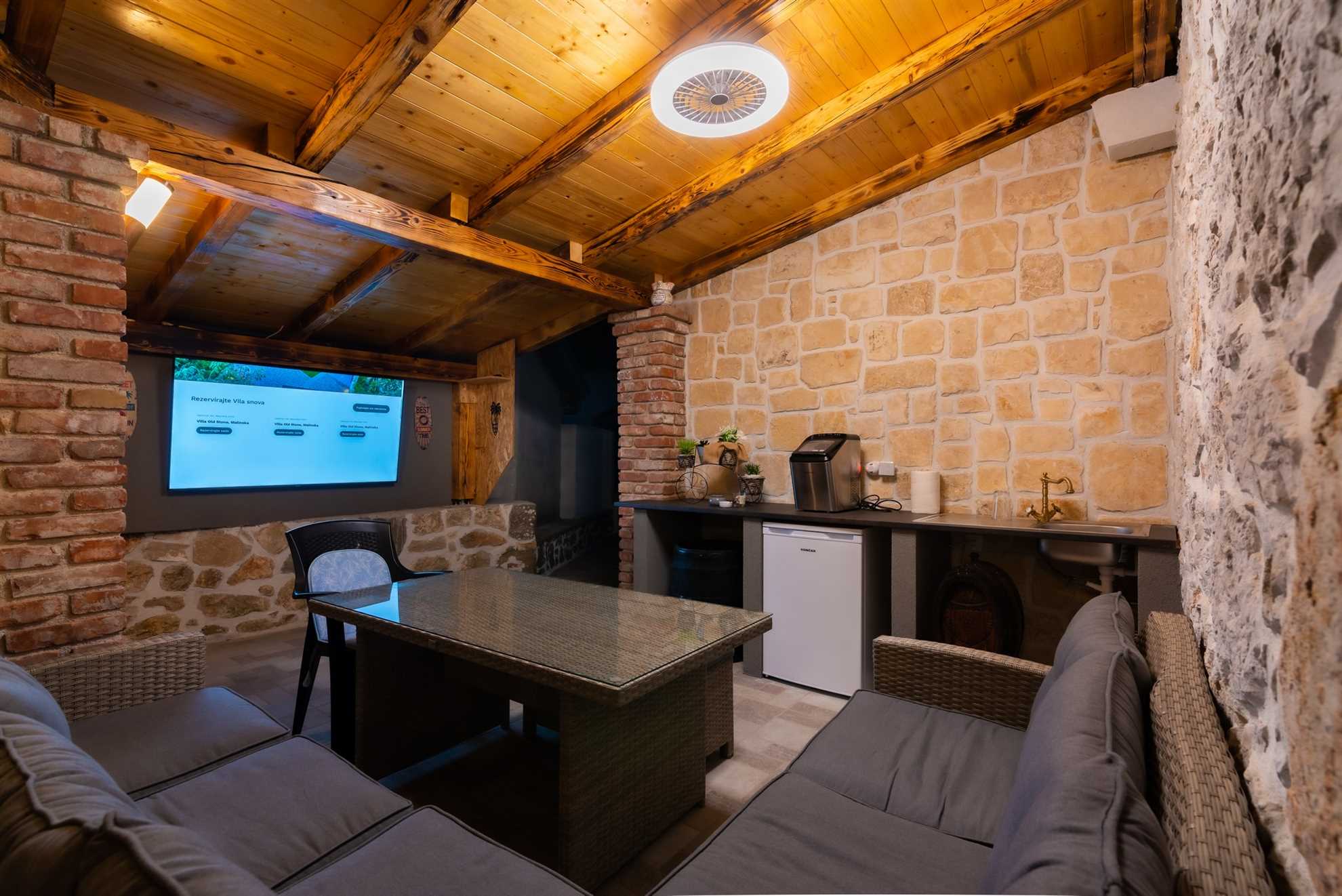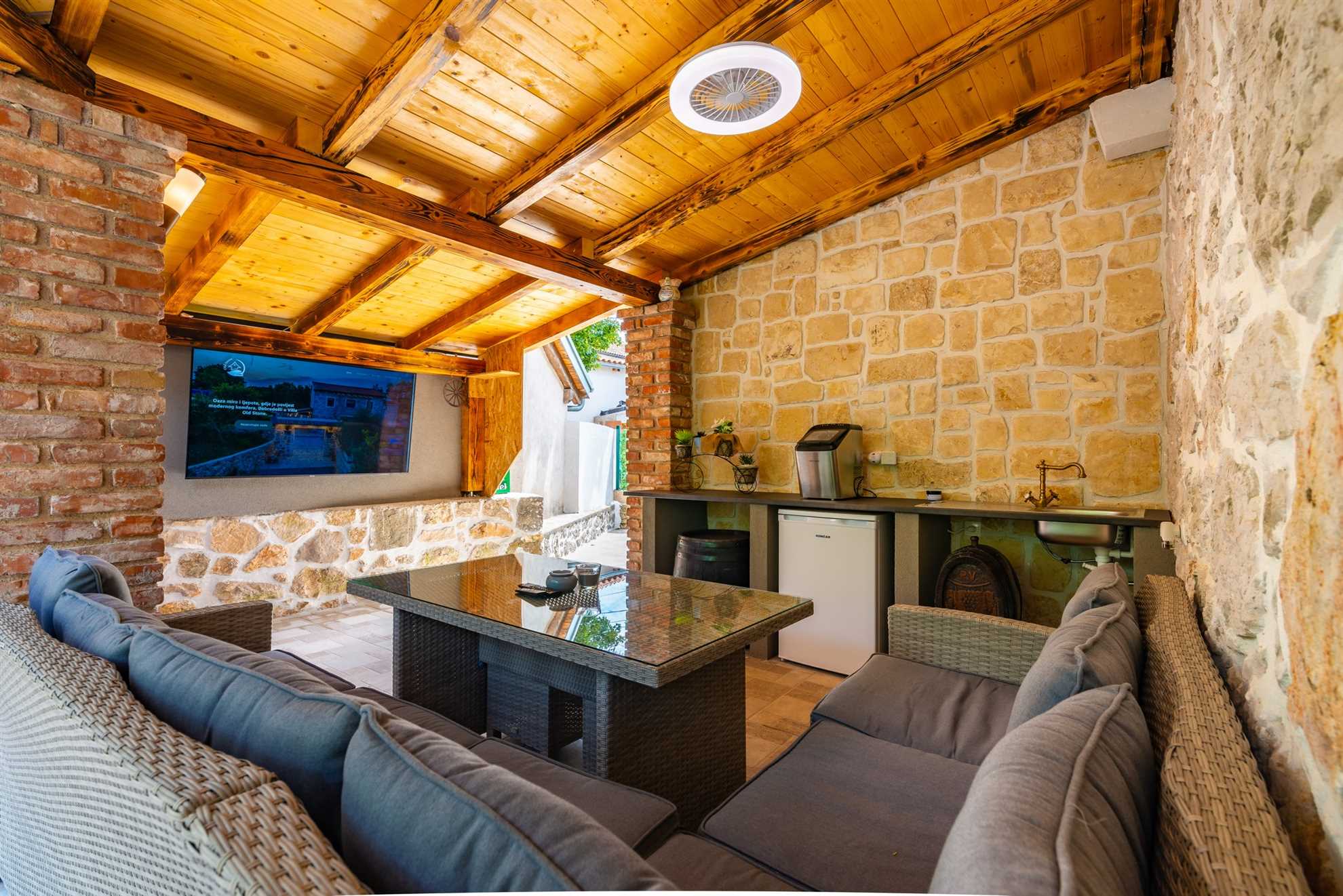 The outdoor area of Villa Old Stone is a true highlight, designed to offer both relaxation and entertainment. The large, shaded terrace is perfect for enjoying al fresco dining or simply unwinding with a good book. The terrace is equipped with a dining table that comfortably seats your entire group, as well as lounge furniture where you can relax and soak in the tranquil surroundings. For those who enjoy cooking and dining outdoors, the villa boasts an outdoor kitchen, complete with a stone grill and a television, allowing you to prepare and enjoy meals under the open sky.
