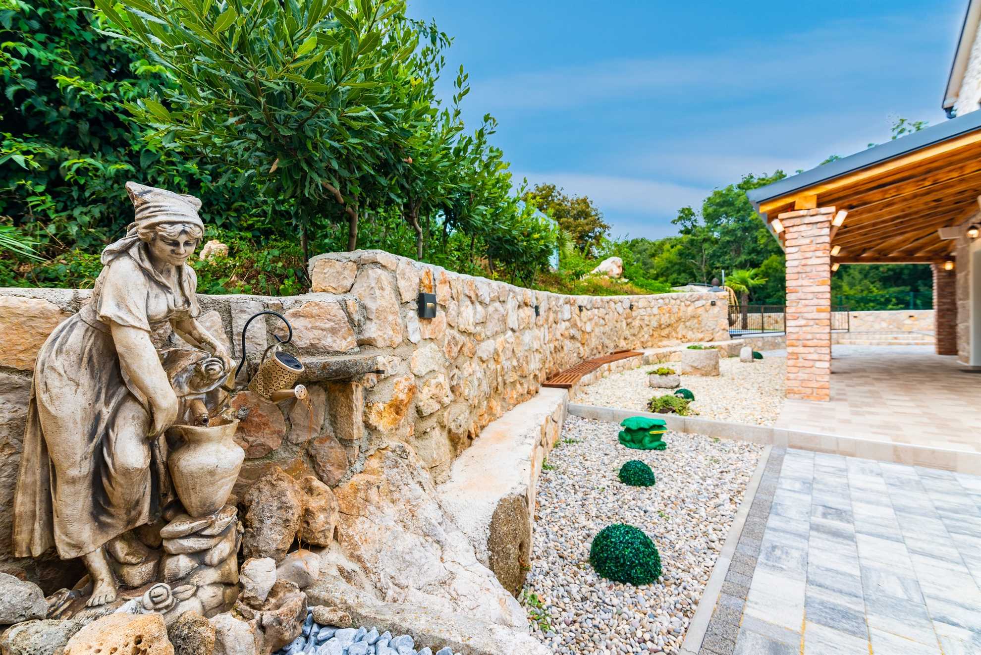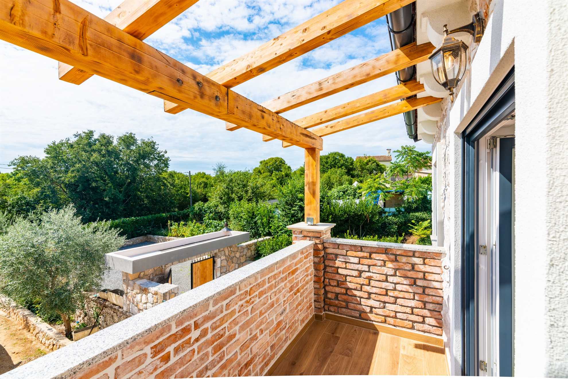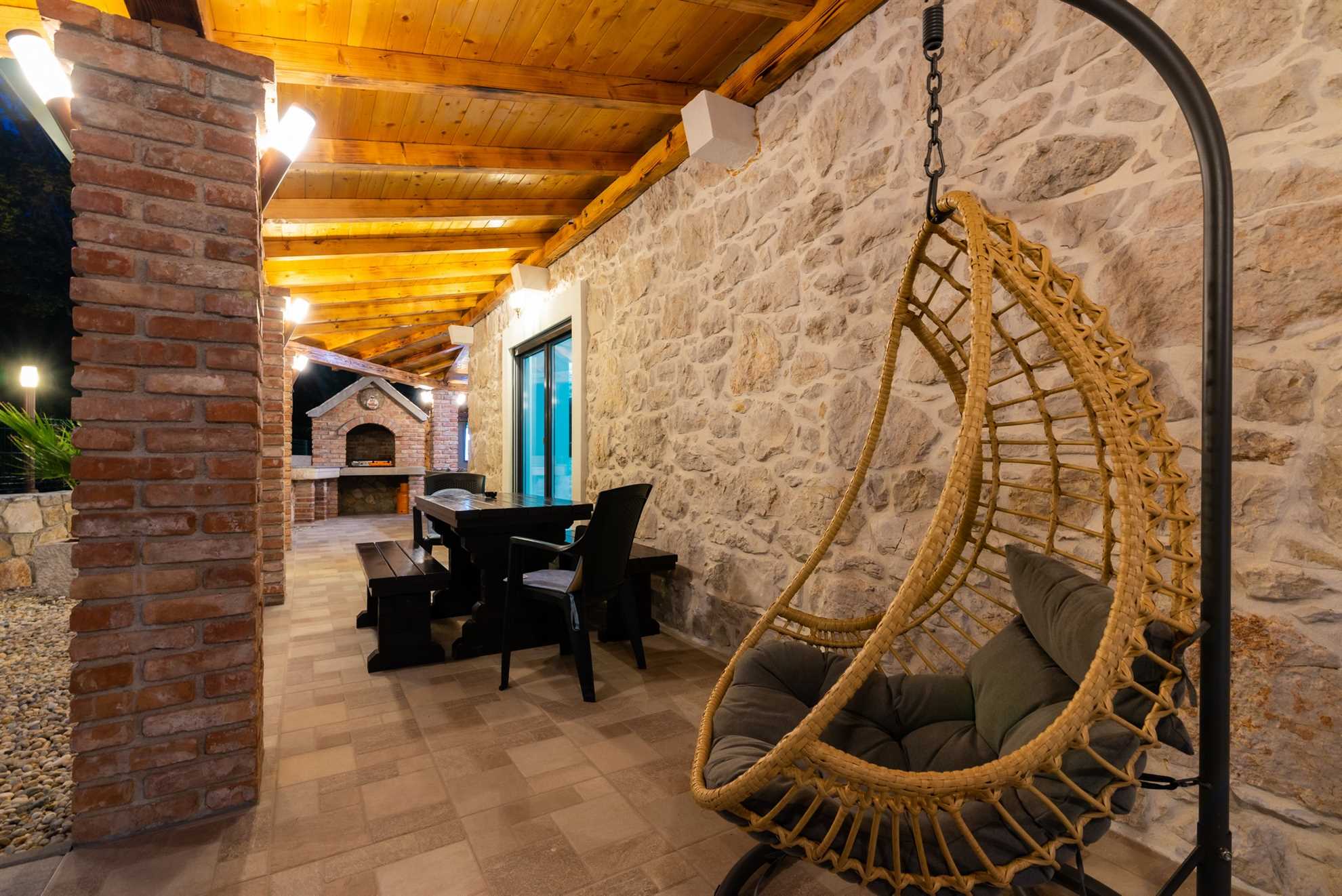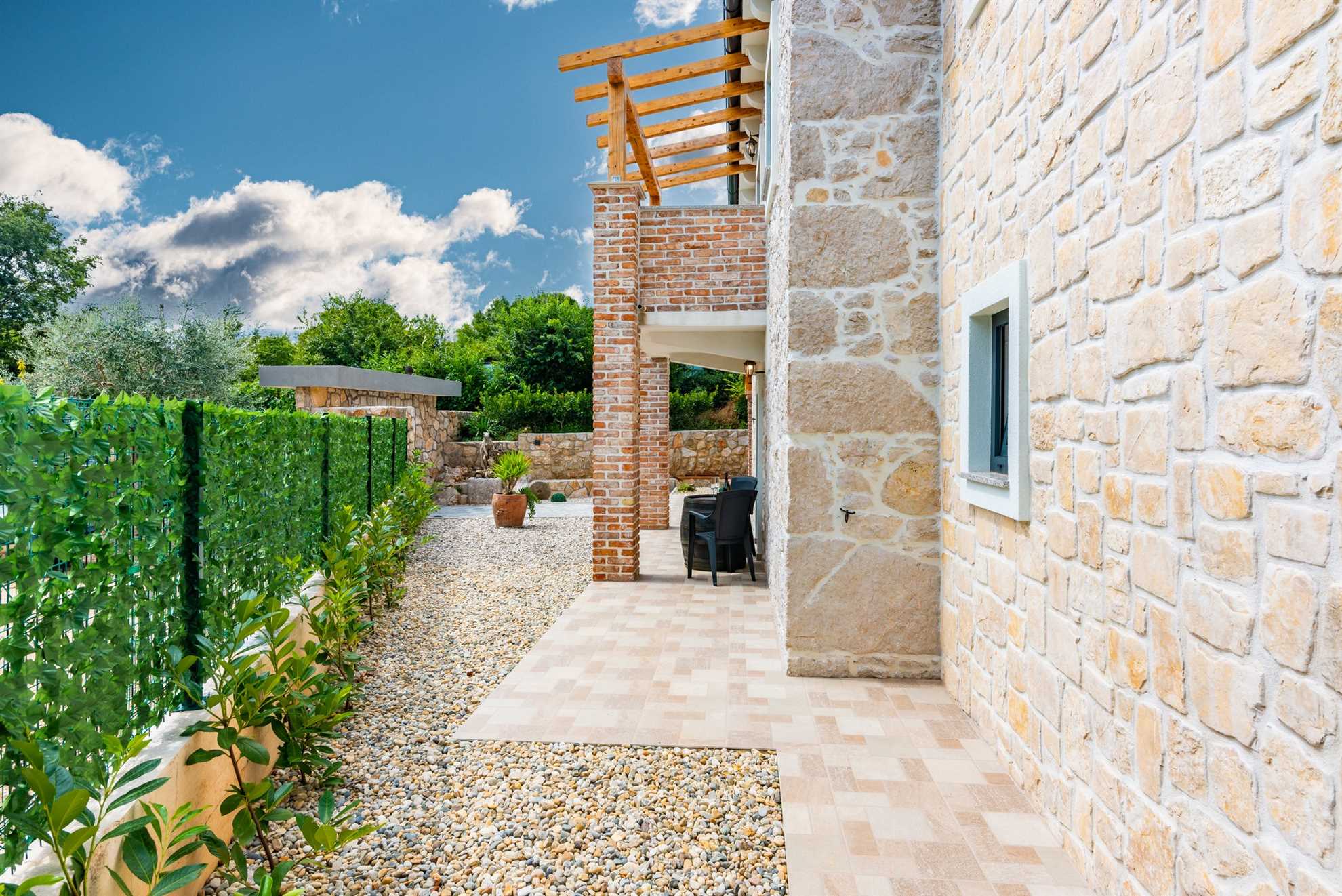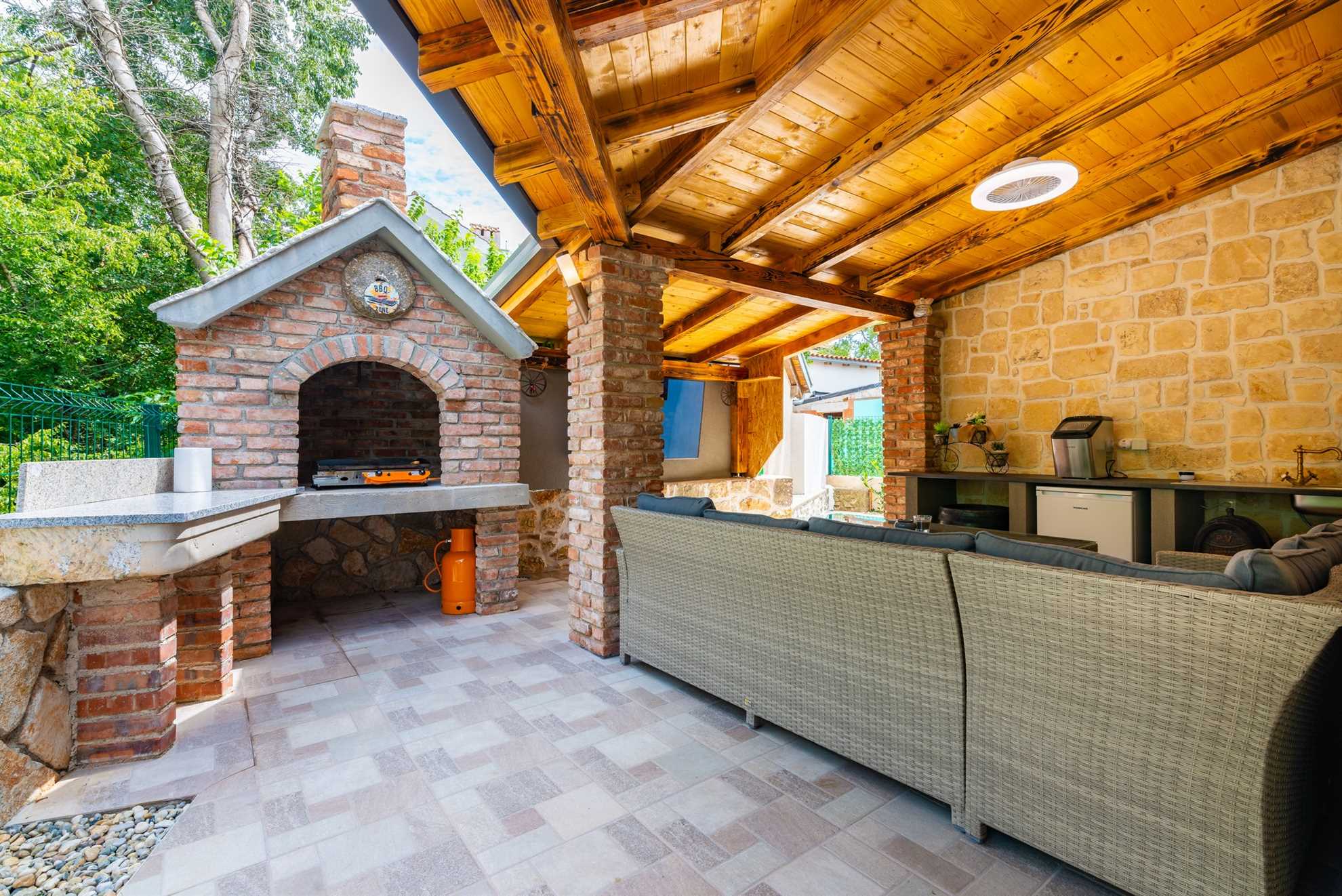 The outdoor area of Villa Old Stone is a true highlight, designed to offer both relaxation and entertainment. The large, shaded terrace is perfect for enjoying al fresco dining or simply unwinding with a good book. The terrace is equipped with a dining table that comfortably seats your entire group, as well as lounge furniture where you can relax and soak in the tranquil surroundings. For those who enjoy cooking and dining outdoors, the villa boasts an outdoor kitchen, complete with a stone grill and a television, allowing you to prepare and enjoy meals under the open sky.