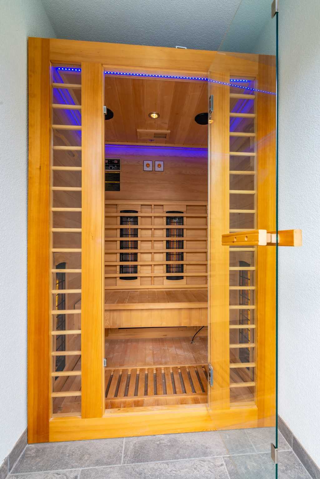 The centerpiece of the outdoor space is the private pool, where you can cool off on warm summer days or take a leisurely swim at your own pace. The pool area is surrounded by sun loungers, offering plenty of space to bask in the sun. For added indulgence, the villa also features a sauna, perfect for a rejuvenating session after a day of exploring the island. An outdoor toilet and a utility room with a washing machine add to the convenience, ensuring that everything you need is close at hand.