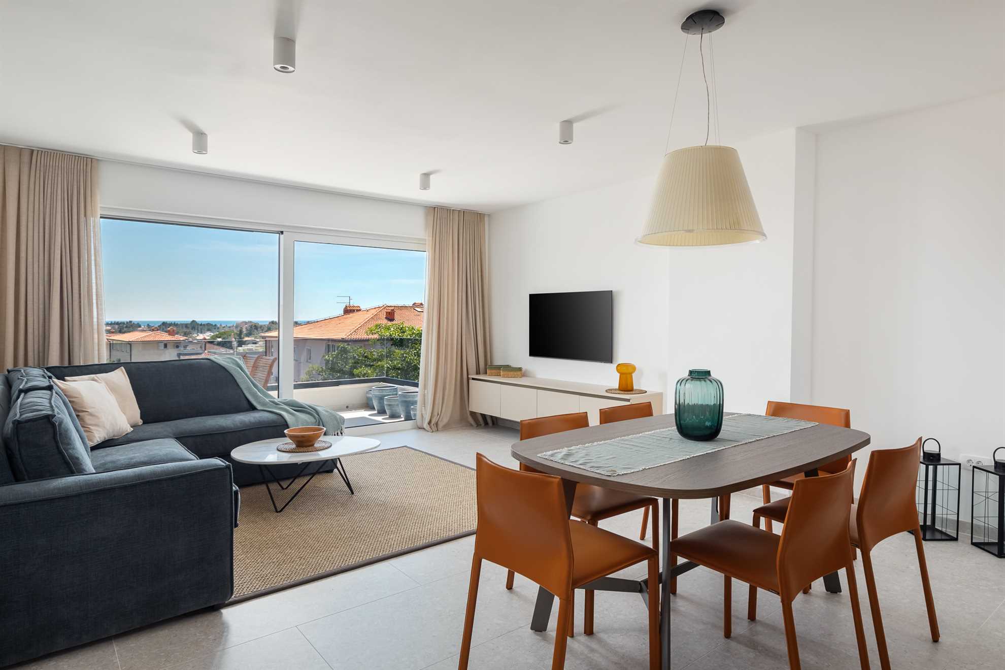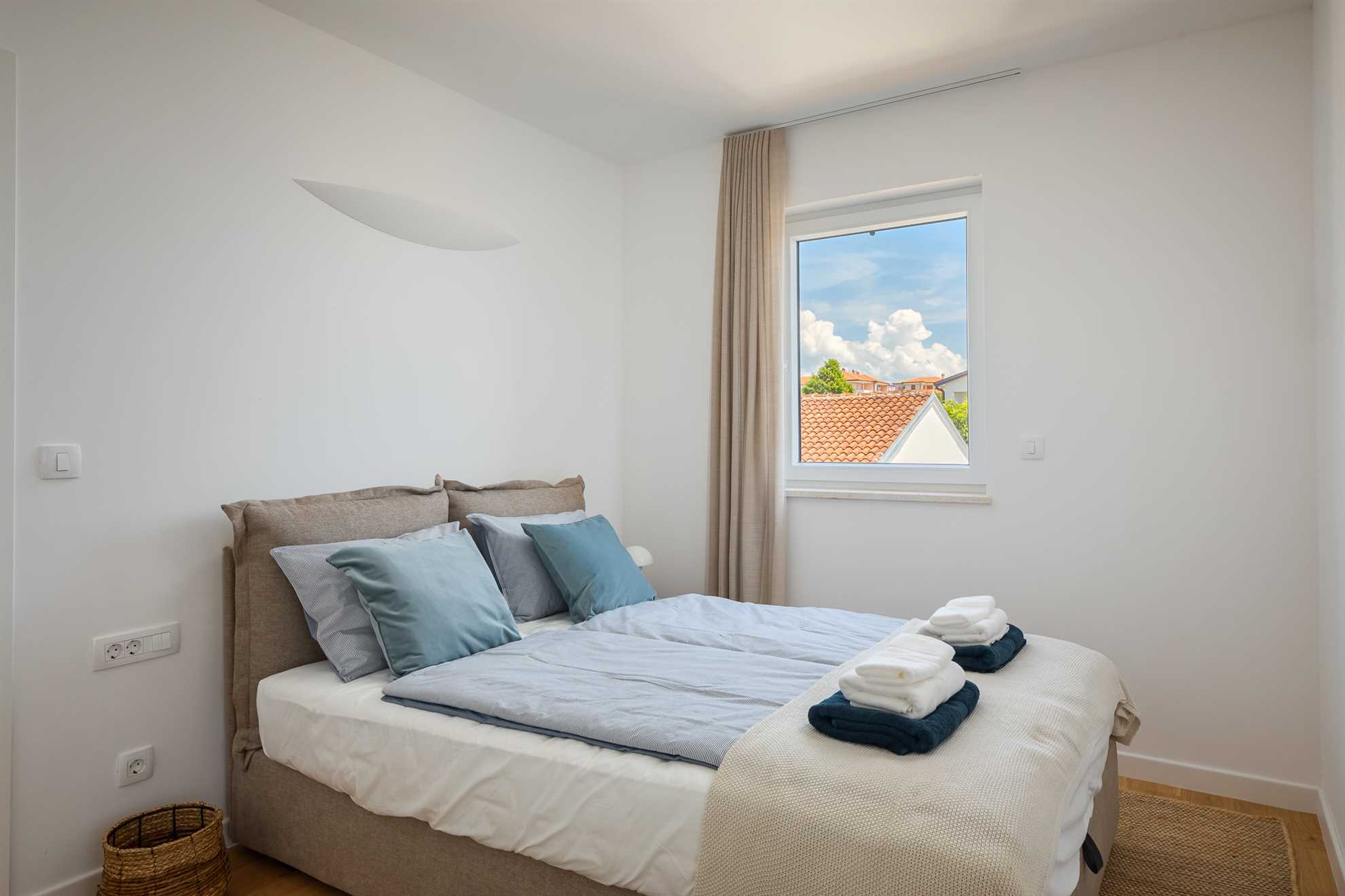 The apartment features two elegant bedrooms, two modern bathrooms, a cozy living room with a sofa bed, and a fully equipped kitchen with a dining area. A special highlight is the spacious terrace with a lovely view of the sea and the historic old town of Novigrad.