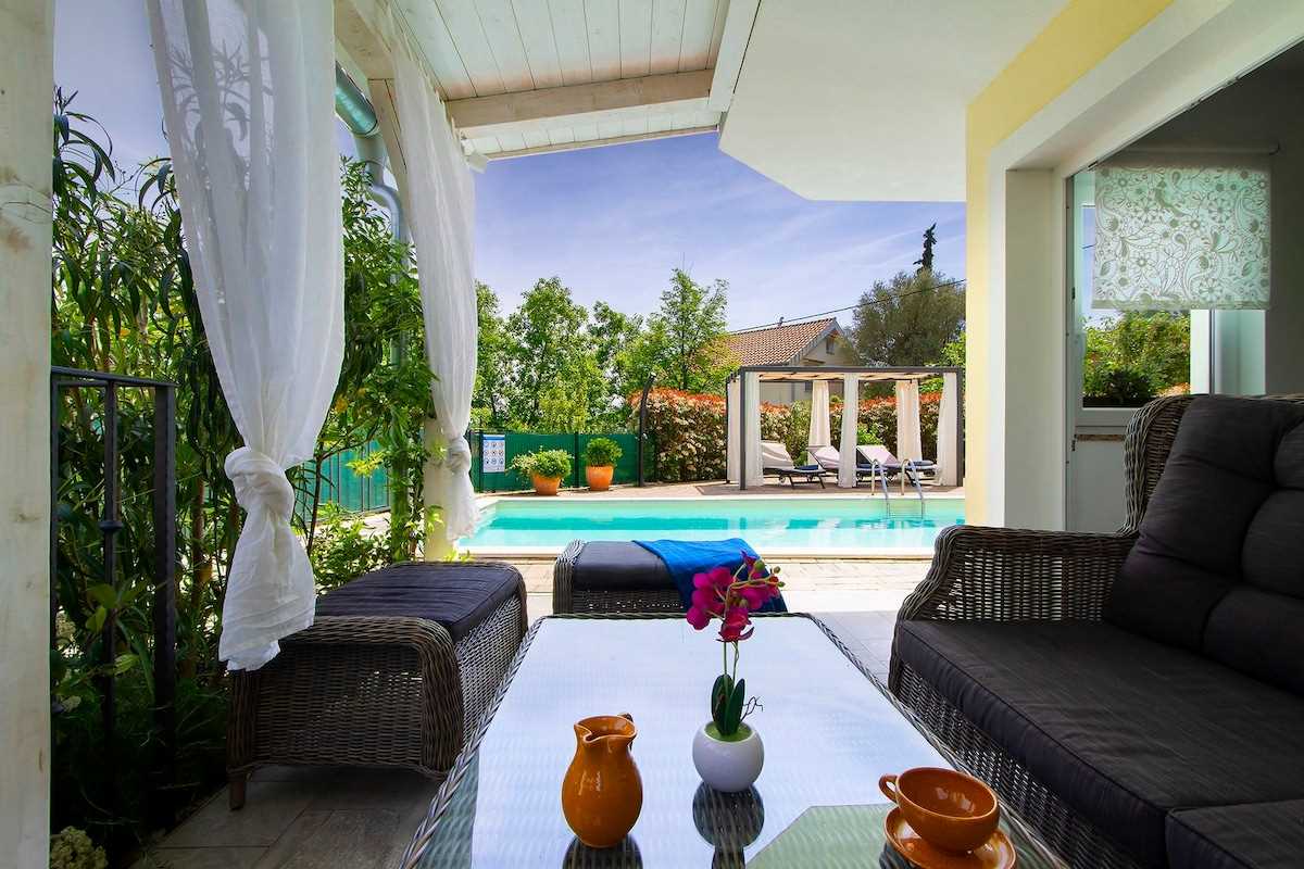 Villa Meline has an outdoor area of 460 m², where everyone will find enjoyment. Refresh yourself in the 32 m² turquoise pool or enjoy your favorite summer drink while relaxing on the comfortable loungers. You can enjoy your morning coffee in the villa's lounge area or on the balcony with a magnificent view. Take a walk through the charming garden where Mediterranean herbs and olive trees will surround you. Prepare your favorite dishes on a traditional stone grill and enjoy them in the outdoor dining area. You will also have private parking at your disposal, so you don't have to worry about the safety of your vehicles.