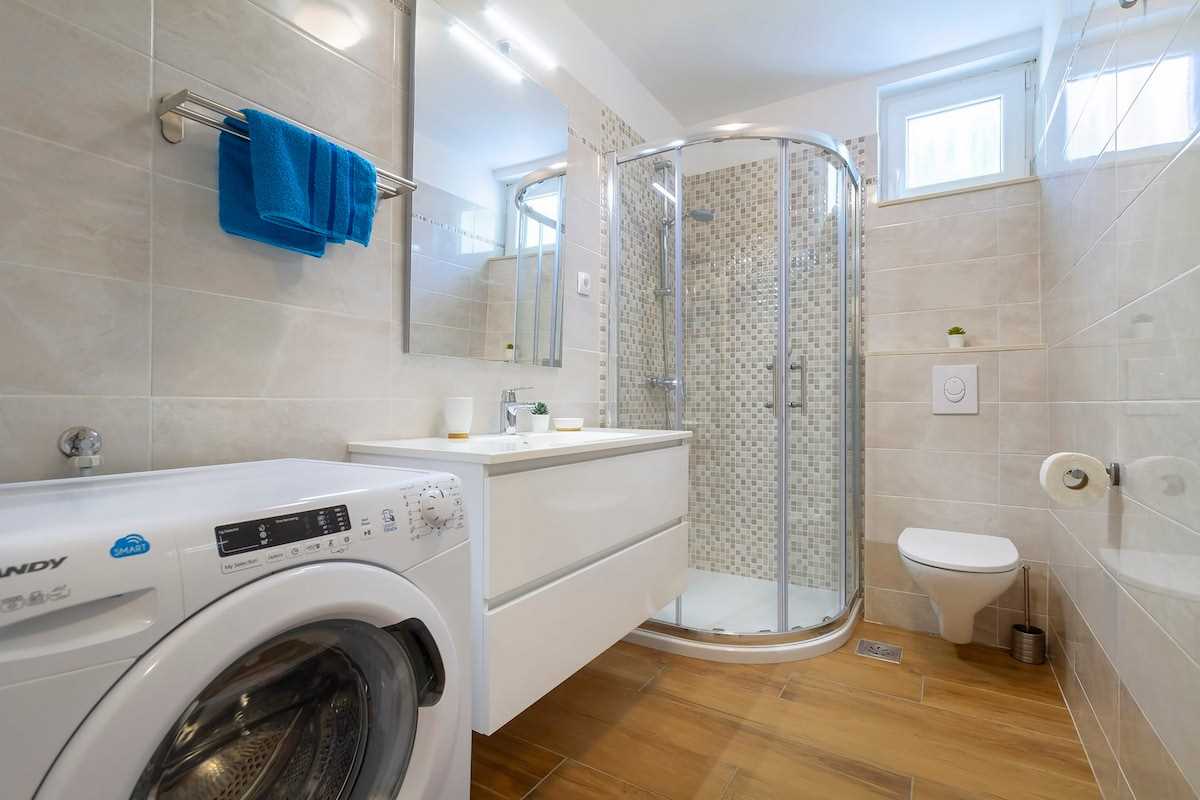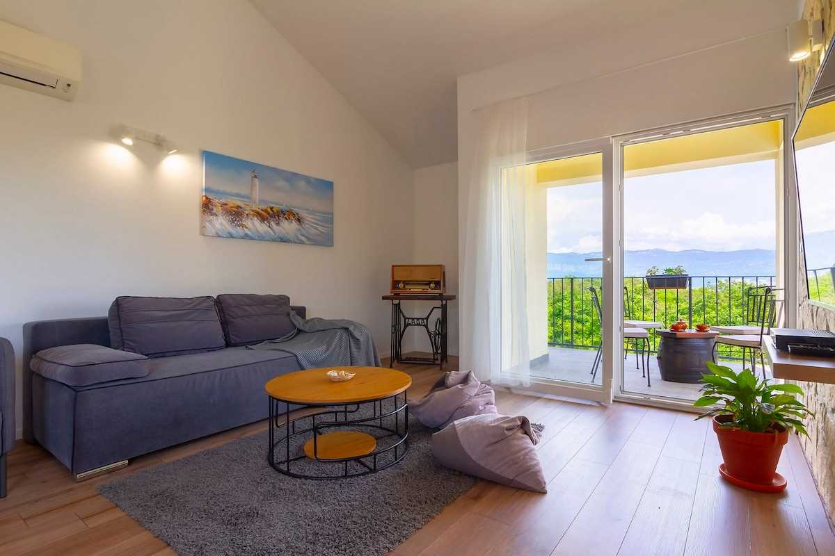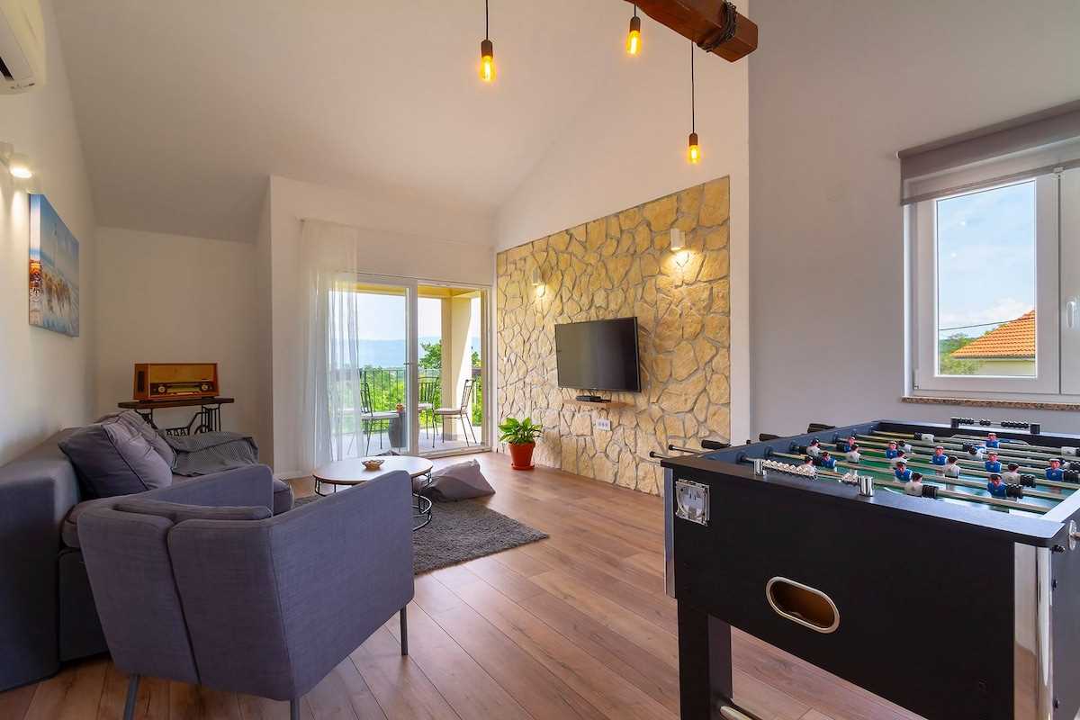 Villa Meline consists of 2 separate units connected by an external staircase and can accommodate up to 8 guests, including children. On the first floor of the villa, there is a bathroom and a fully equipped kitchen with a dining room from which you can access the beautiful outdoor terrace. On the second floor of the villa, there are 2 bedrooms with double beds, a spacious living area with a kitchen and dining area, as well as a large bathroom. On the second floor, there are 2 bedrooms, also with double beds, and a bathroom. On this floor, you will definitely be delighted by the entertainment room, where you can play table soccer with your fellow travelers or try your hand at darts. The entertainment room also features an Orbitrek exercise machine, offering a perfect space for both fun and relaxation. Relax on the spacious gray sofa, watch your favorite movie on the satellite TV, or enjoy the enchanting view of the Crikvenica Riviera from the balcony, which will take your breath away!