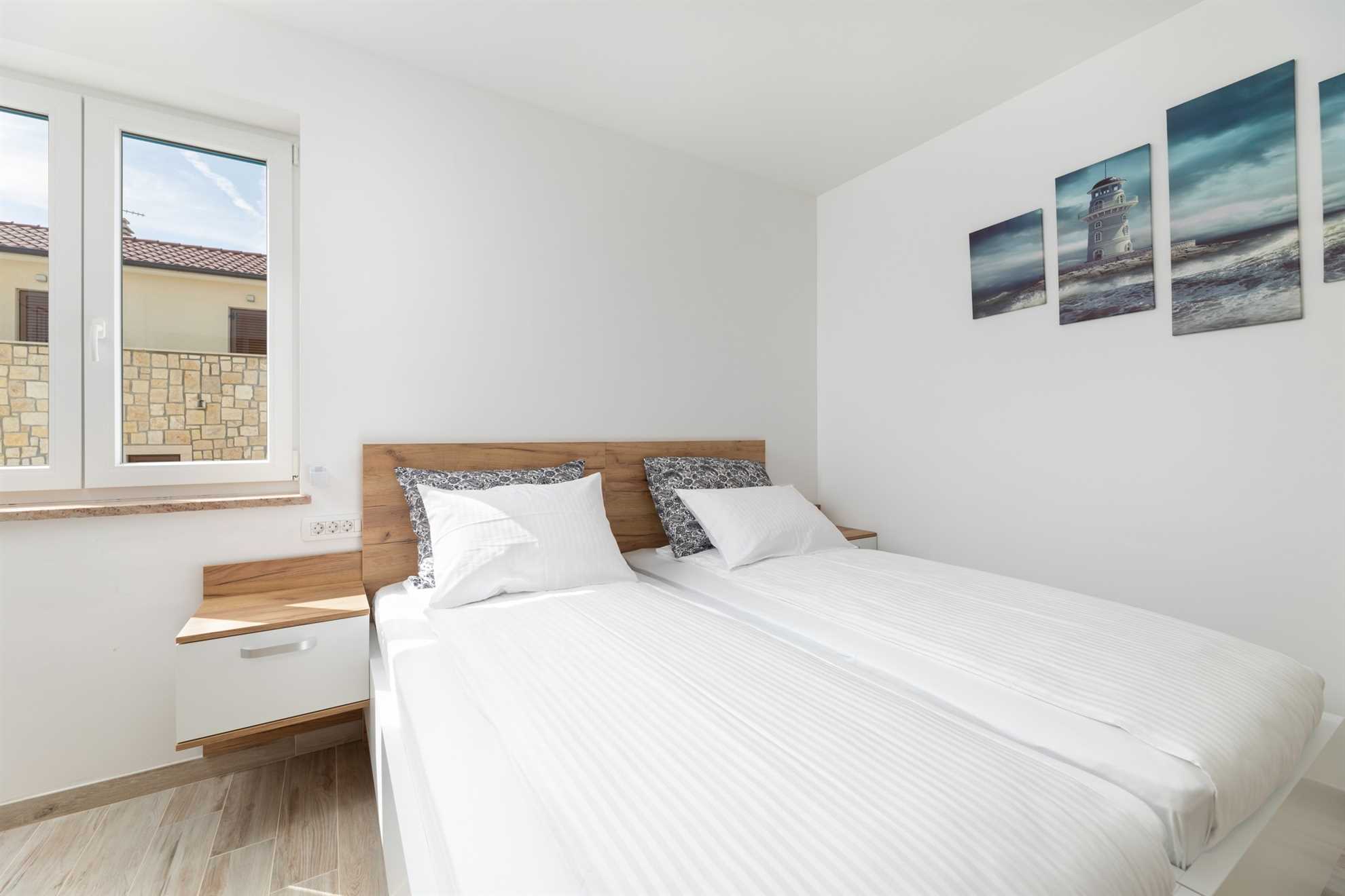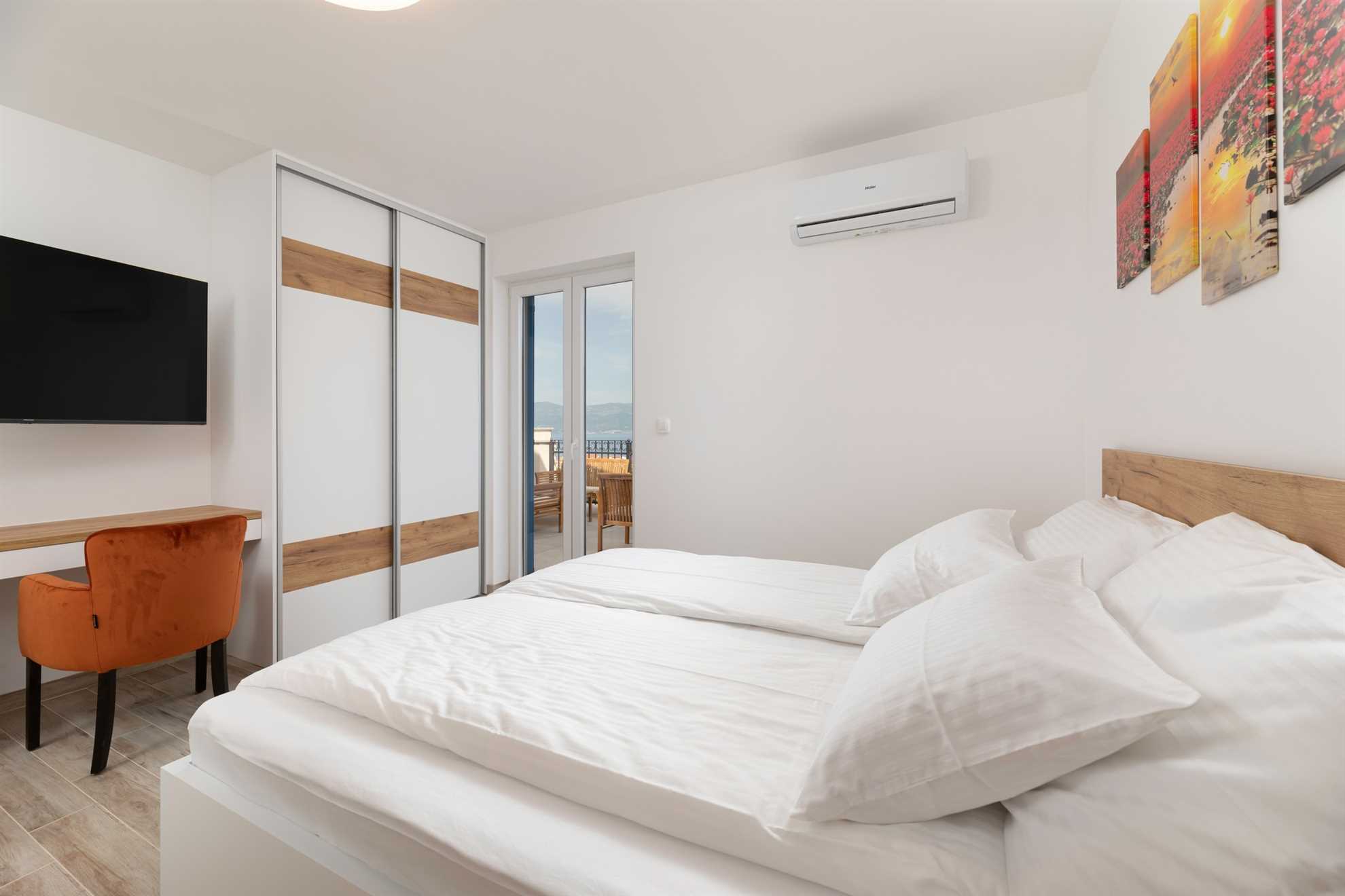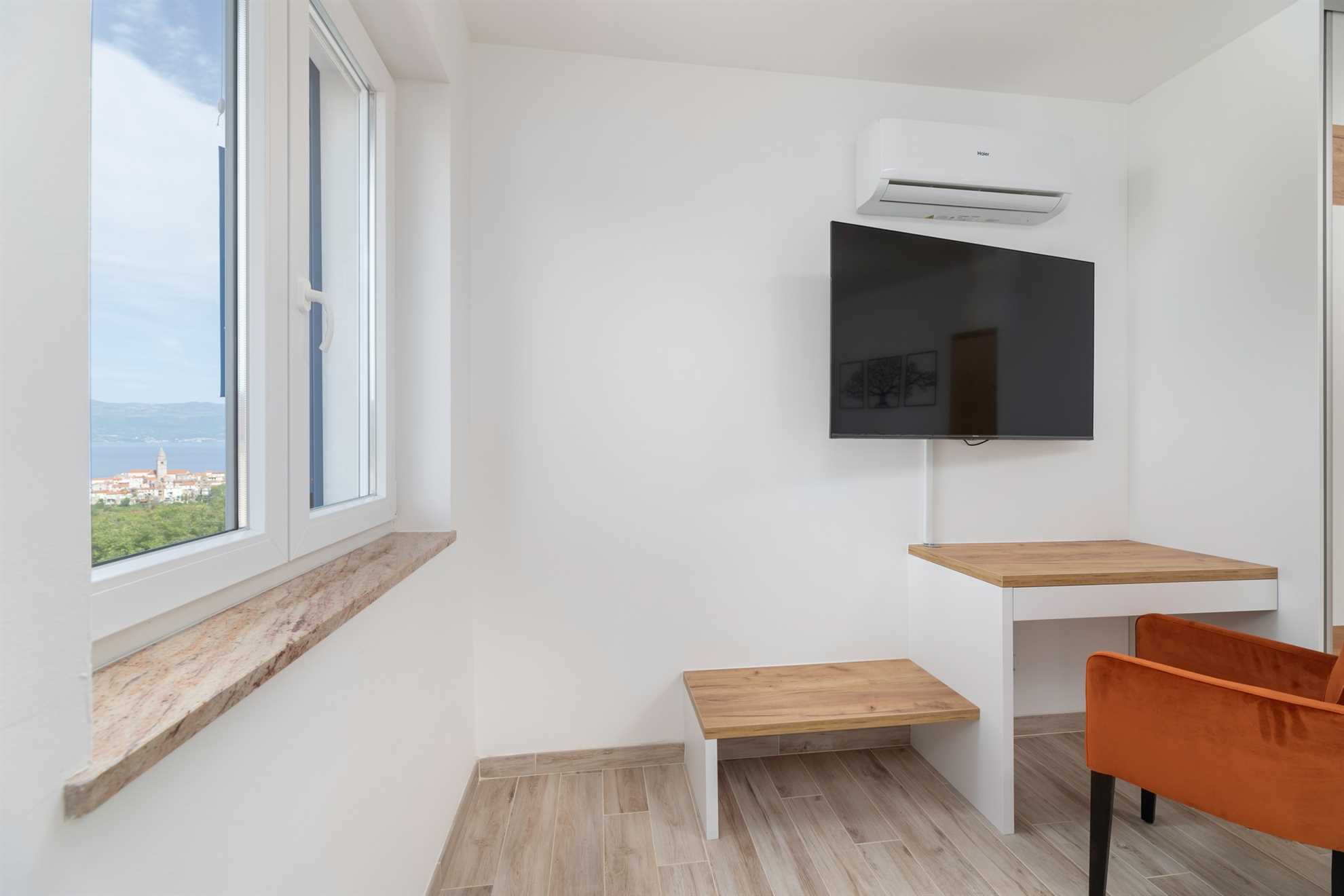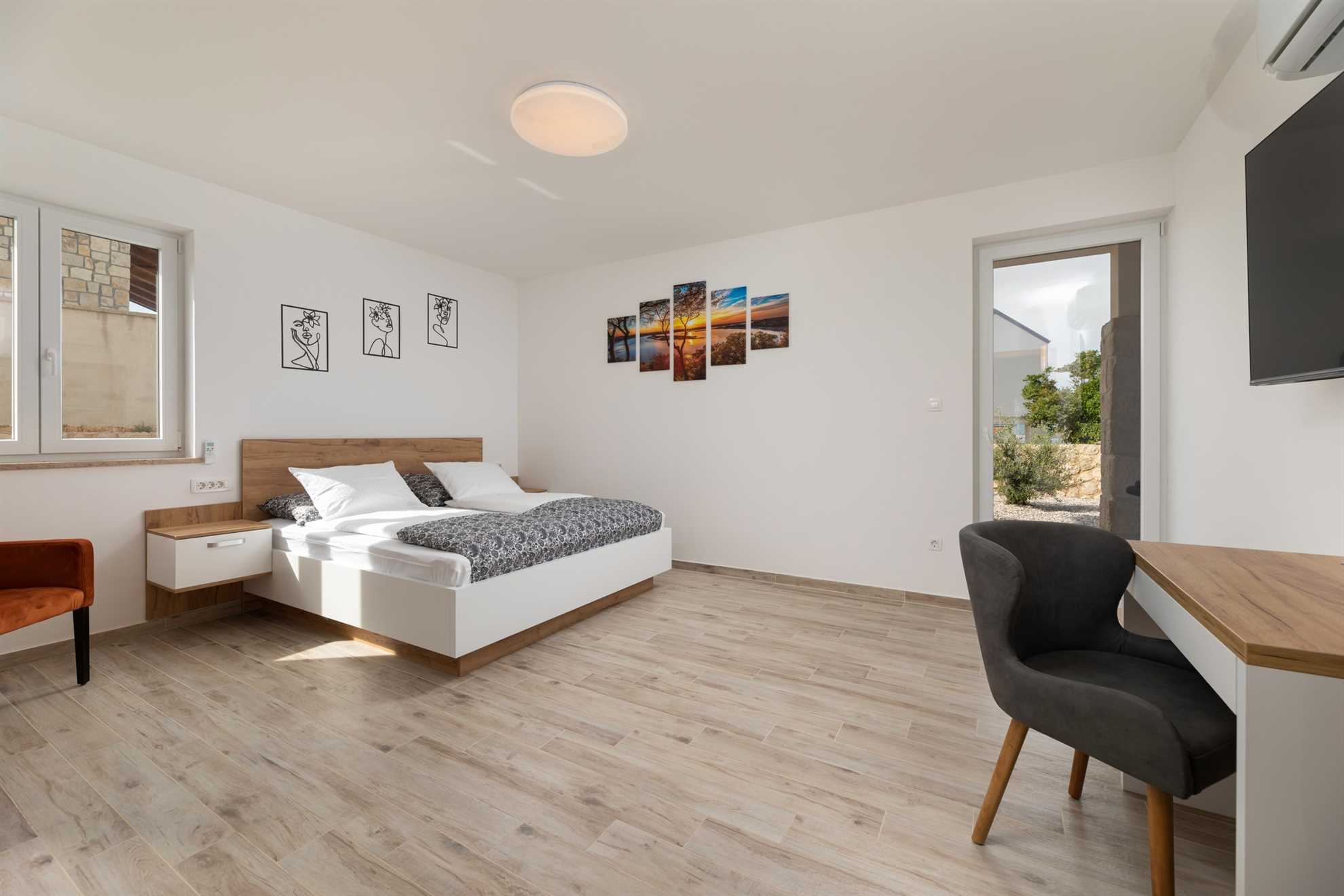 Upstairs, you will find three elegantly designed bedrooms, each with its own en-suite bathroom. Two of the bedrooms have direct access to a private terrace with seating and spectacular views of the sea and the town of Vrbnik – the perfect spot for morning coffee or romantic evenings with a glass of local wine. All rooms are furnished with double beds, TV, air conditioning, and Wi-Fi. In one of the bedrooms, the double bed can be separated and prepared as two single beds, providing additional flexibility for guests. All bathrooms are stocked with soft bed linen and towels for all guests.