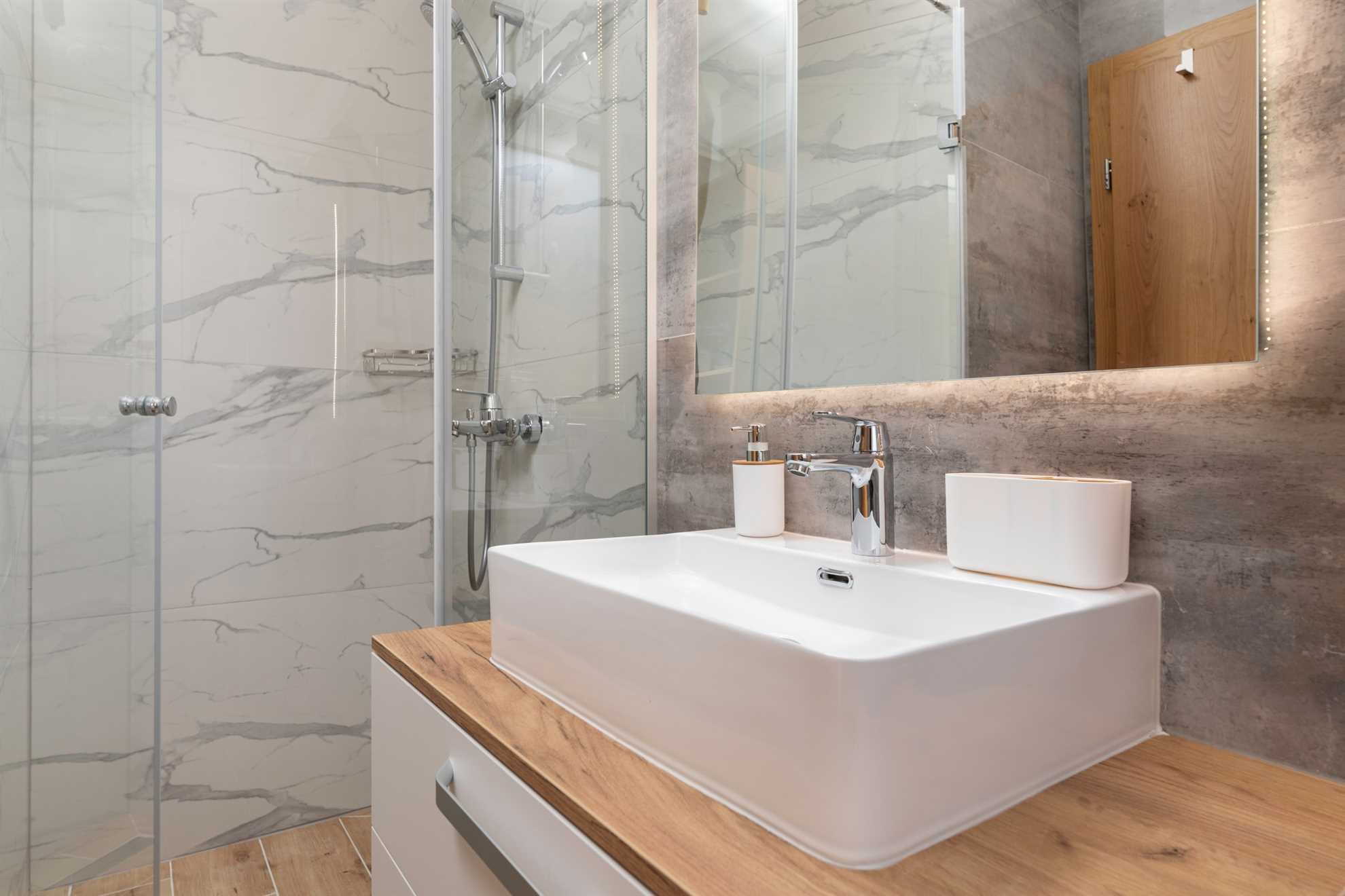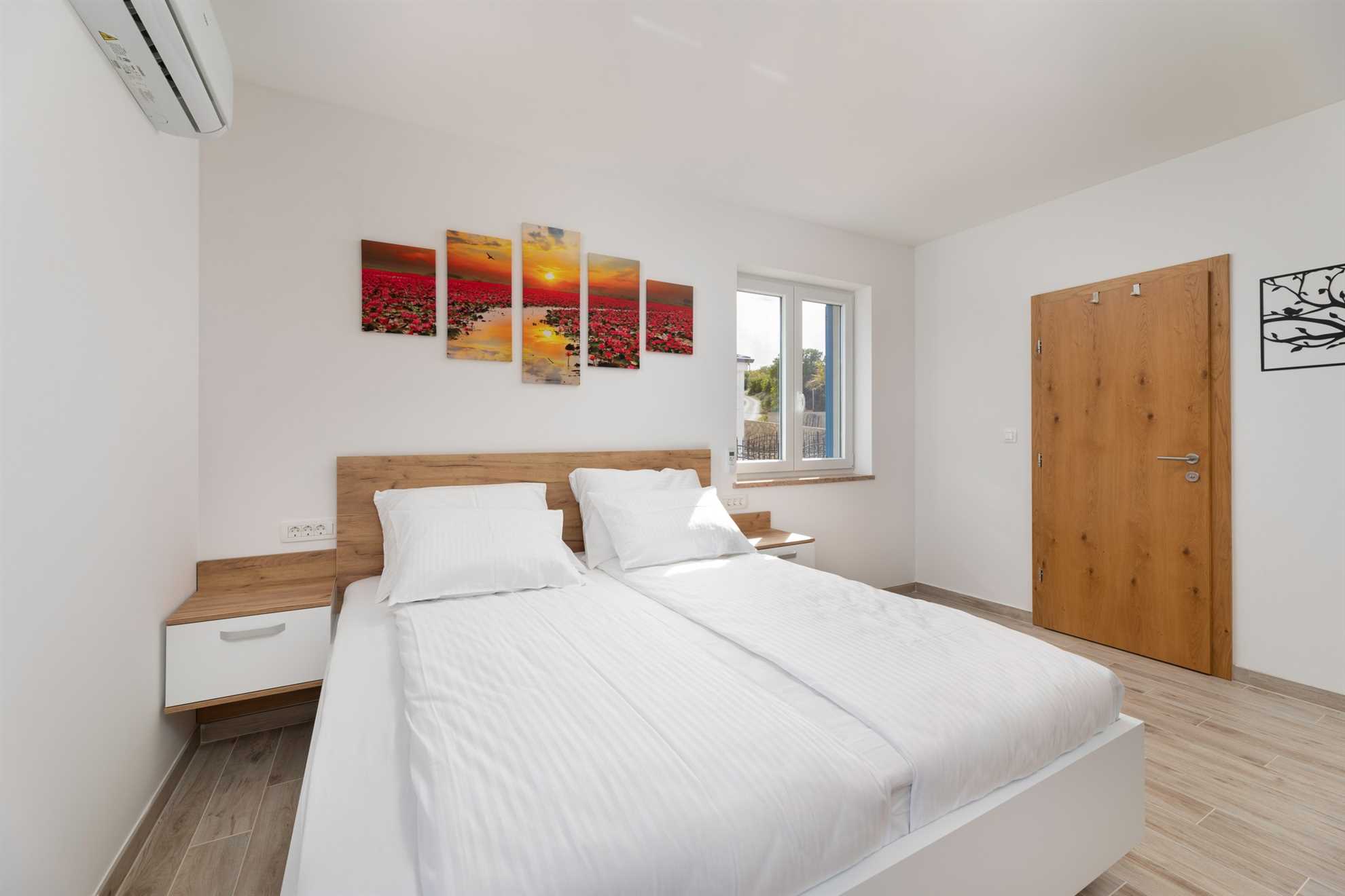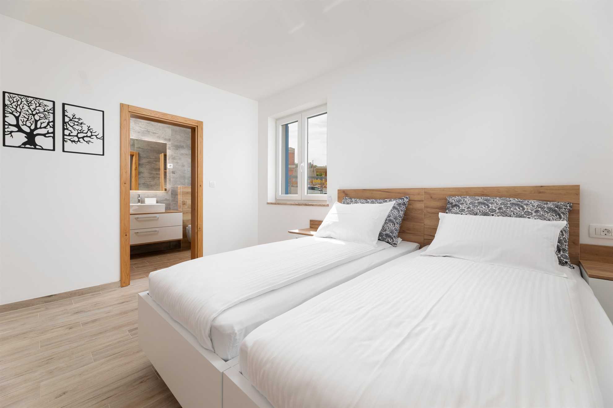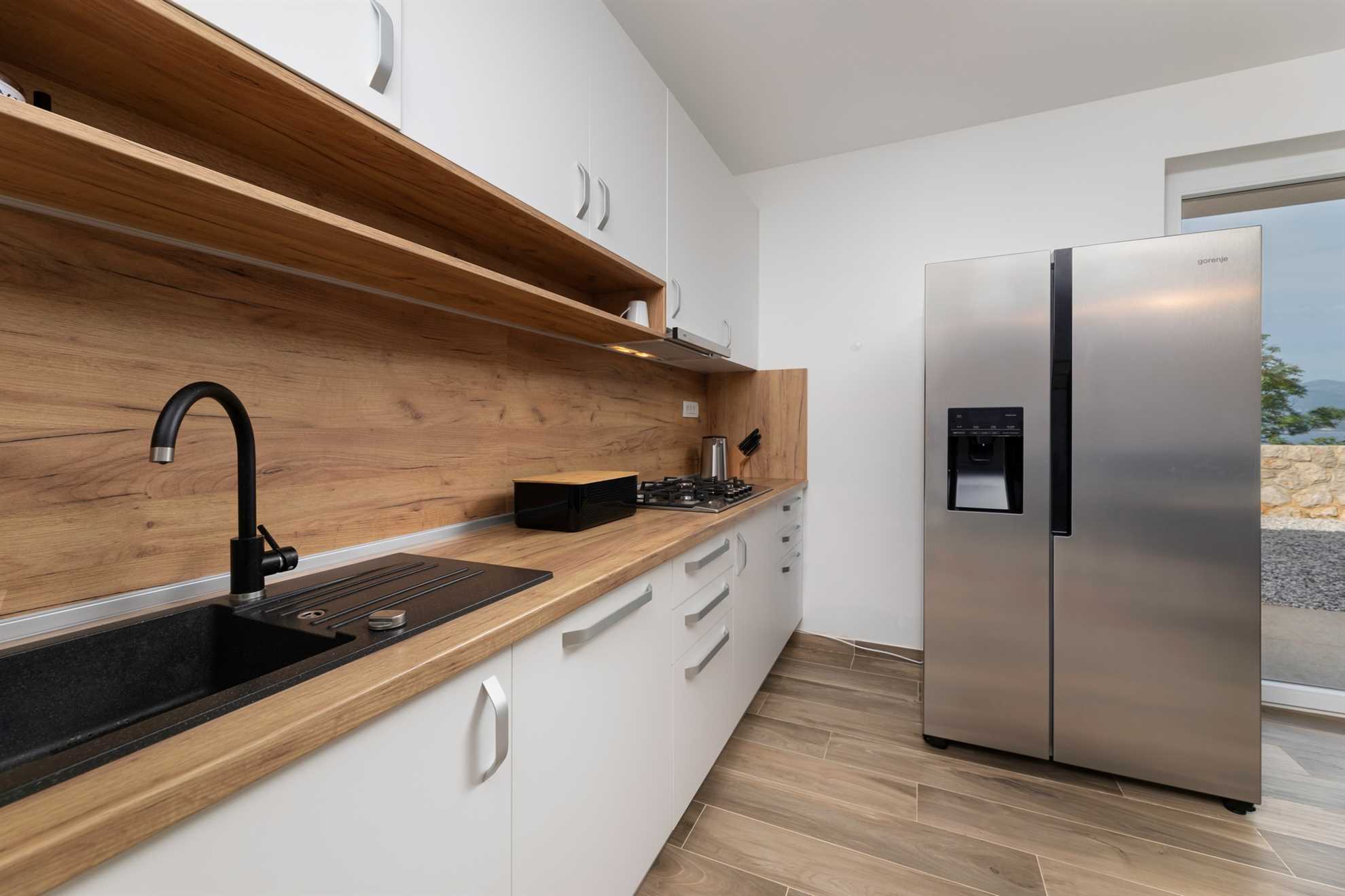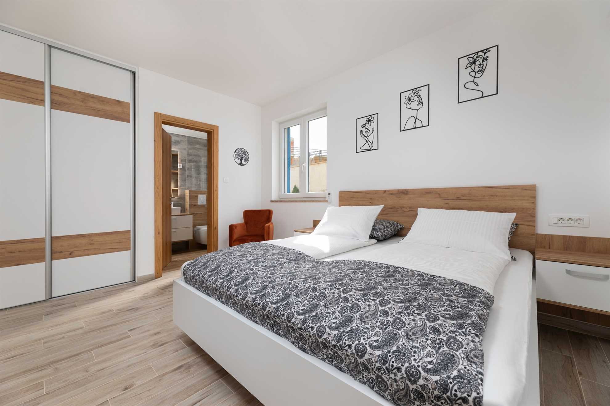 Upstairs, you will find three elegantly designed bedrooms, each with its own en-suite bathroom. Two of the bedrooms have direct access to a private terrace with seating and spectacular views of the sea and the town of Vrbnik – the perfect spot for morning coffee or romantic evenings with a glass of local wine. All rooms are furnished with double beds, TV, air conditioning, and Wi-Fi. In one of the bedrooms, the double bed can be separated and prepared as two single beds, providing additional flexibility for guests. All bathrooms are stocked with soft bed linen and towels for all guests.