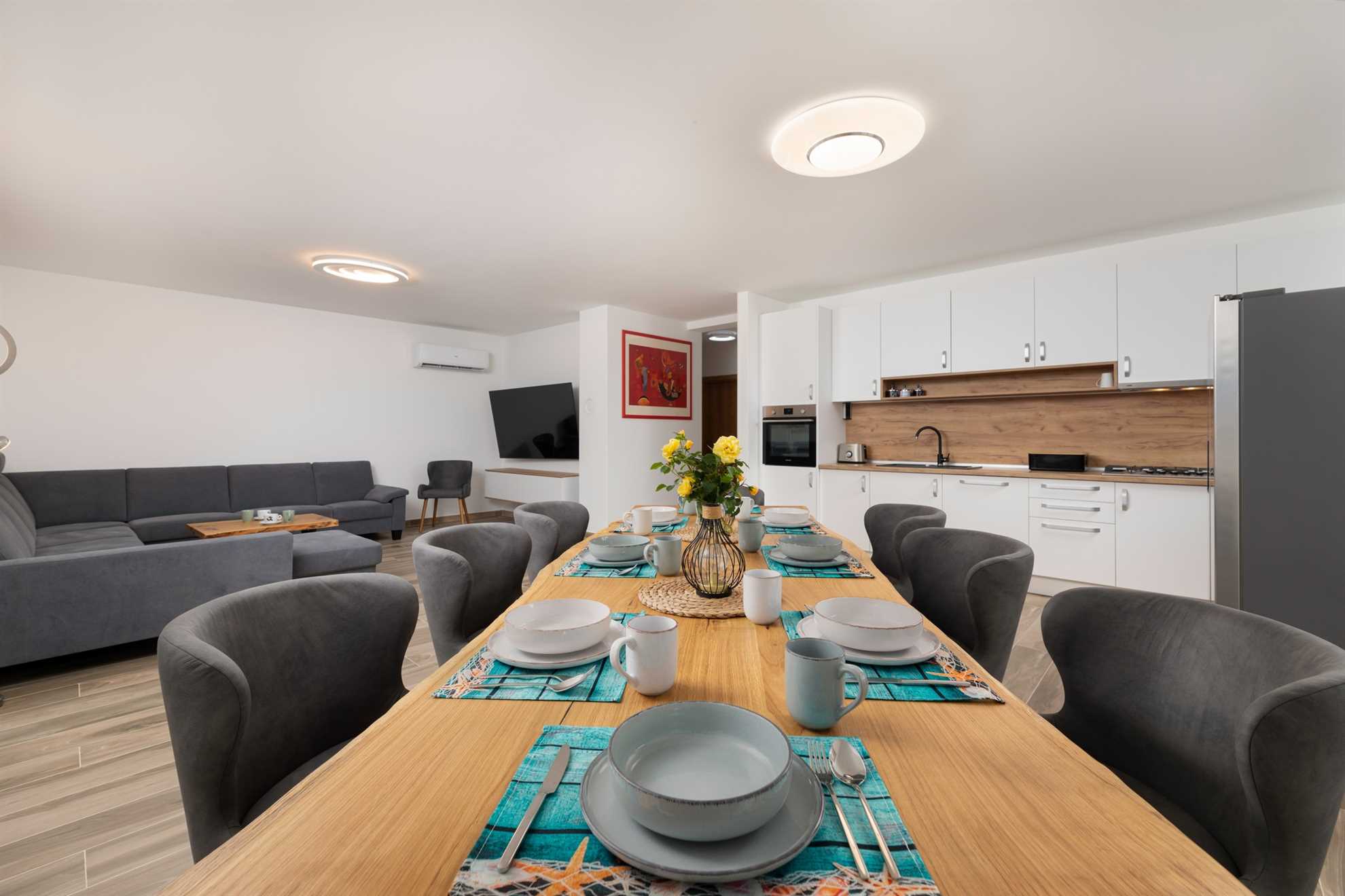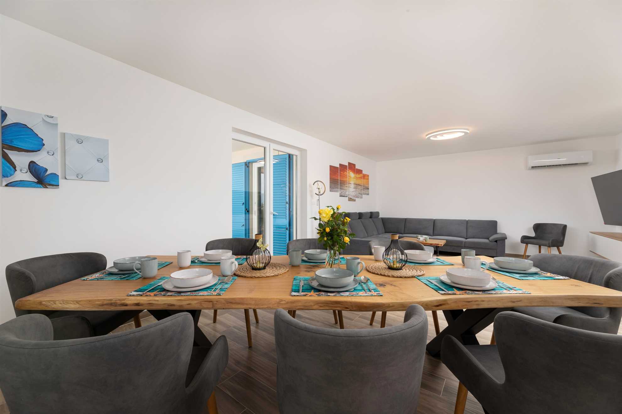 Inside, Villa Maja impresses with open, bright spaces and a tastefully curated interior in warm natural tones. The ground floor living area offers a cozy setting with direct access to the terrace and pool, creating a seamless flow between indoor and outdoor living. The elegant lounge with a modern sofa connects to the dining area with a large table for eight guests and a fully equipped modern kitchen – perfect for culinary adventures.