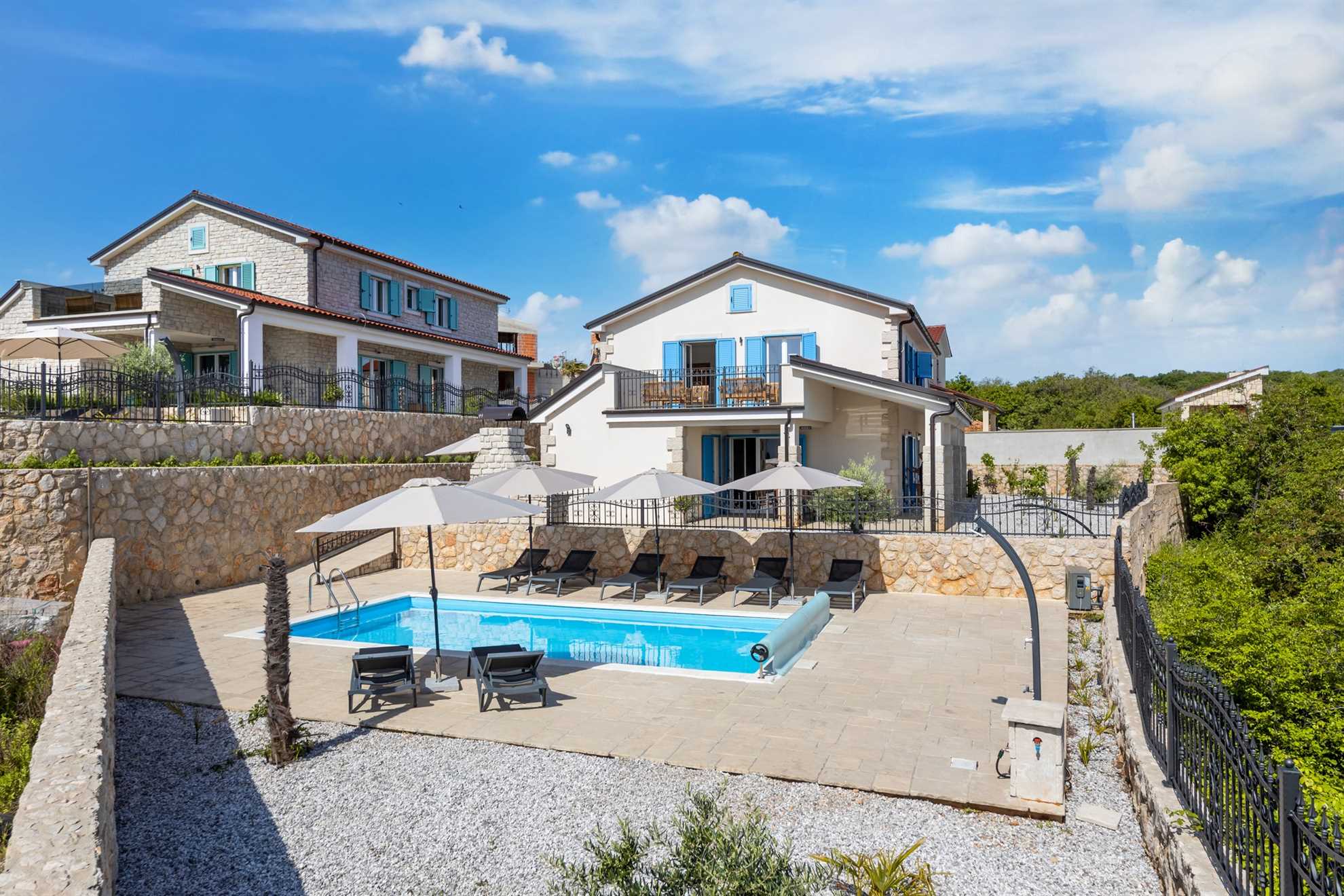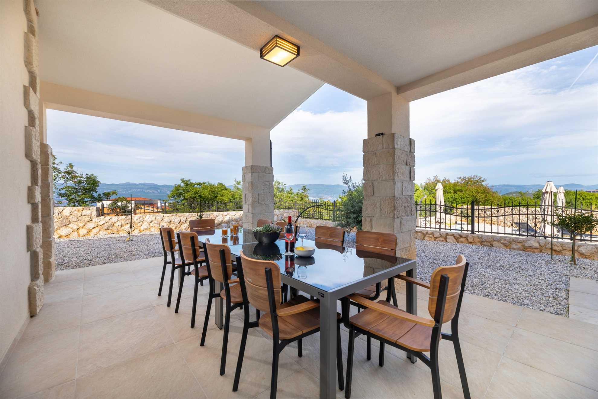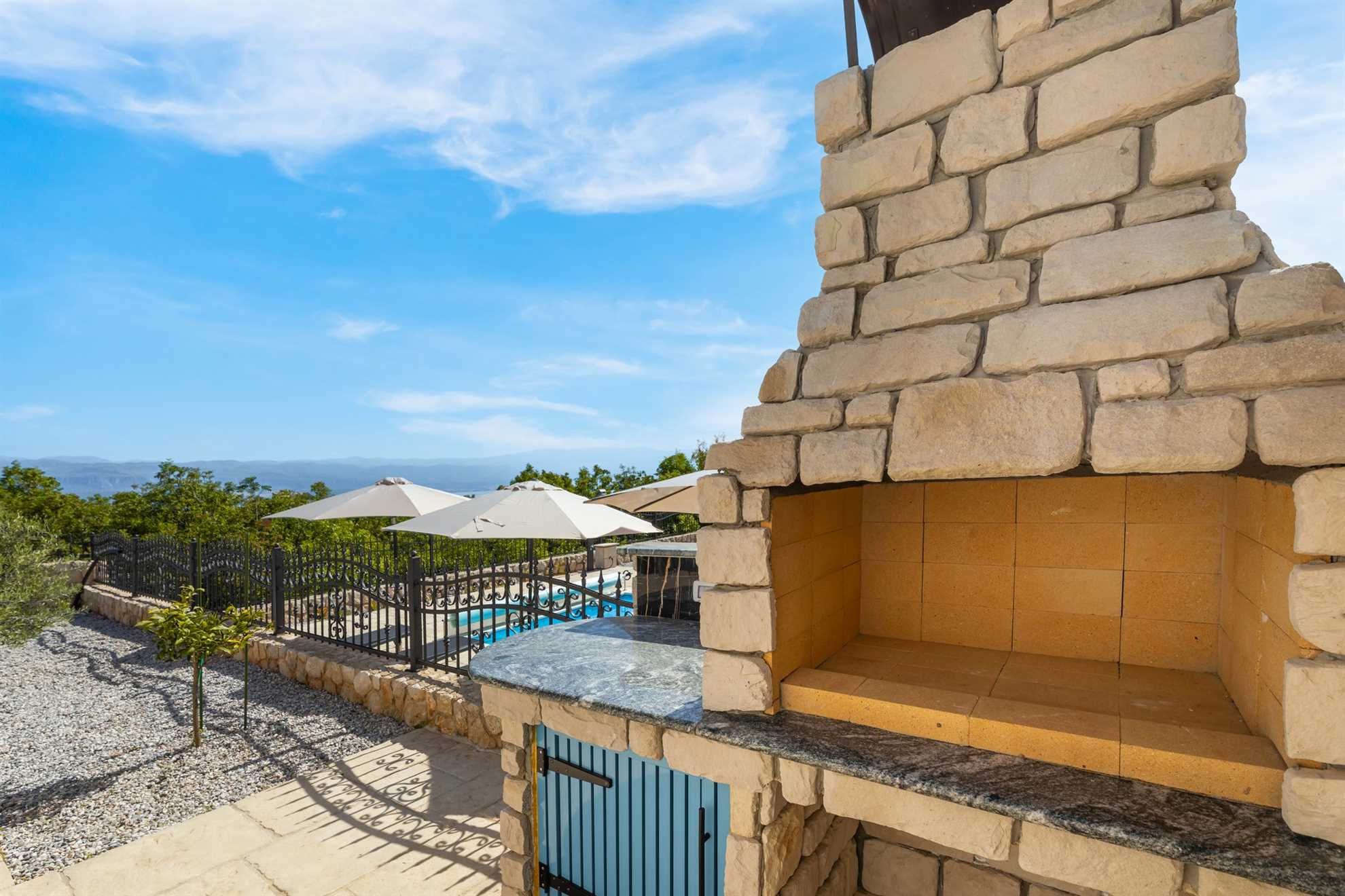 For culinary delights, a covered terrace with a rustic stone grill awaits you by the pool, perfect for preparing fresh seafood, meat specialties, or local seasonal dishes. Next to the grill, a spacious al fresco dining area invites you to linger over long dinners by candlelight and a glass of chilled wine, set against the backdrop of a spectacular sunset. The entire exterior combines modern touches with traditional stone elements, creating a warm, elegant ambiance and a sense of total privacy.